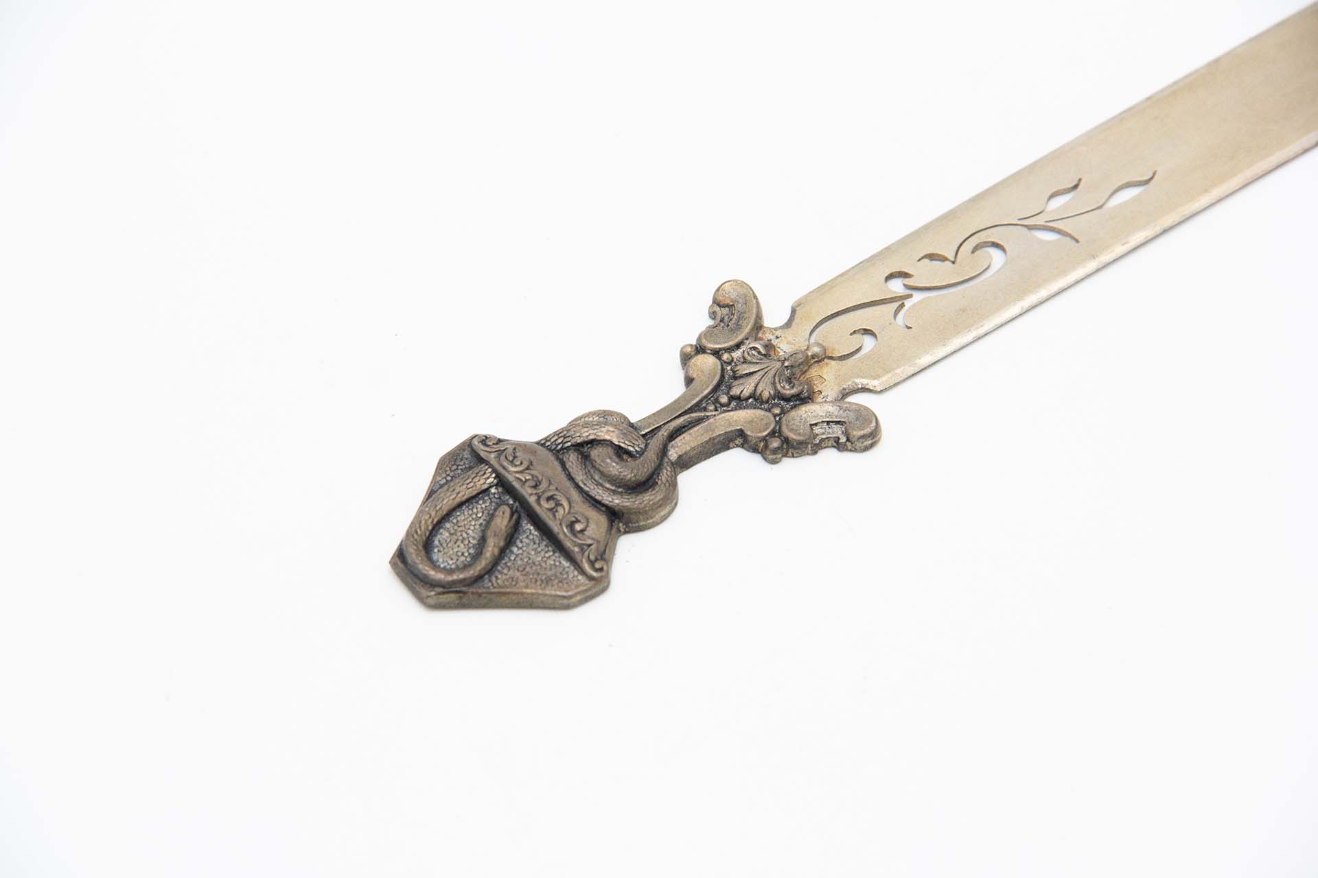 • Descrição: Abre cartas de prata recortado na lâmina e com relevos de serpente no cabo, simbolo de Farmácia.