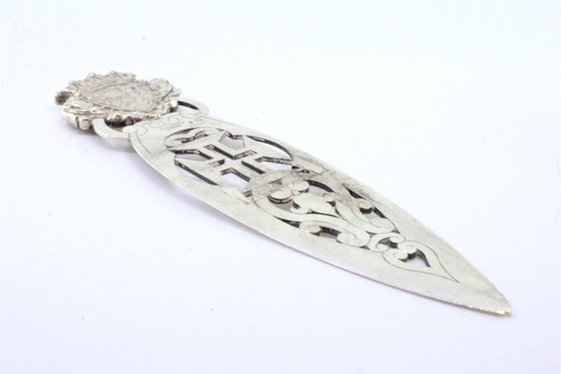 Abre cartas em prata recortada e brasão armoriado com relevos no cimo.