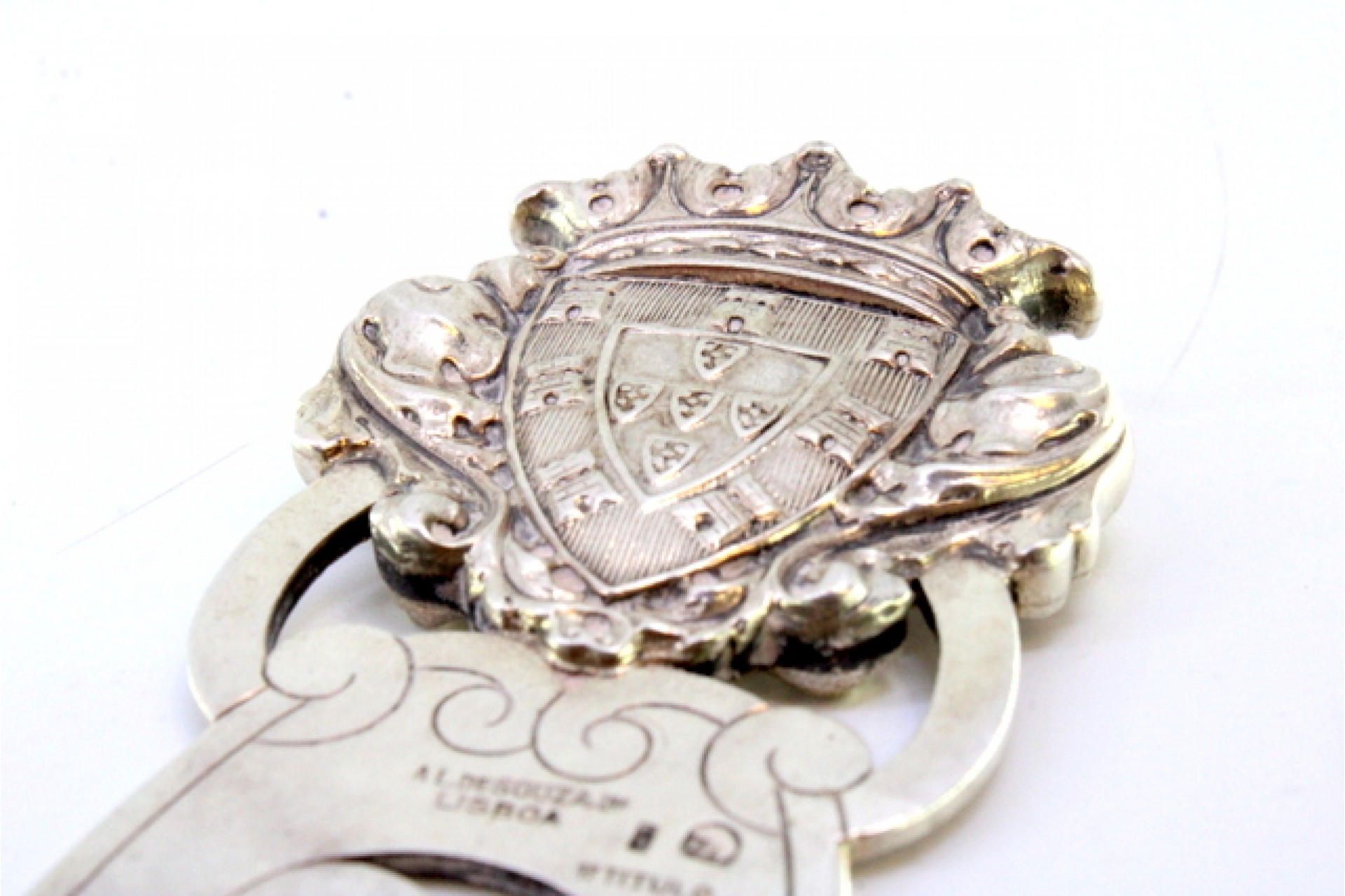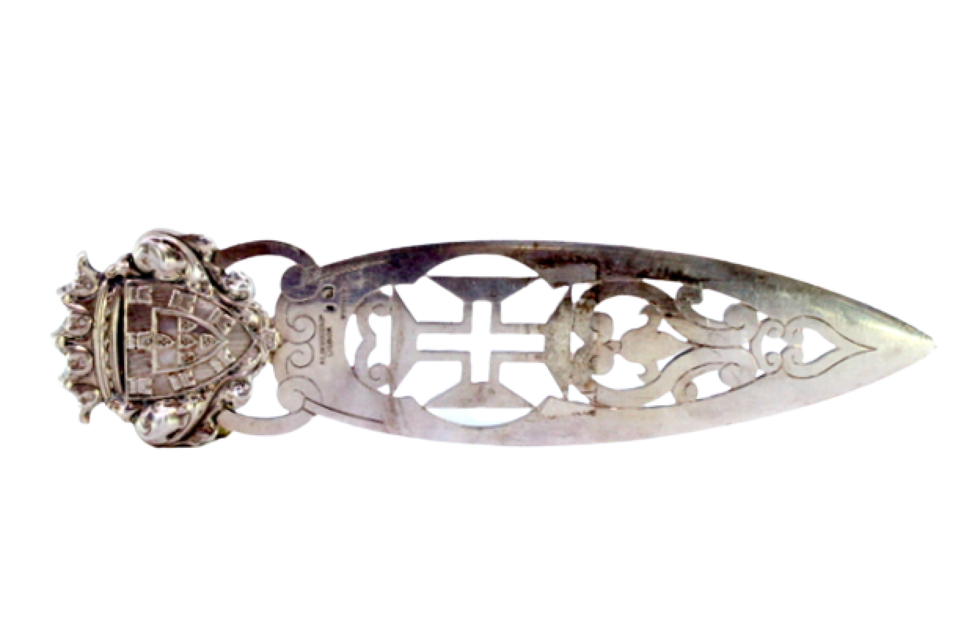 • Descrição: Abre cartas em prata recortada e brasão armoriado com relevos no cimo.