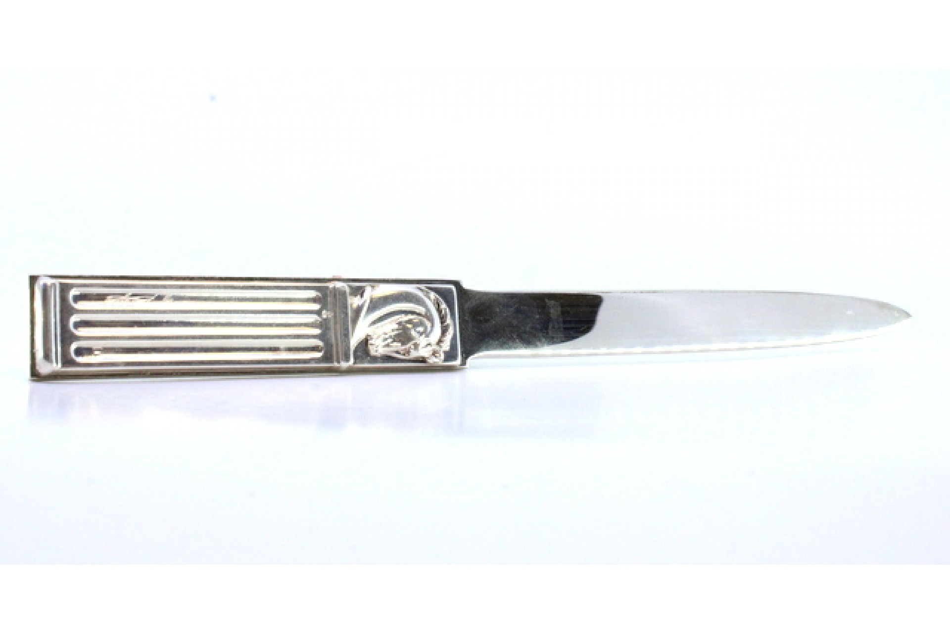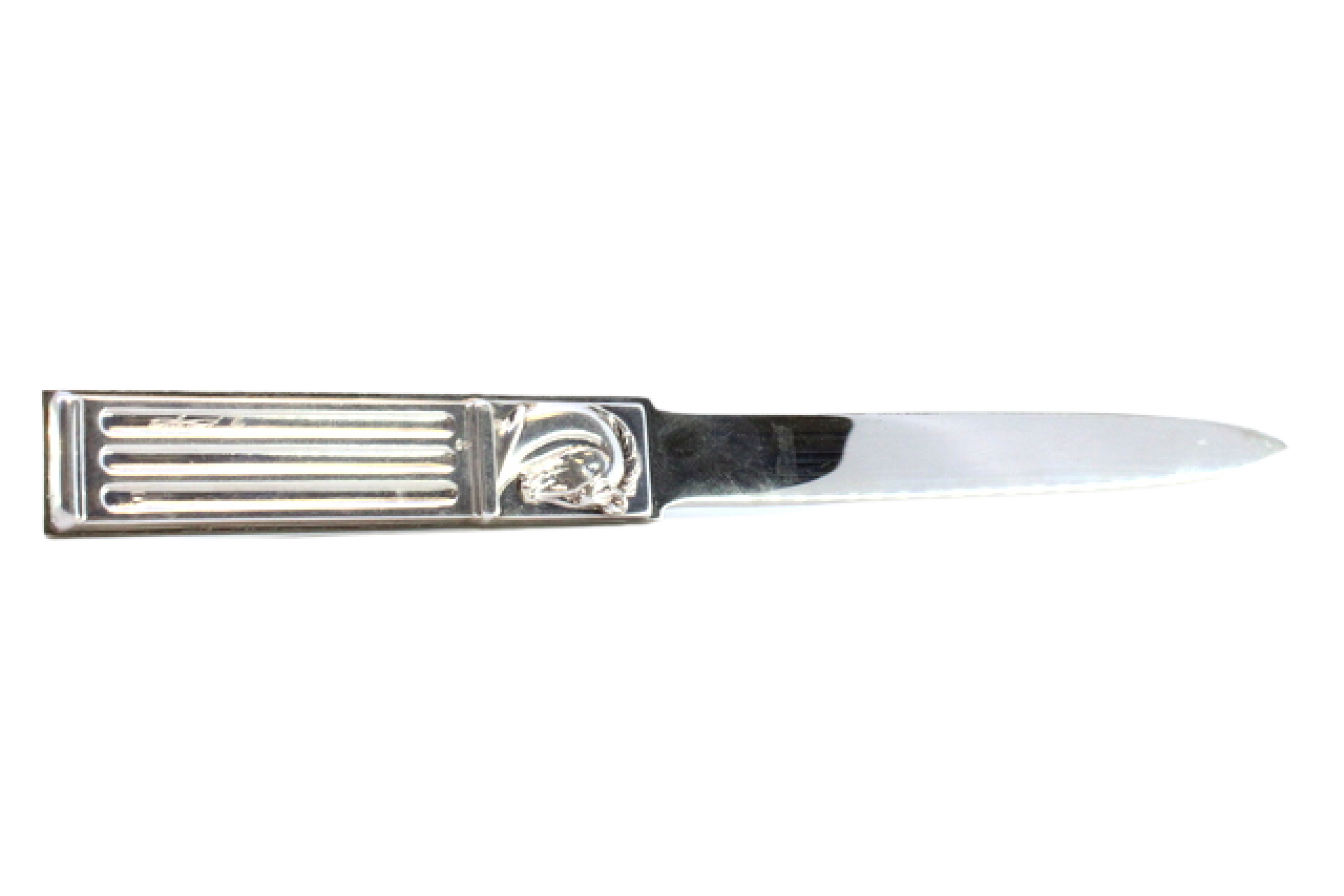 Abre cartas com cabo coberto por prata com cabeças de cavalos e lâmina em aço.