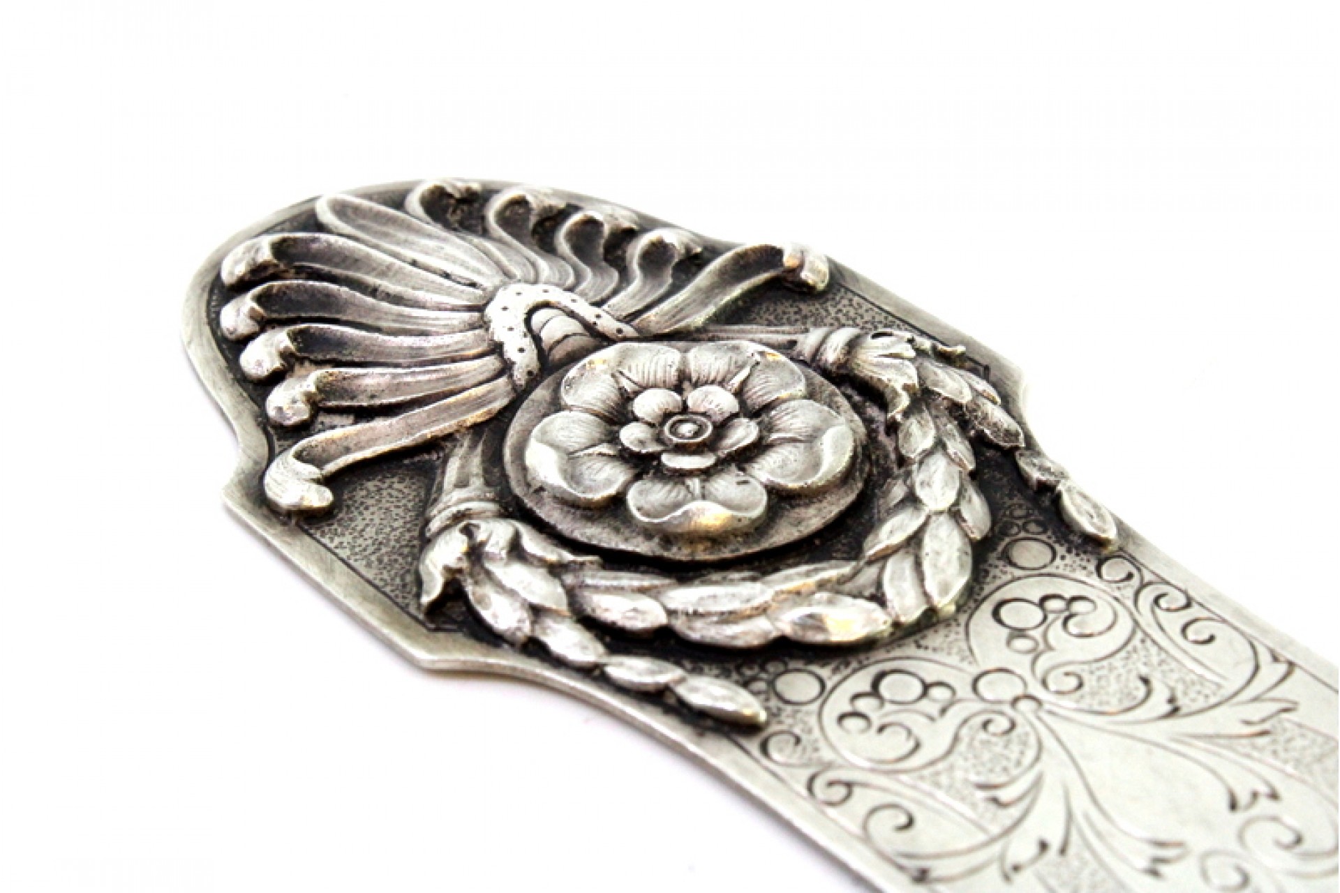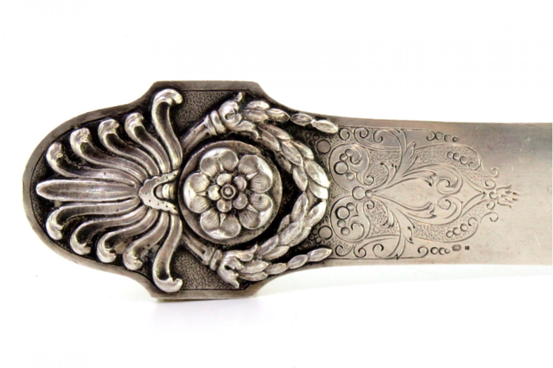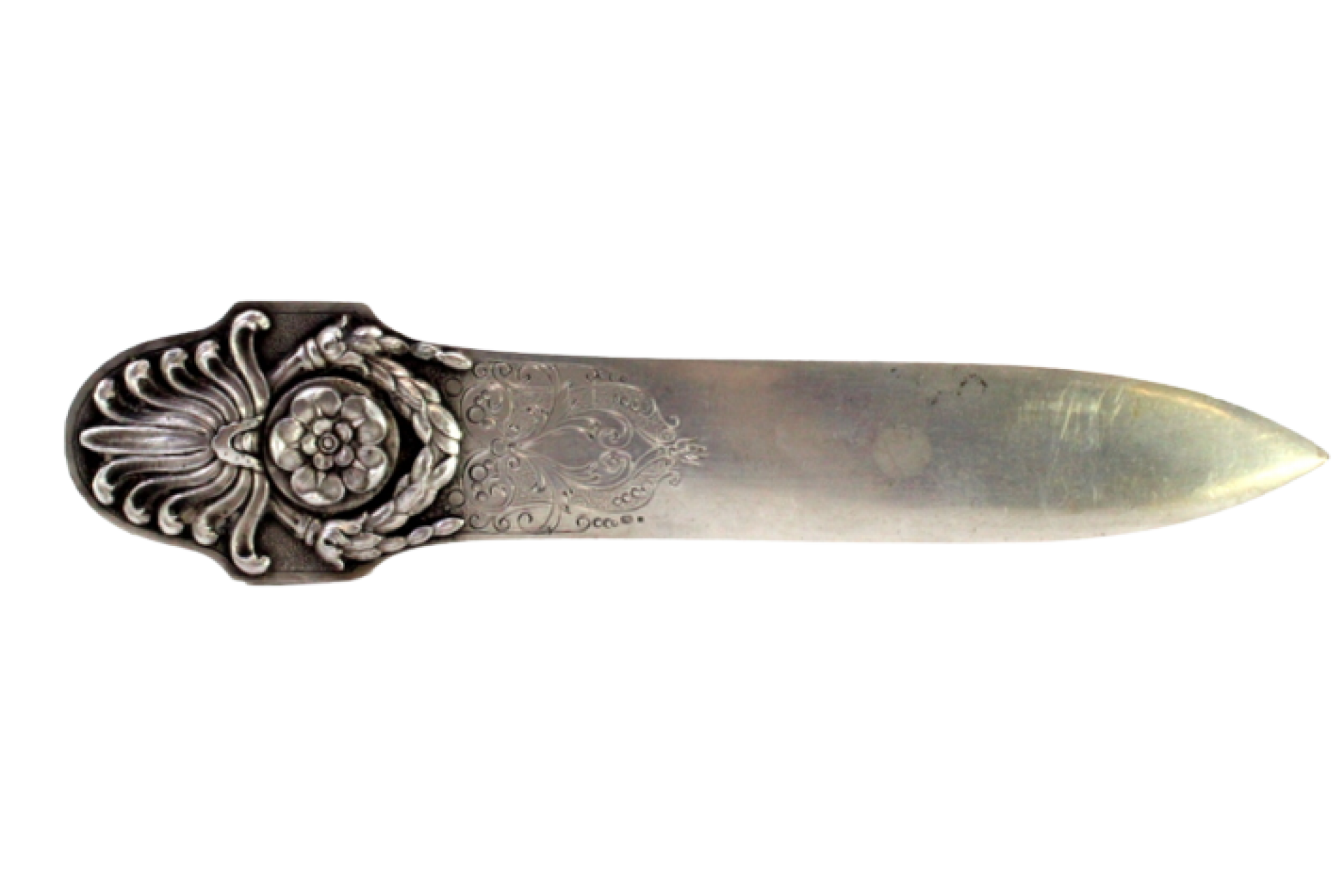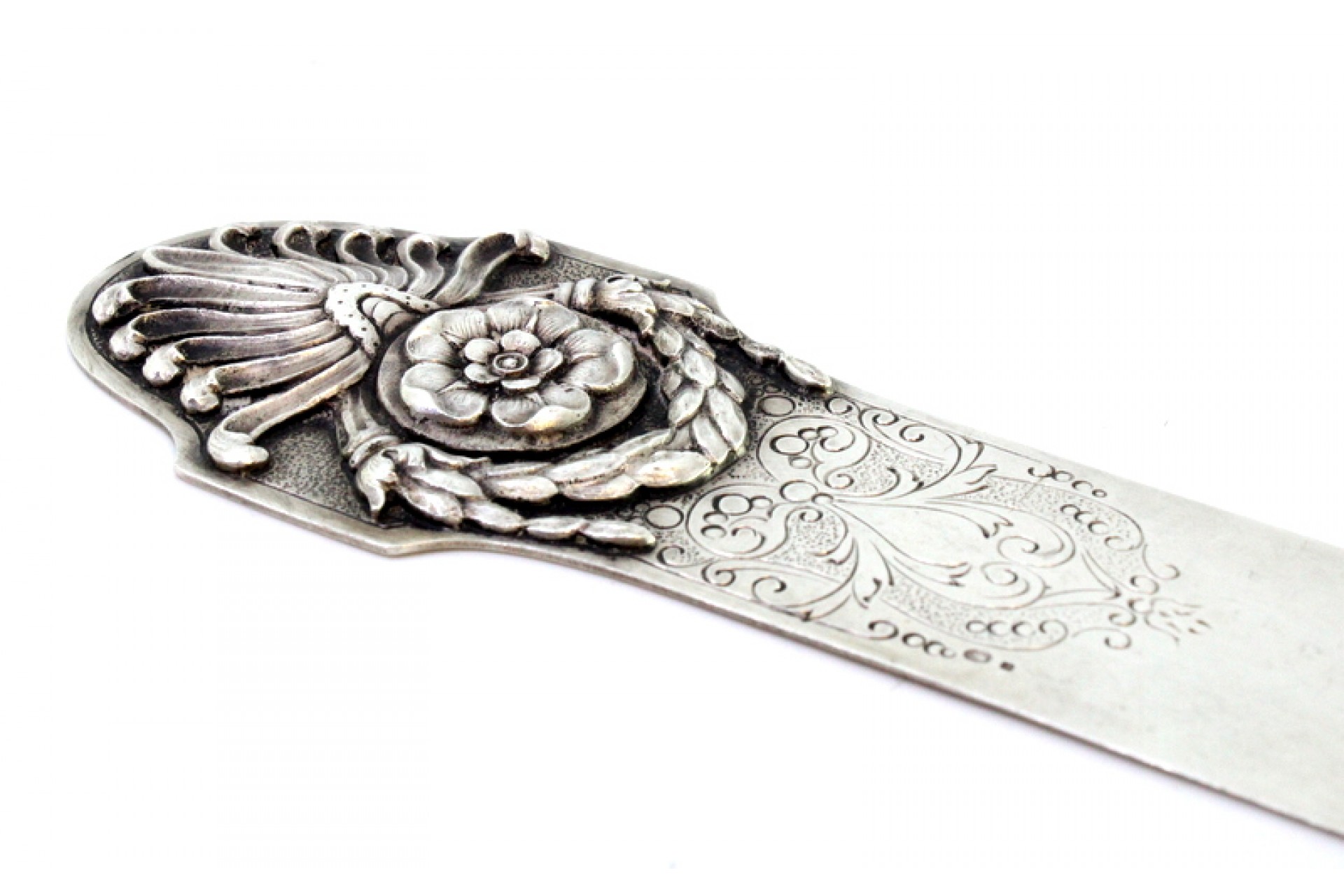 • Descrição: Abre cartas em prata com grinaldas e motivos florais relevados no cabo, gravados na lâmina.