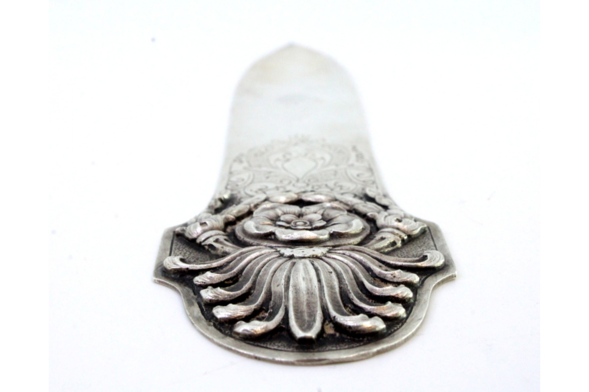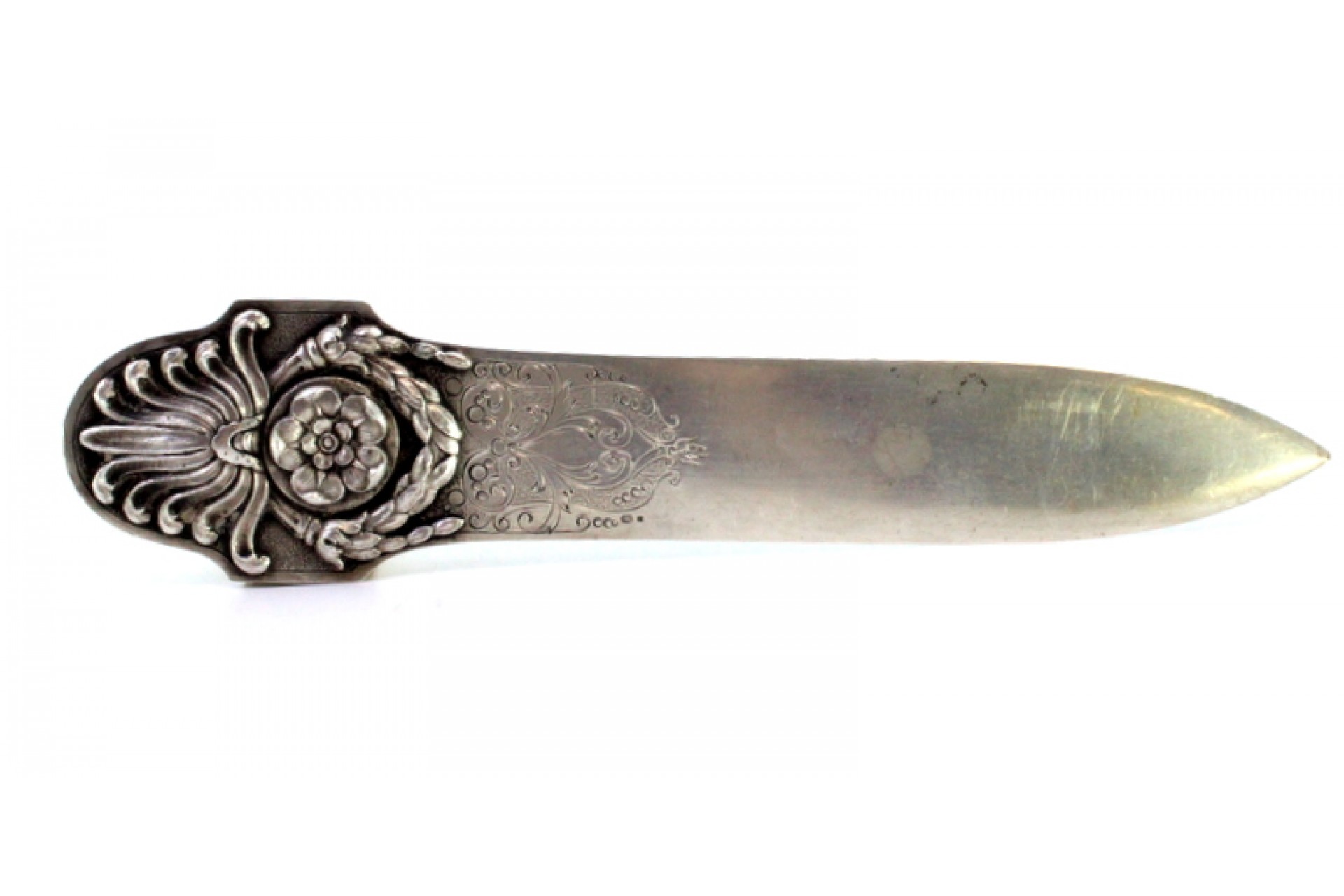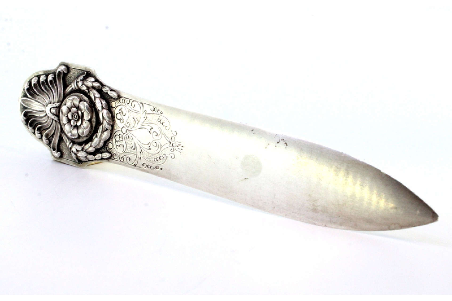 Abre cartas em prata com grinaldas e motivos florais relevados no cabo