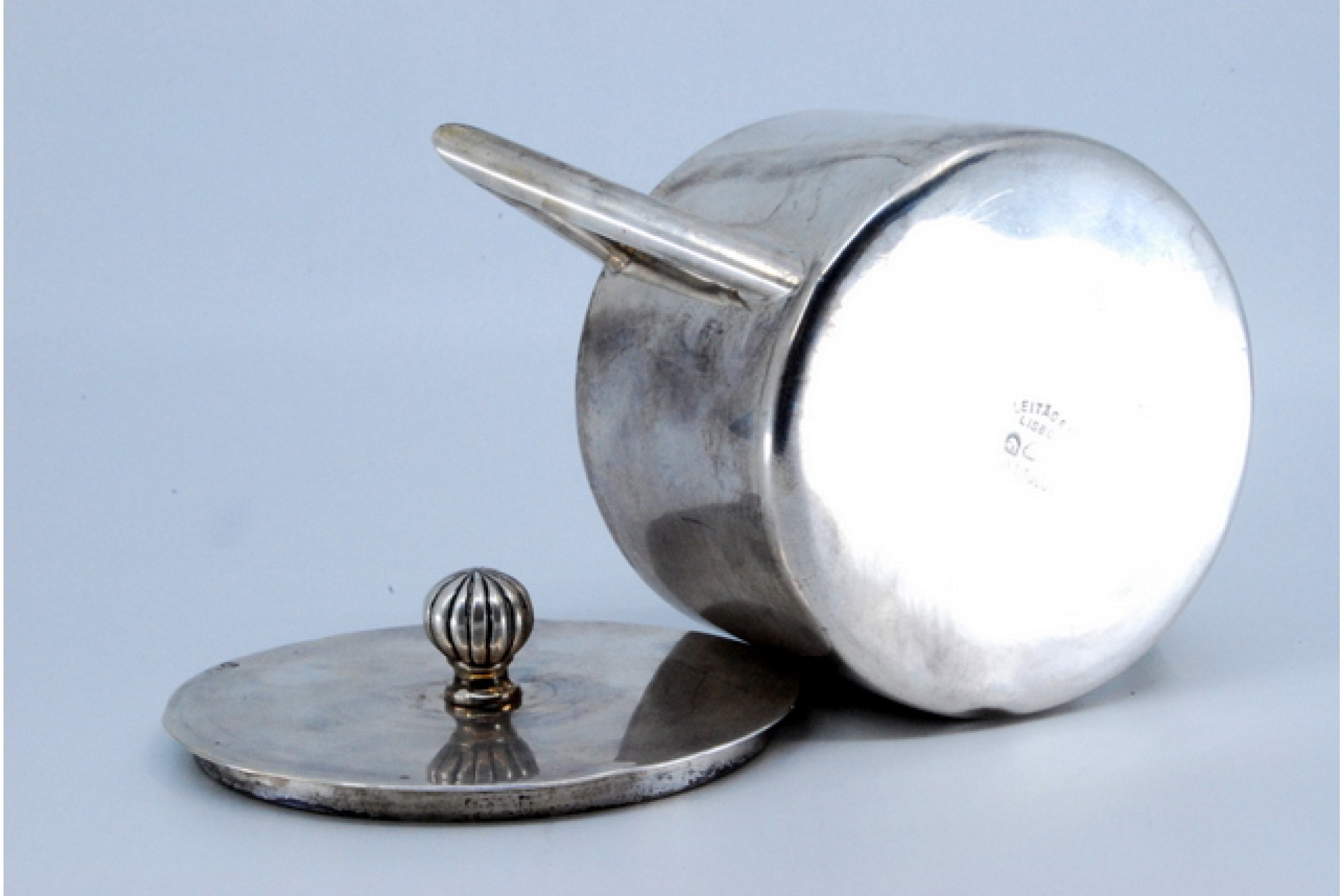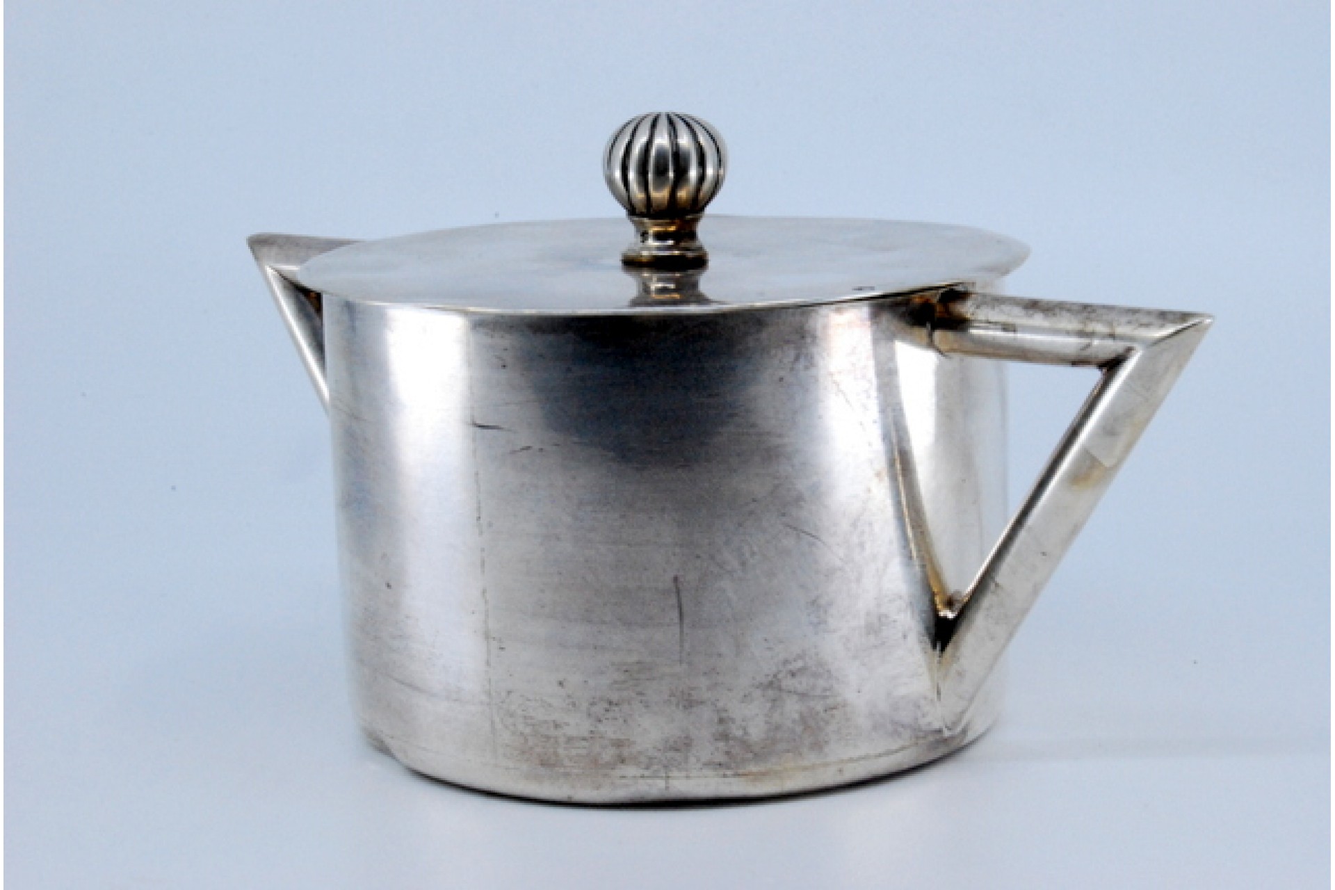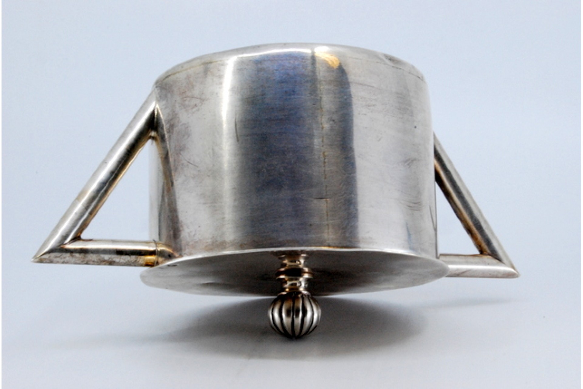 • Descrição: Açucareiro em prata lisa, pomo gomado na tampa e asas de forma geométricas.