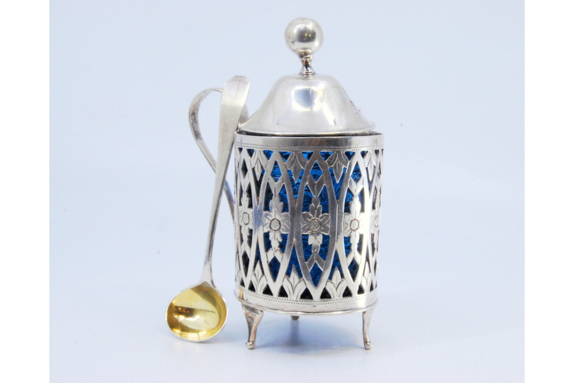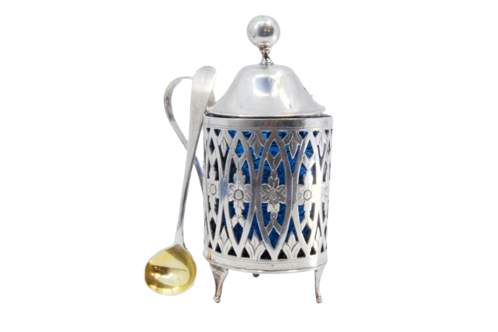 Açucareiro em prata com estrutura recortada e interior em vidro com pá de açucar e tampa com pega redonda