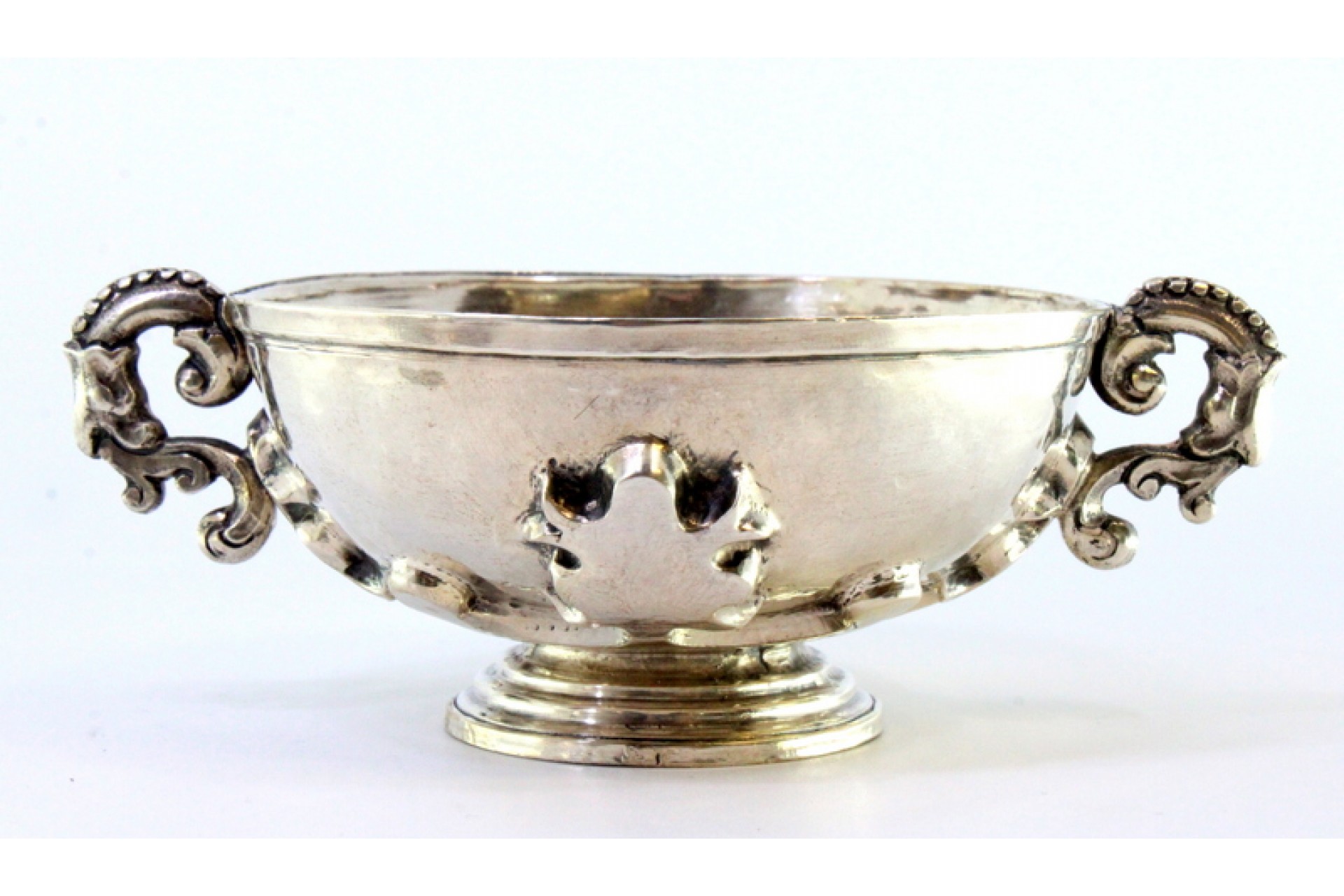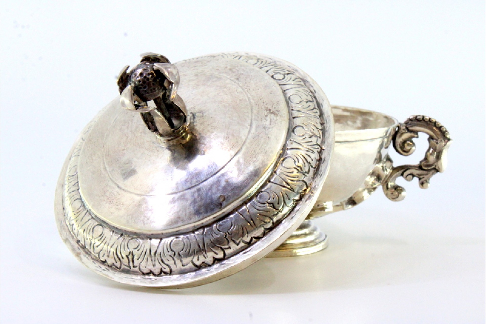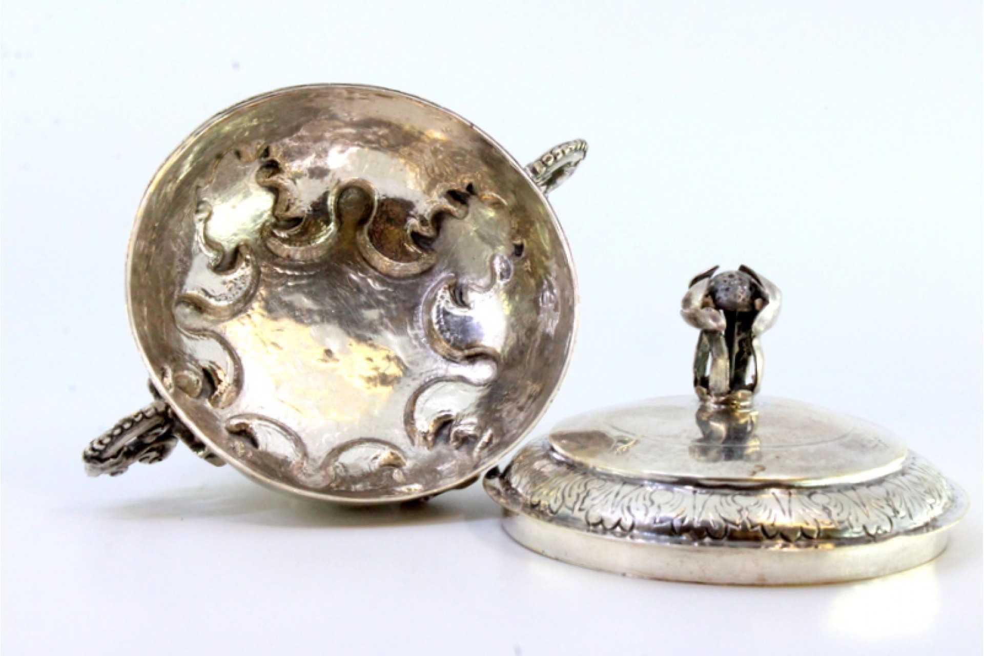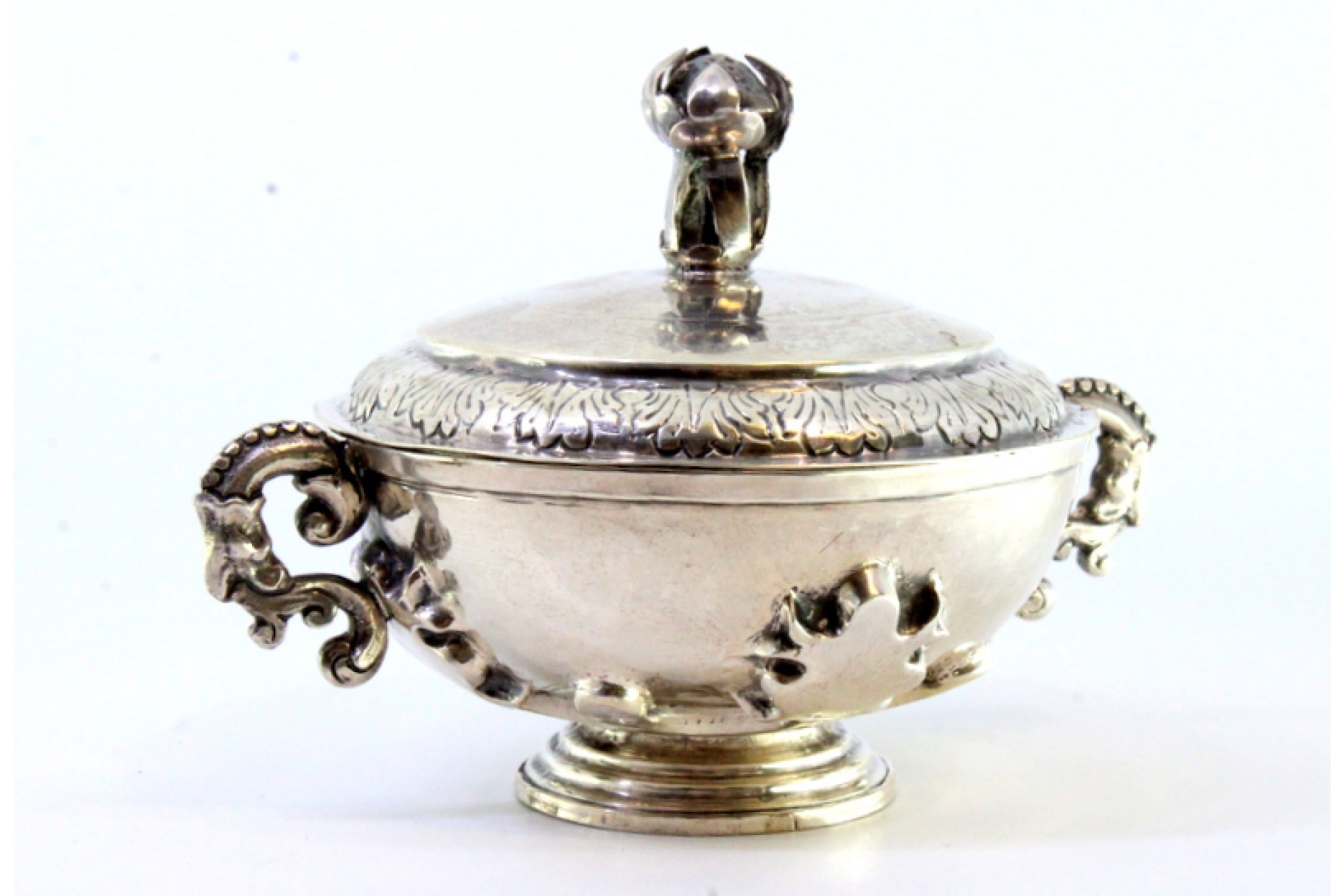 • Descrição: Açucareiro em prata com pomo na tampa, duas pegas com relevos e aplicações assente em base redonda com frisos.