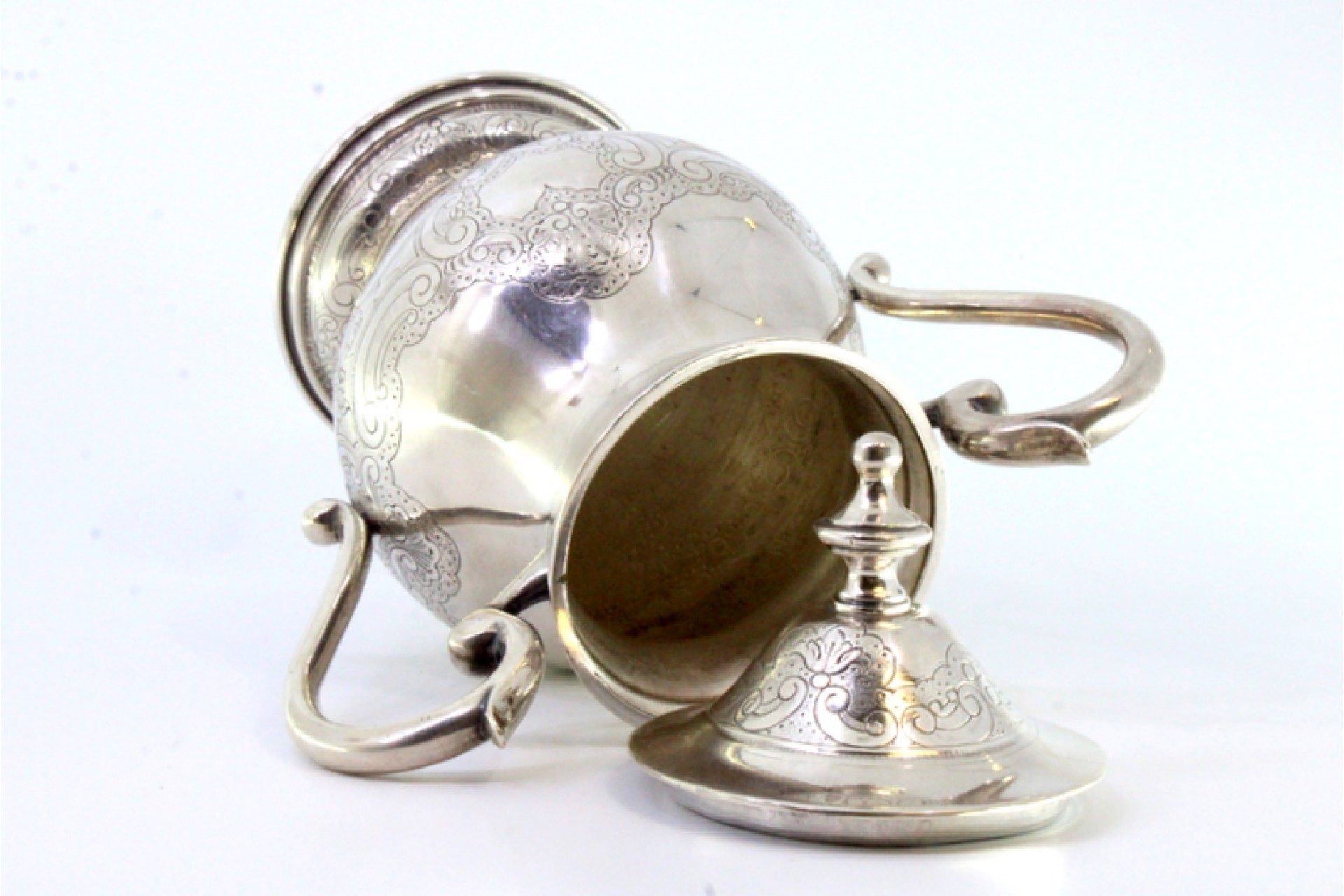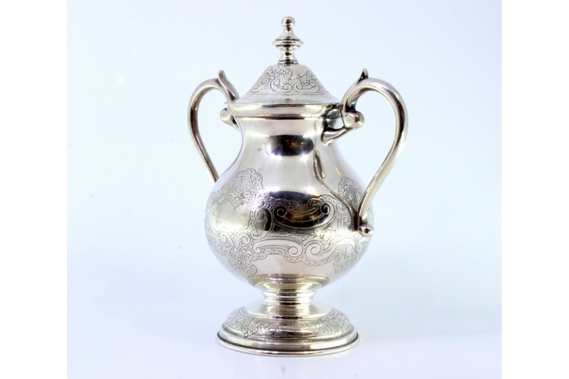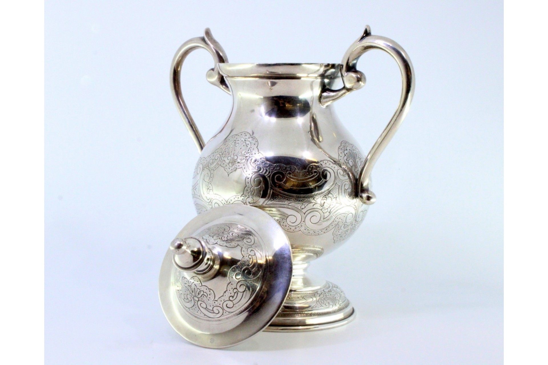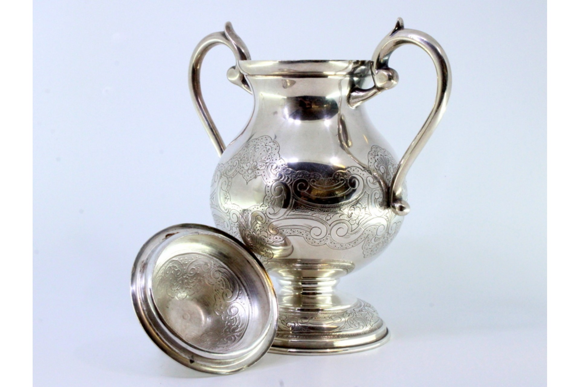Etiquetas: Açucareiro, Prata, Relevo, Monograma, Pomo