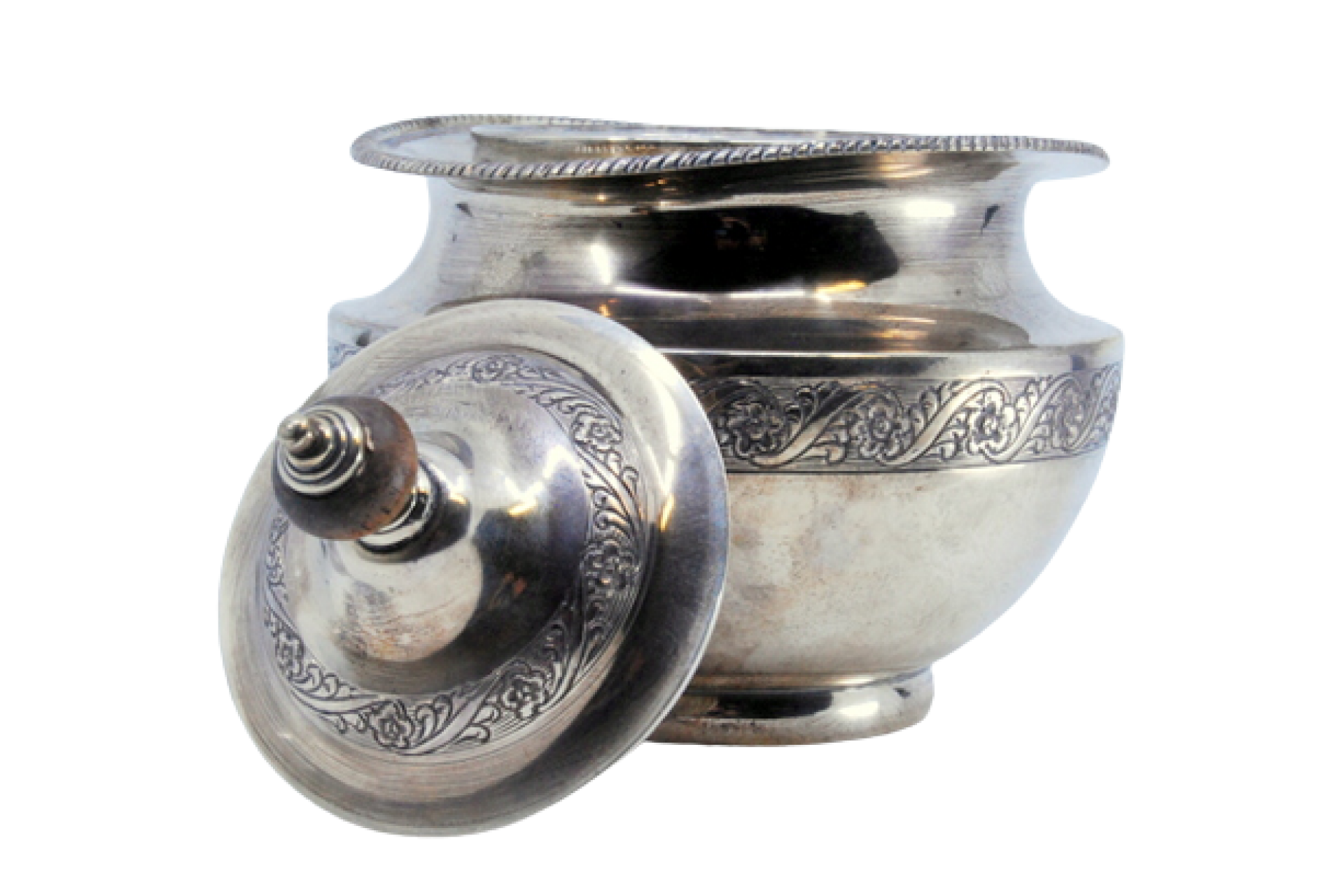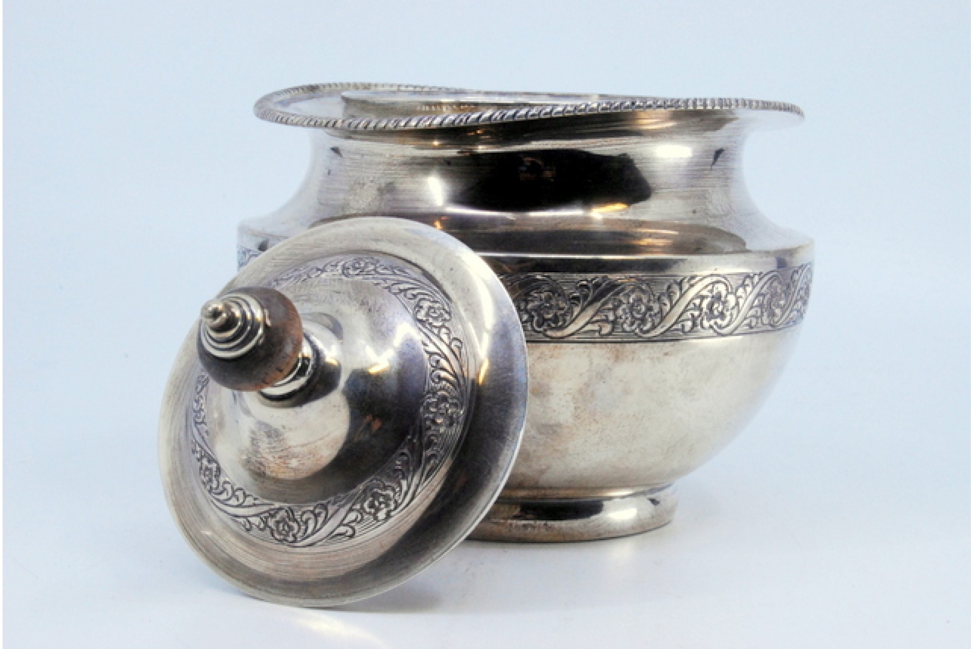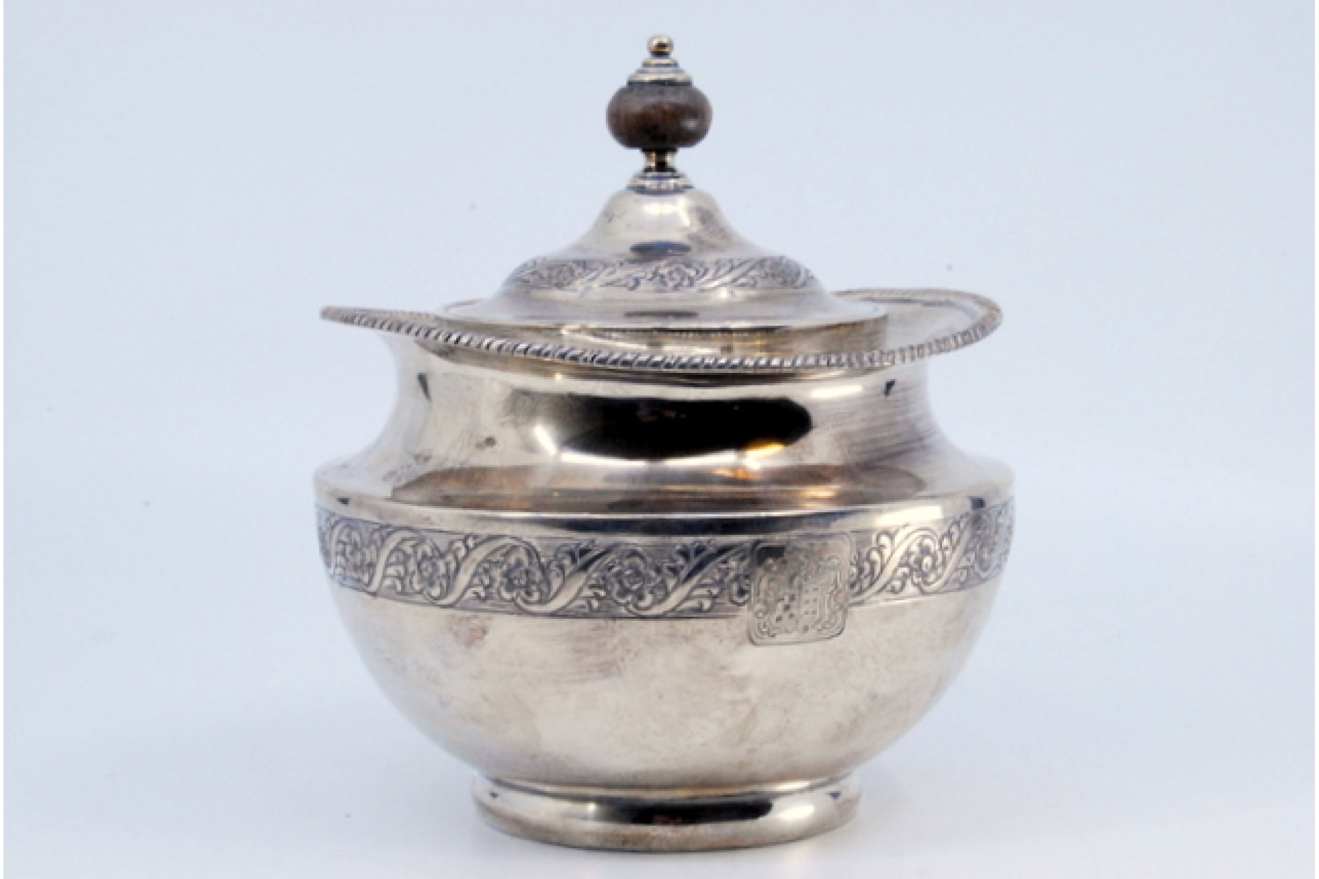 • Descrição: Açucareiro em prata com gravados na envolvência e tampa com pomo de madeira.