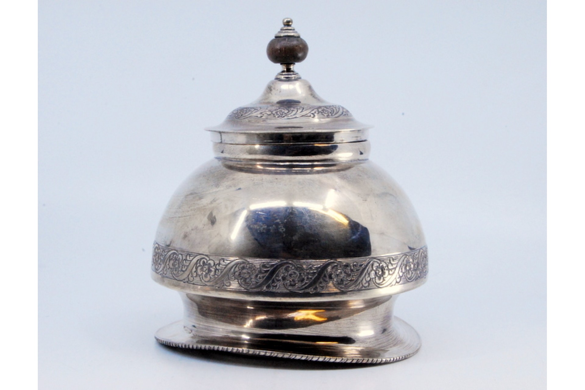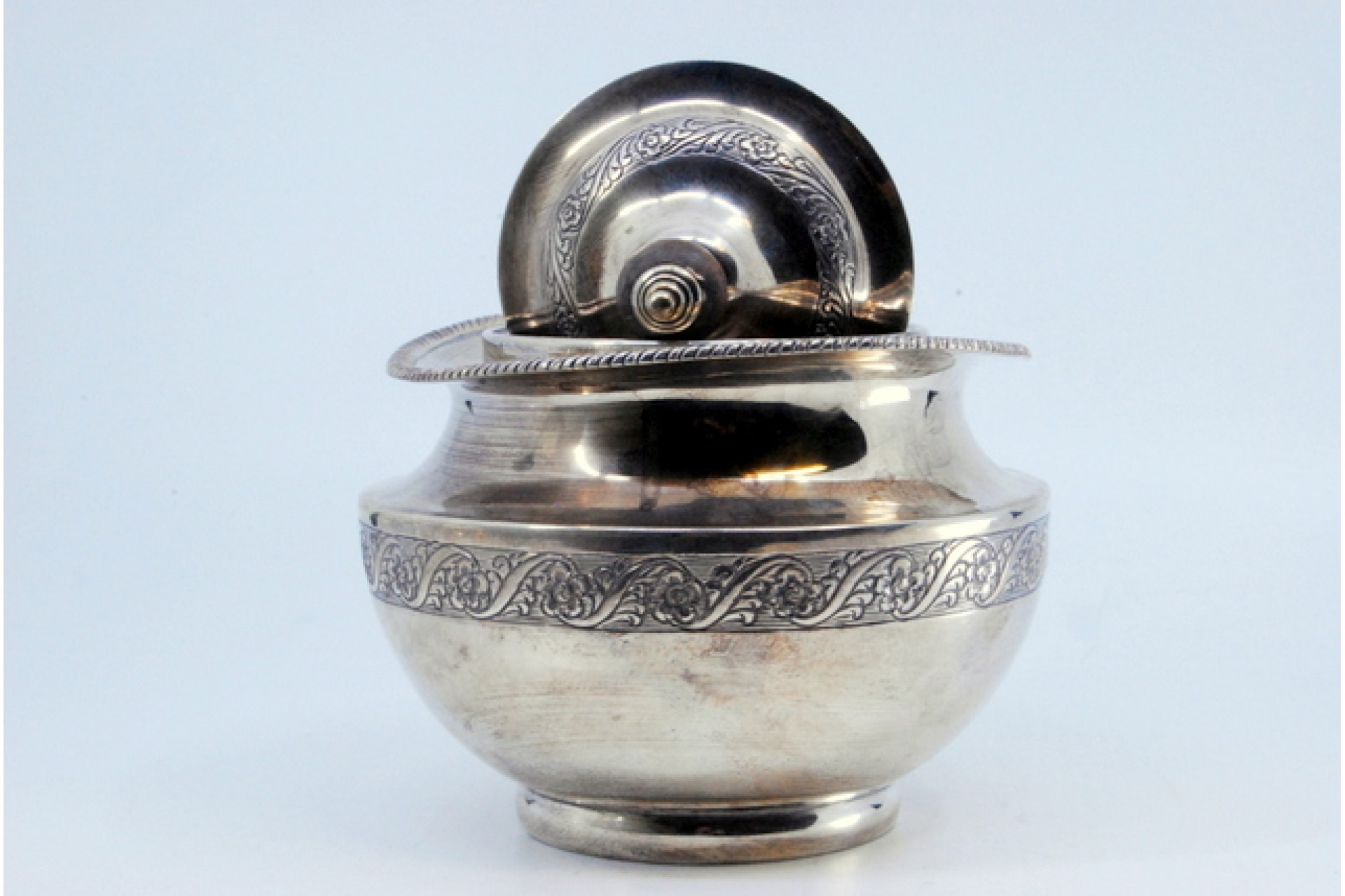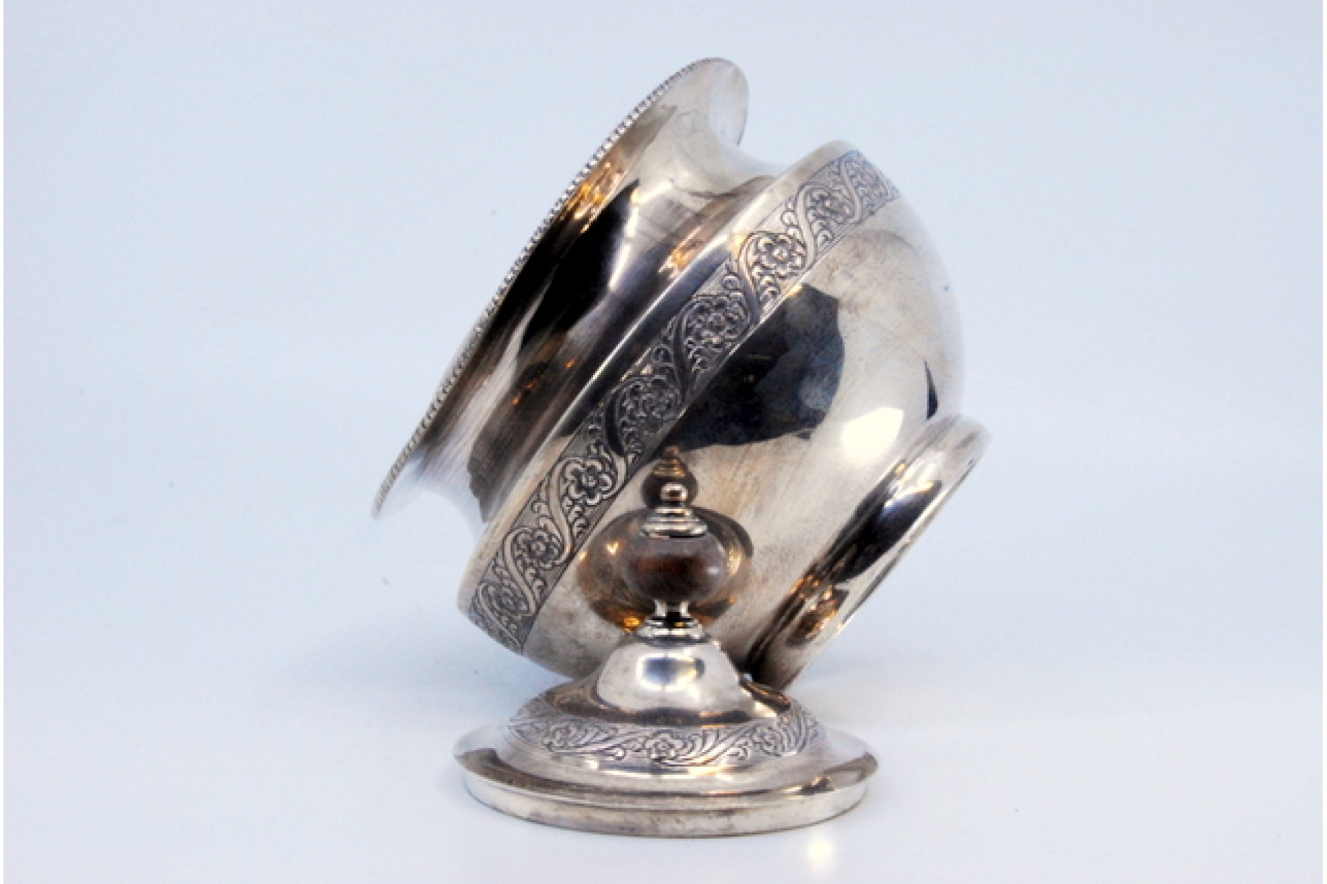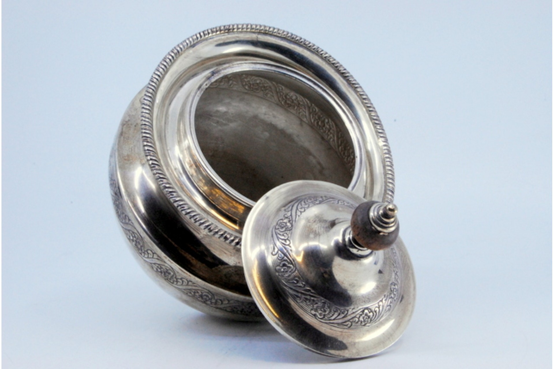 • Descrição: Açucareiro em prata com gravados na envolvência e tampa com pomo de madeira.