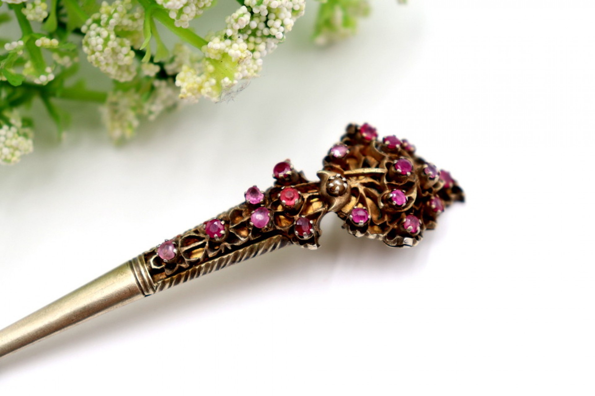 Alfinete de cabelo em prata e ouro recortado com aplicação de rubis.
