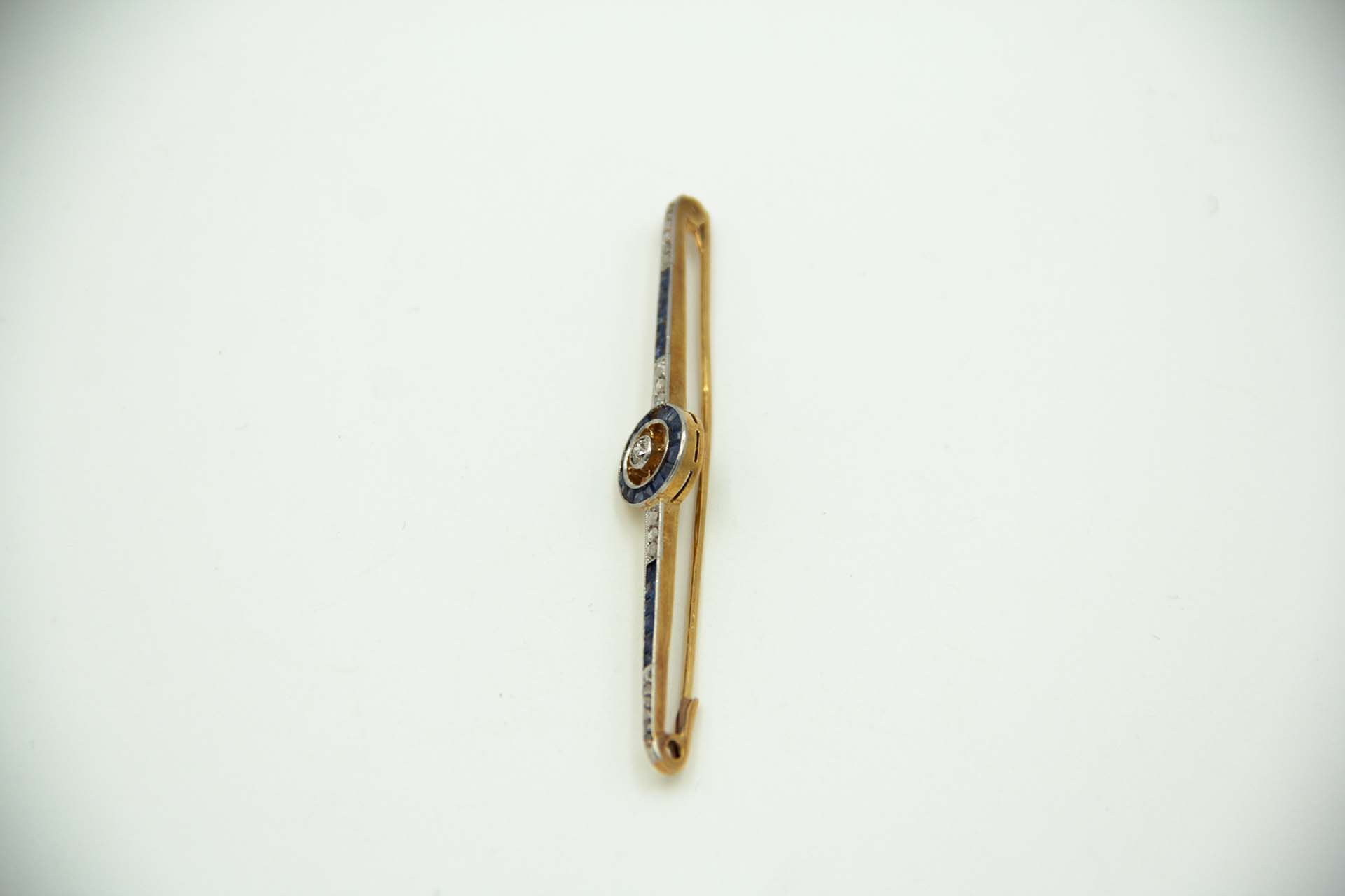 • Descrição: Alfinete de peito de ouro amarelo e platina com diamante em talhe brilhante, lascas de diamante e safiras calibradas.