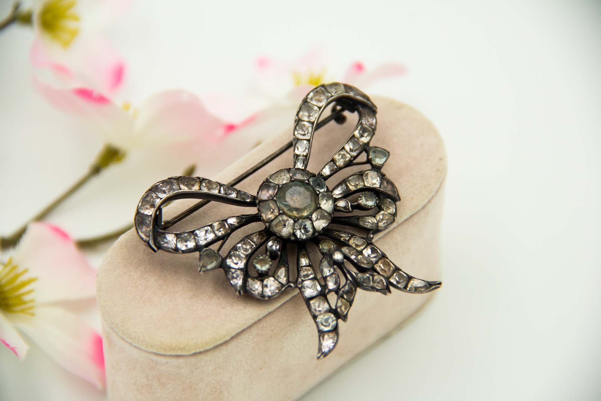Alfinete de peito em prata em forma de laço com quatrz - Minas Novas - aplicadas.