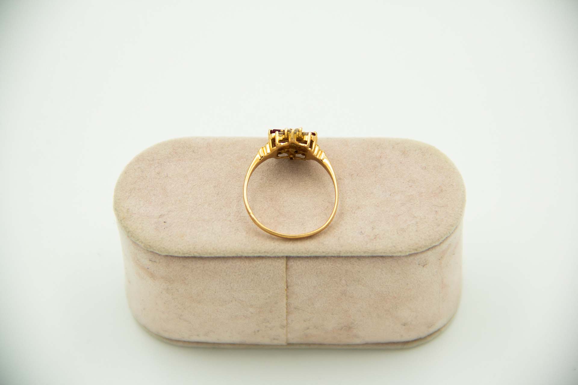 • Descrição: Anel de ouro amarelo com diamntes (10) em talhe brilhante 8/8 e rubis calibrados.