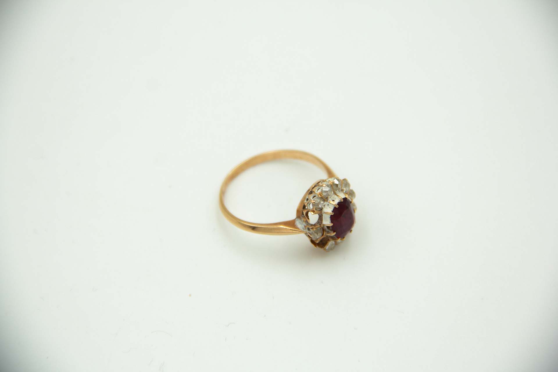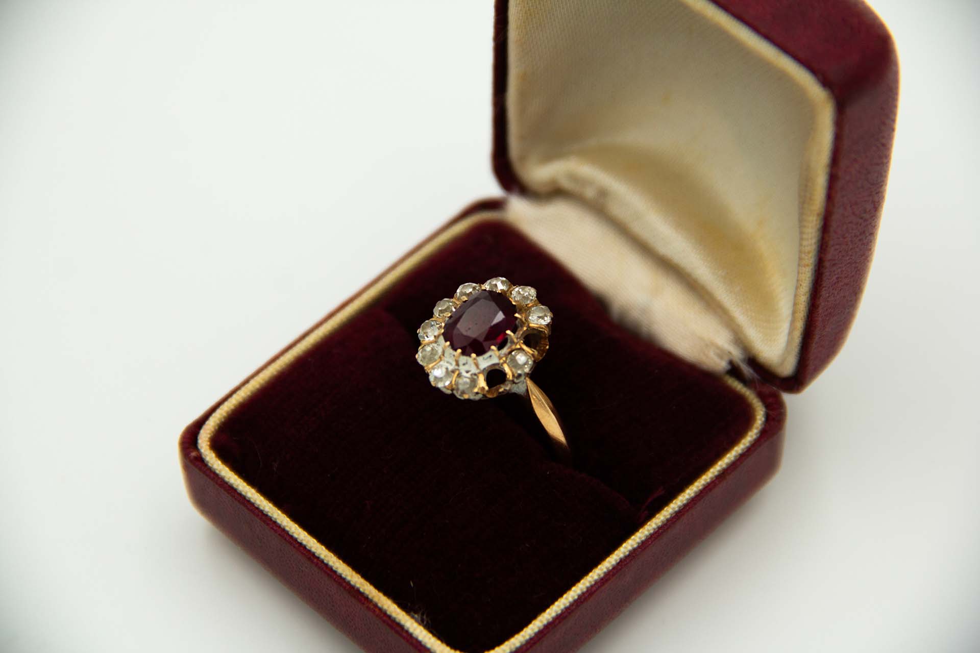 • Descrição: Anel de ouro amarelo com diamantes em talhe brilhante antigo e rubi lapidado.