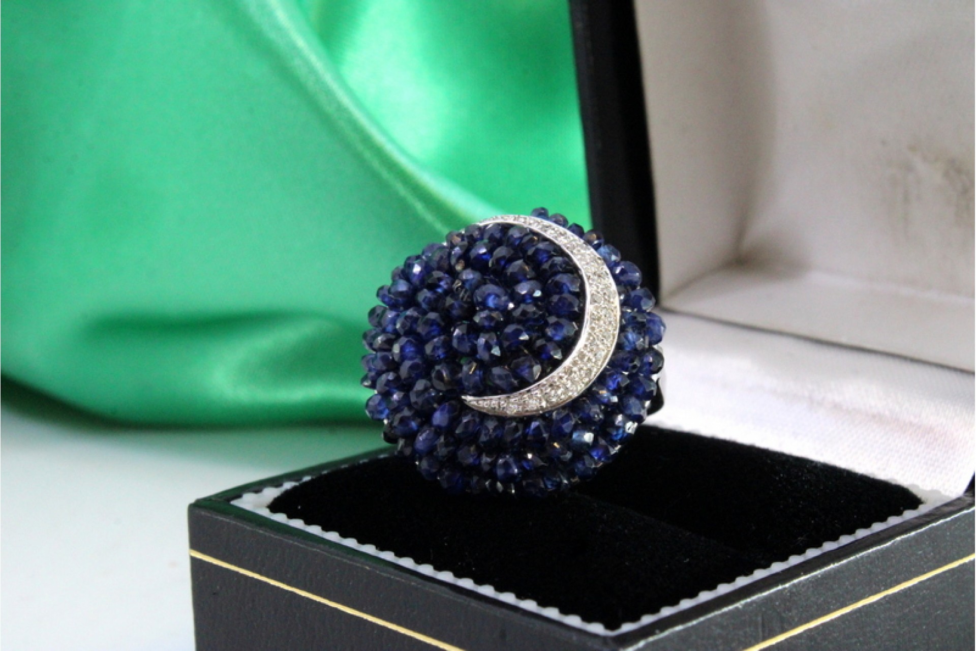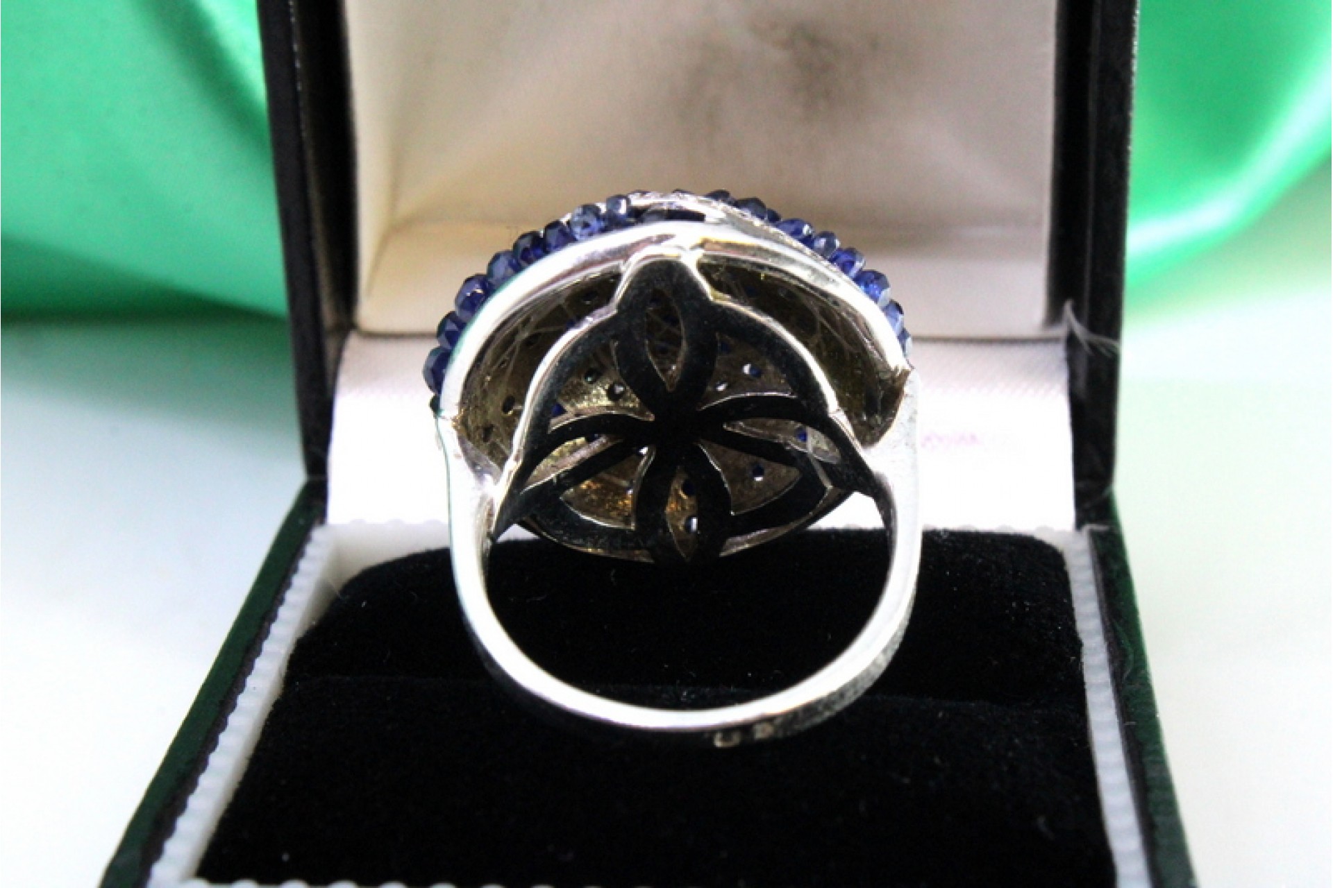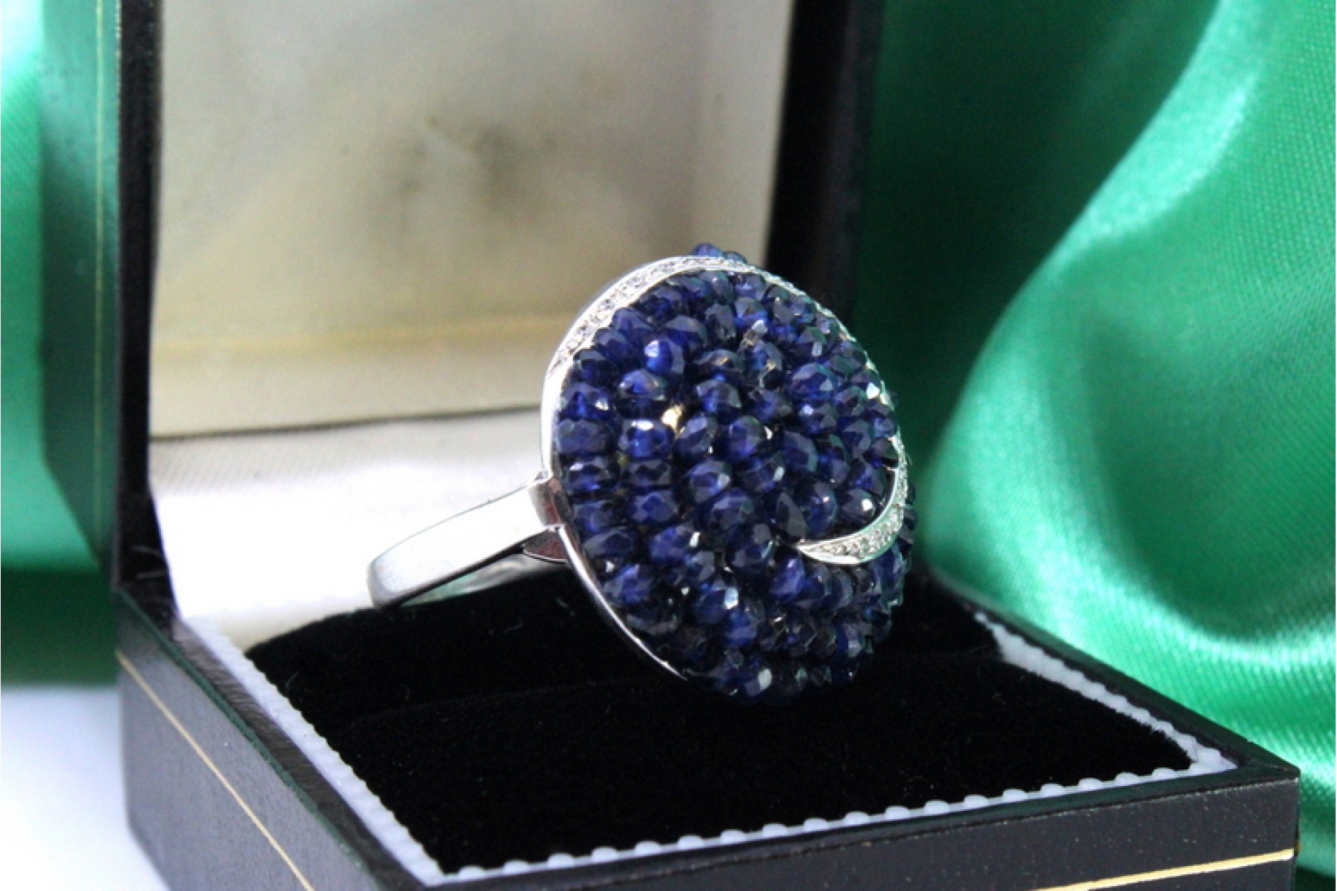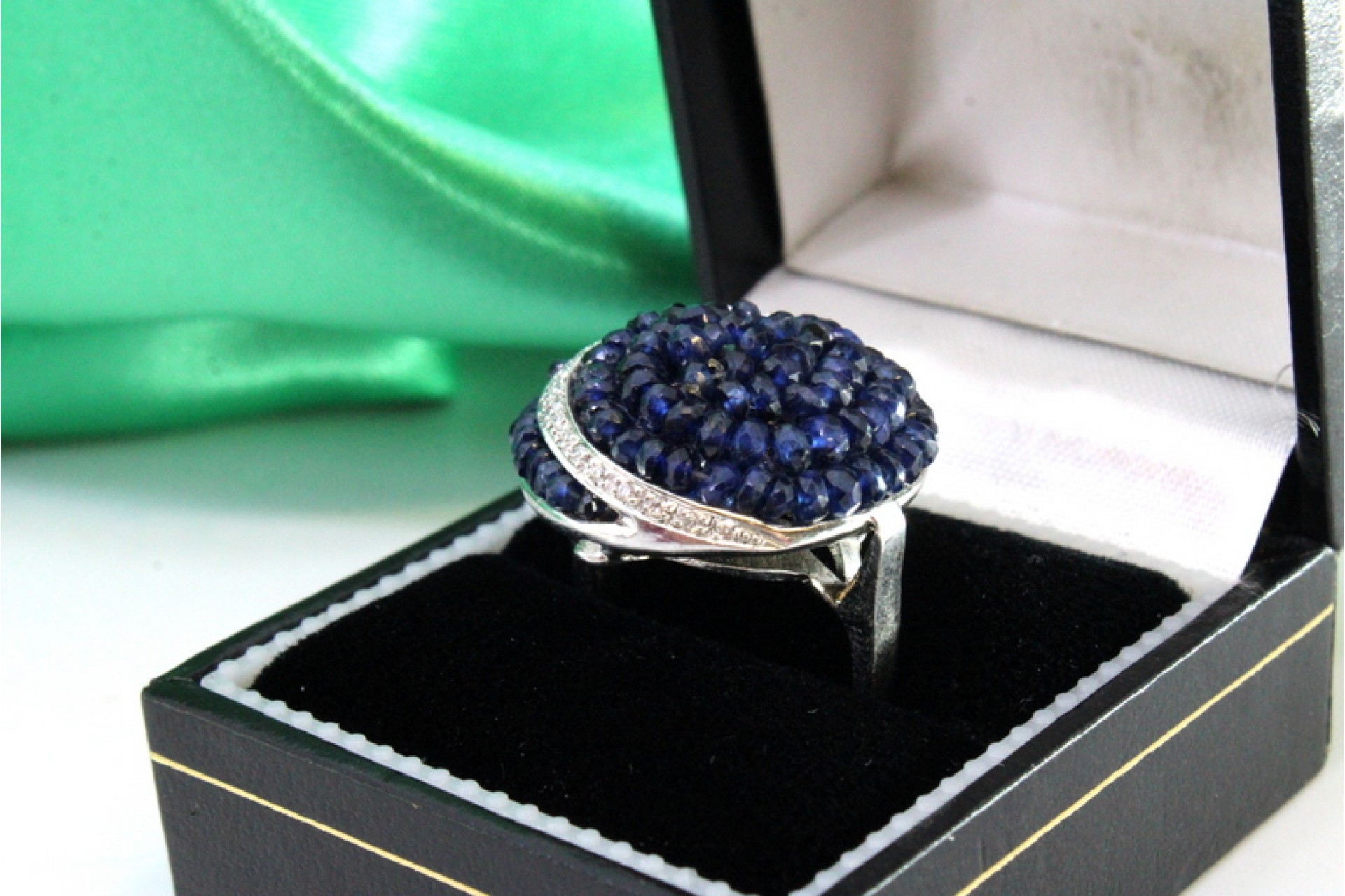- Descrição: Anel em ouro branco com diamantes (30) em talhe brilhante e safiras australianas calibradas.