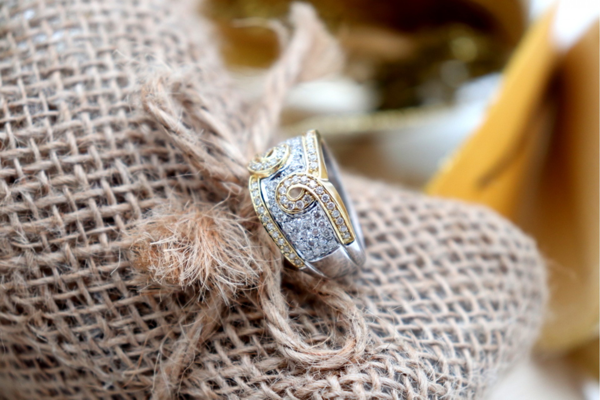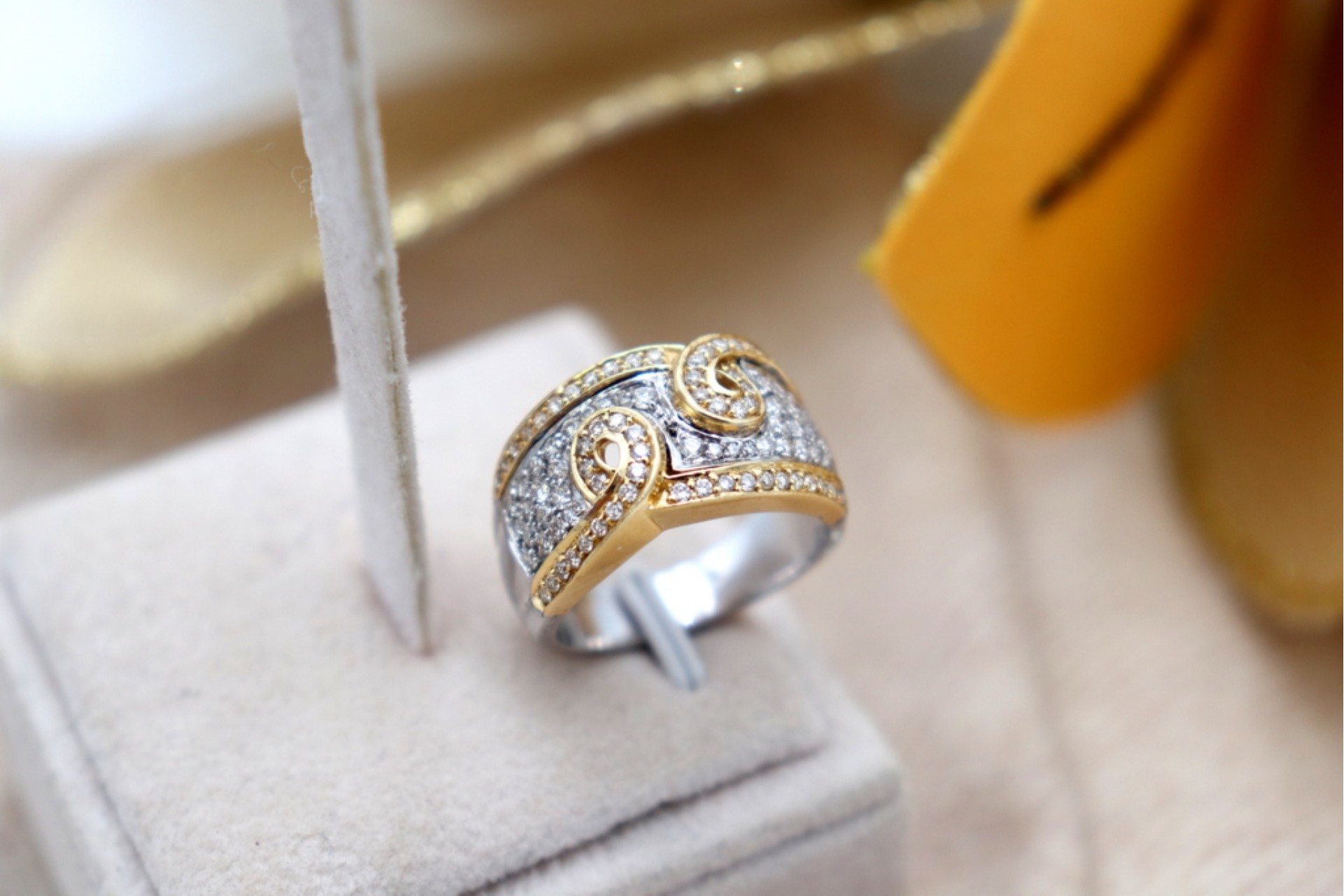 • Descrição: Anel em ouro bicolor diamantes (94) em talhe brilante 8/8 e enrolamentos.