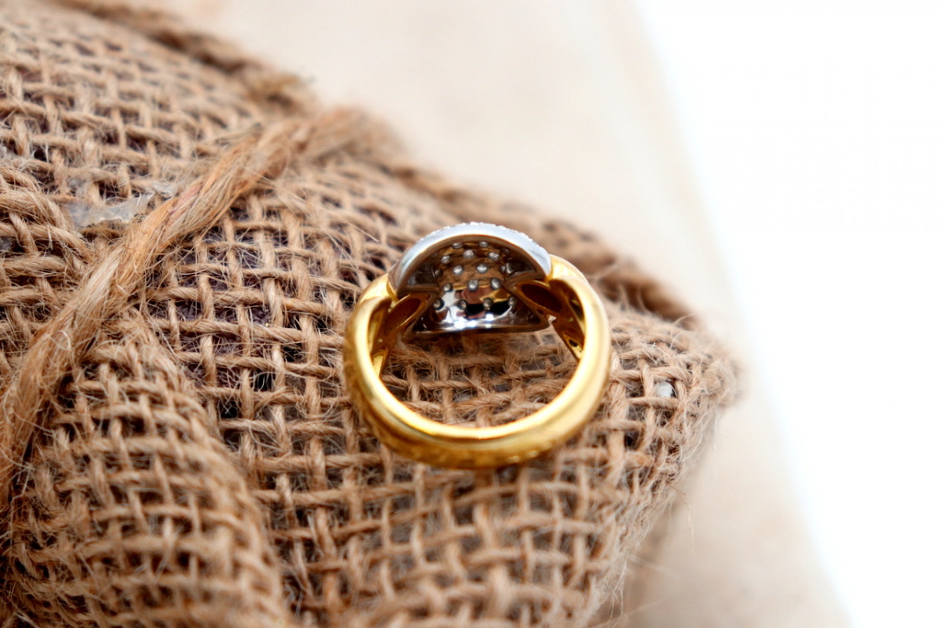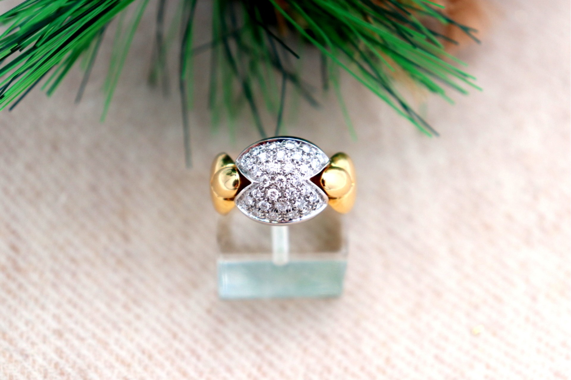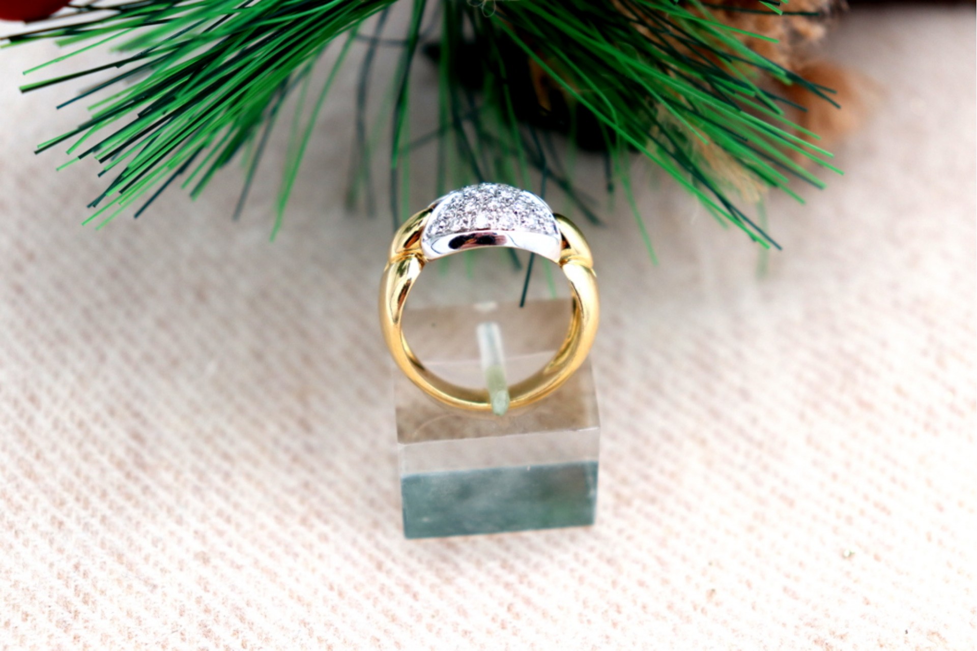 • Descrição: Anel em ouro bicolor com diamantes (31) em talhe brilhante 8/8.