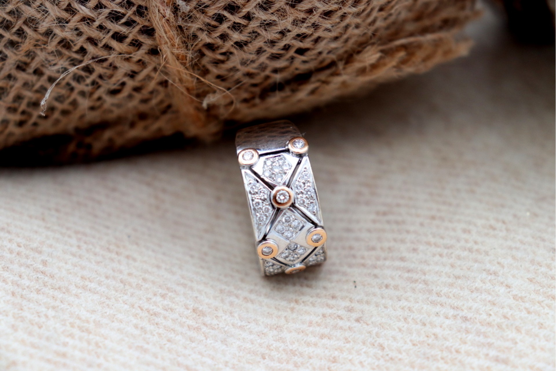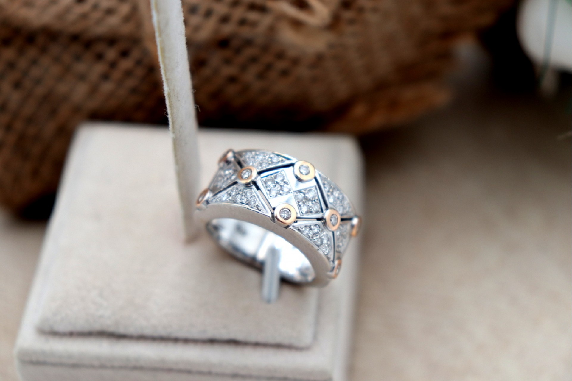 • Descrição: Anel em ouro branco com diamantes (46) em talhe brilhante 8/8 e oito círculos em ouro amarelo.