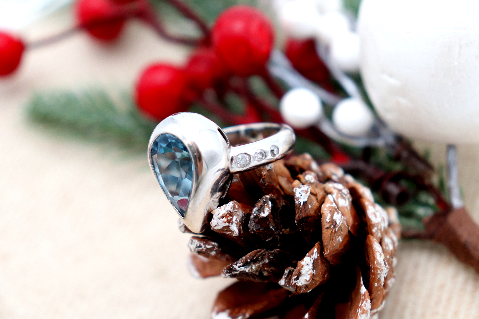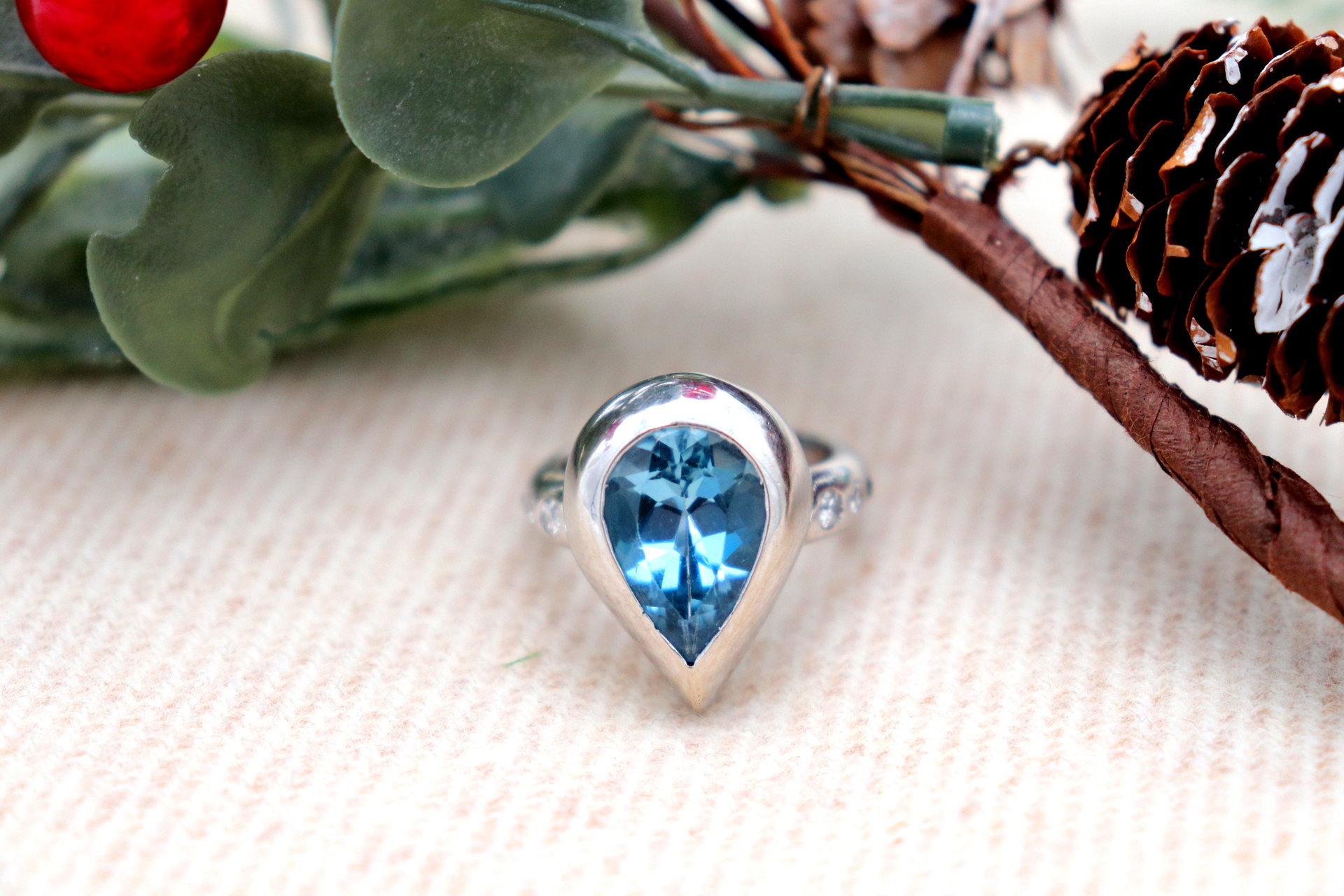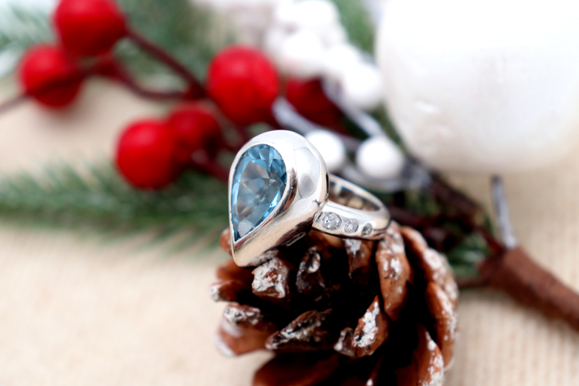 • Descrição: Anel em ouro branco com diamantes (6) em talhe brilhante 8/8 topásio azul em forma de pera.
