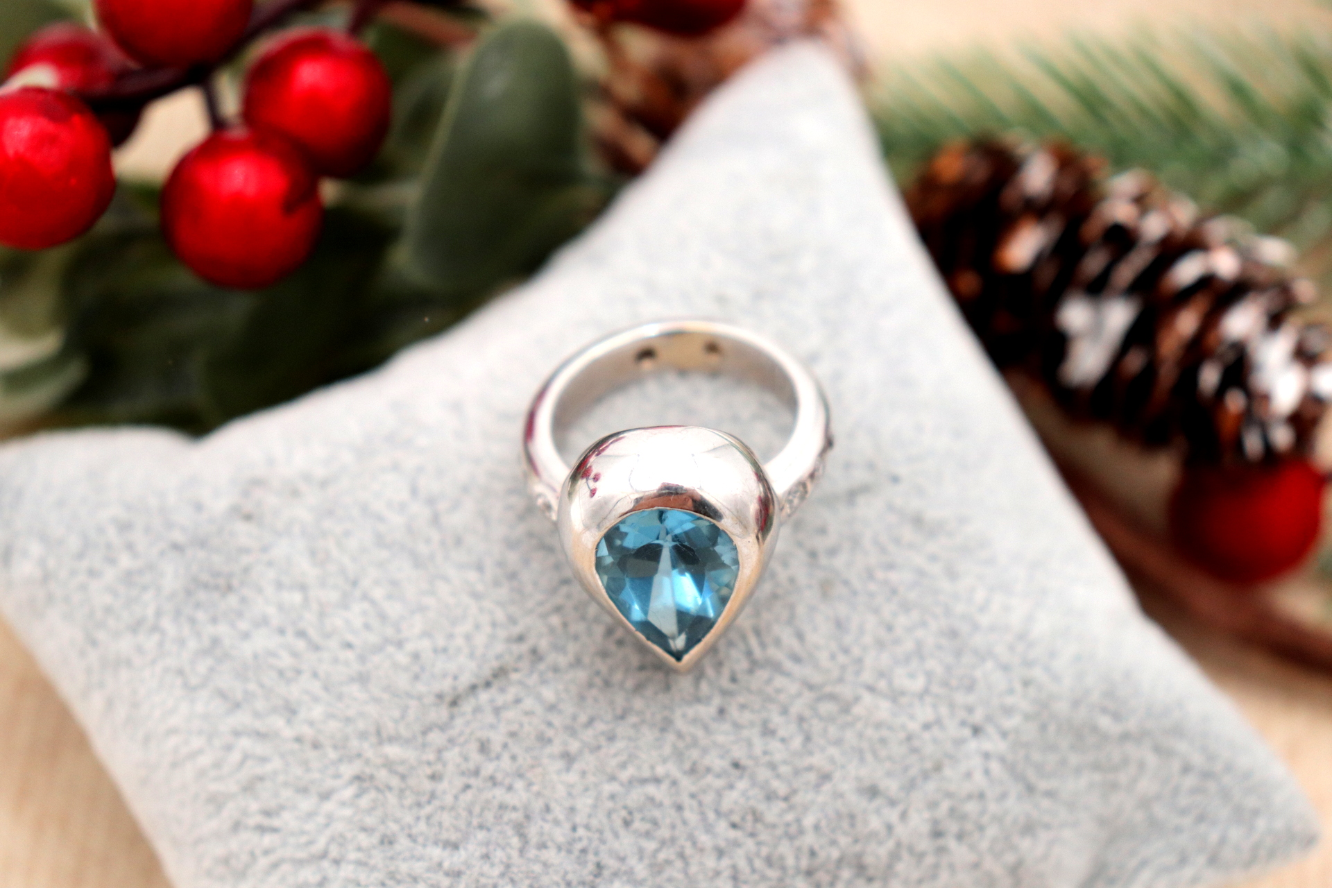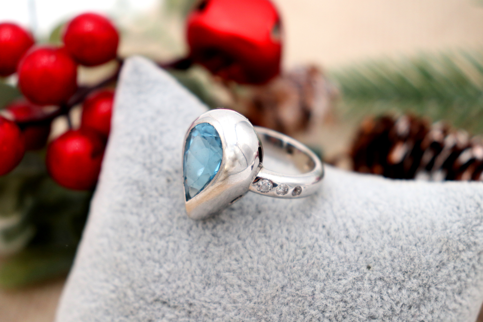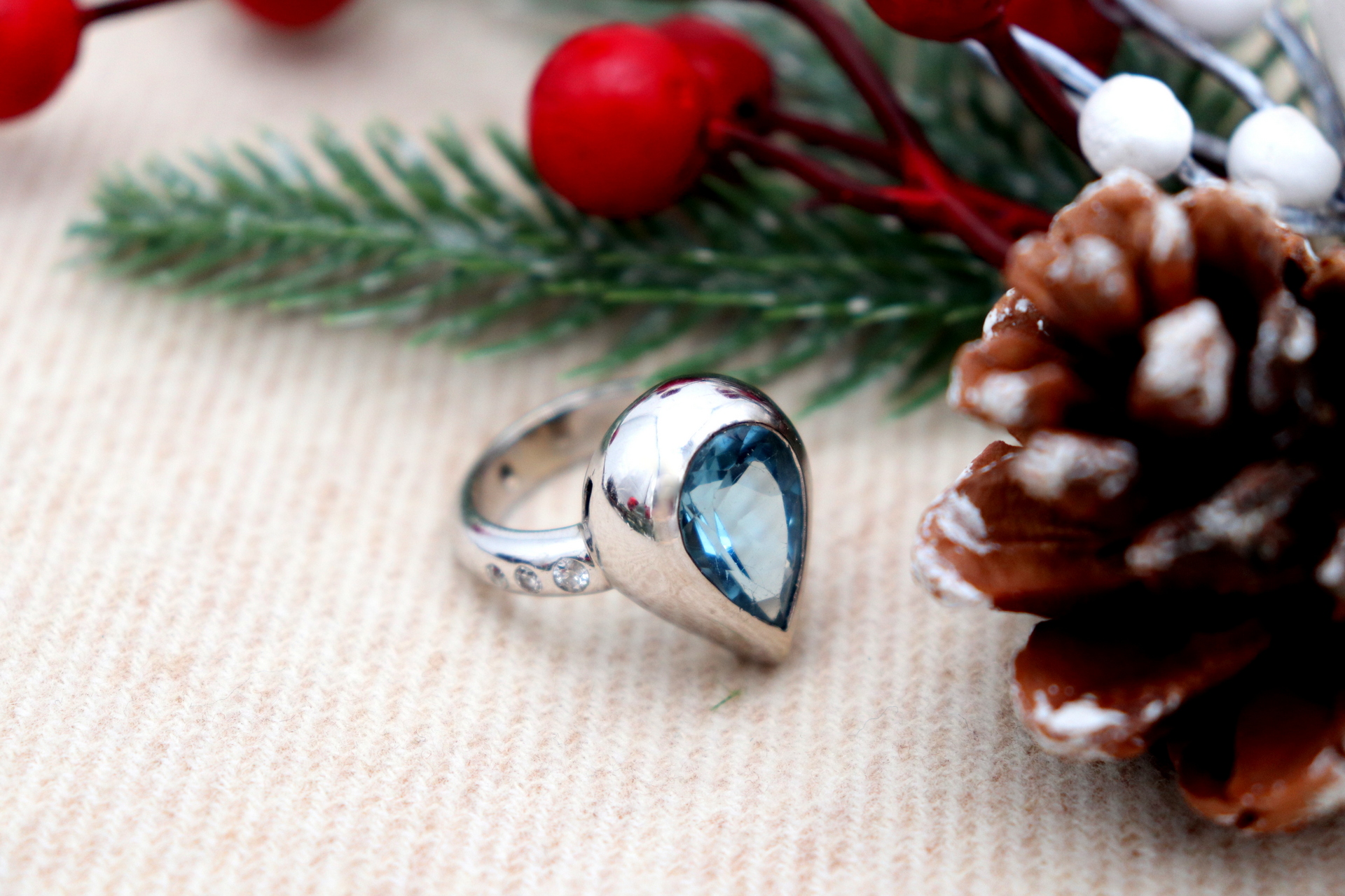 • Descrição: Anel em ouro branco com diamantes (6) em talhe brilhante 8/8 topásio azul em forma de pera.