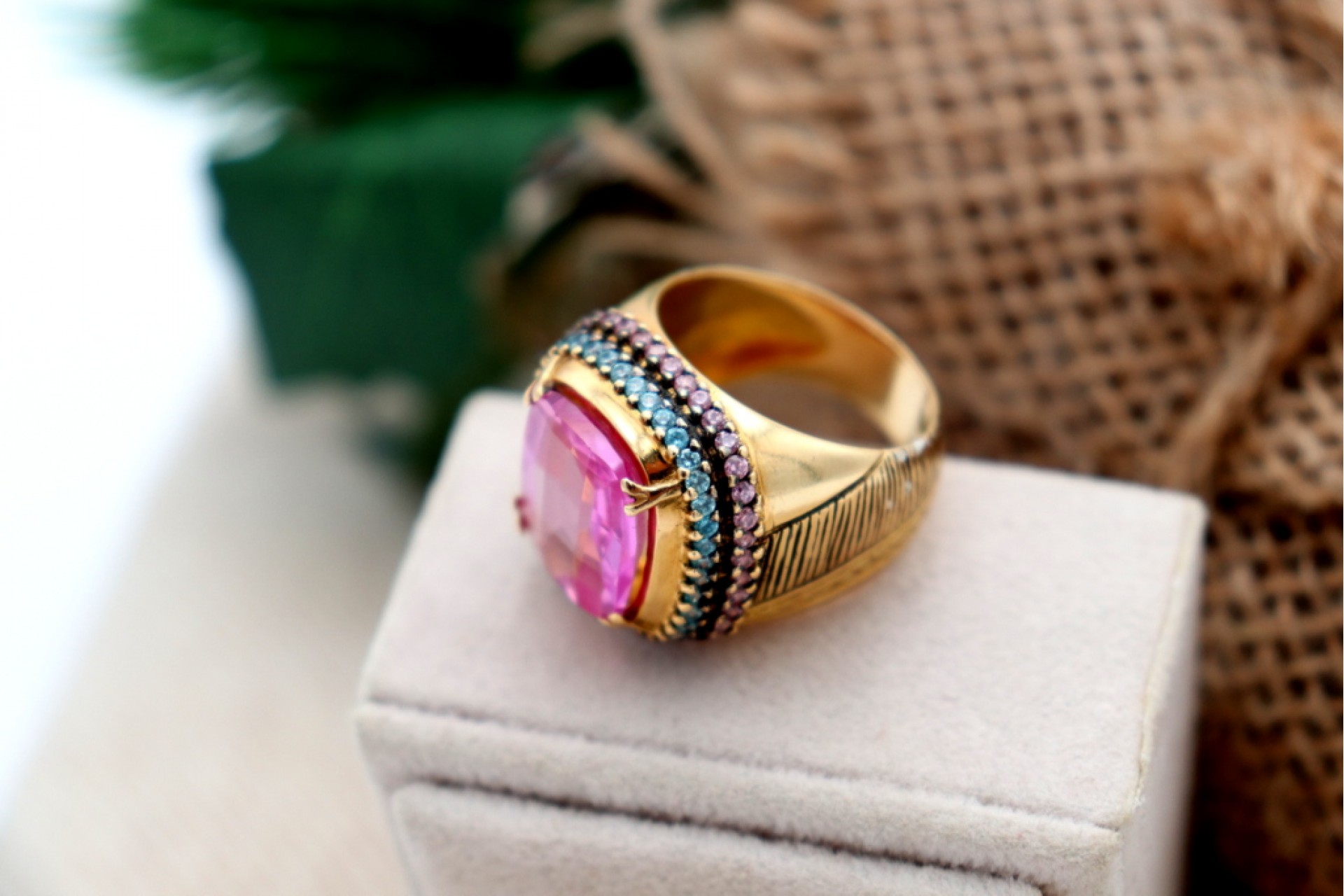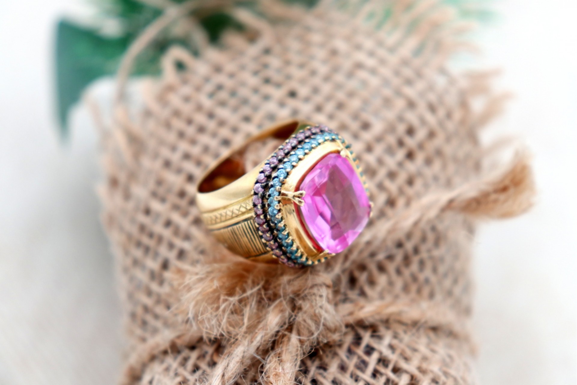 Anel em ouro com pedras coloridas e rubi rosa sintético