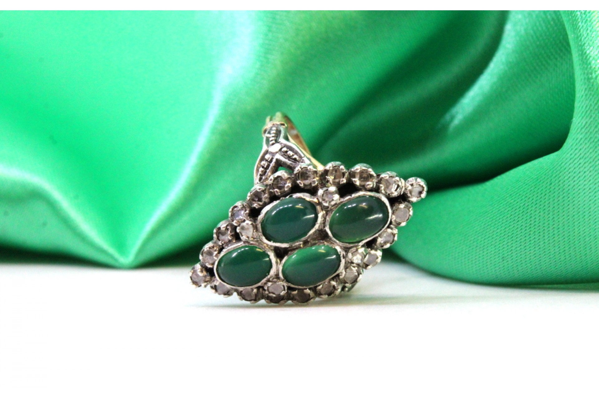 • Descrição: Anel em ouro e prata com lascas de diamantes (24) e (4) esmeraldas no centro em formato cabochão.