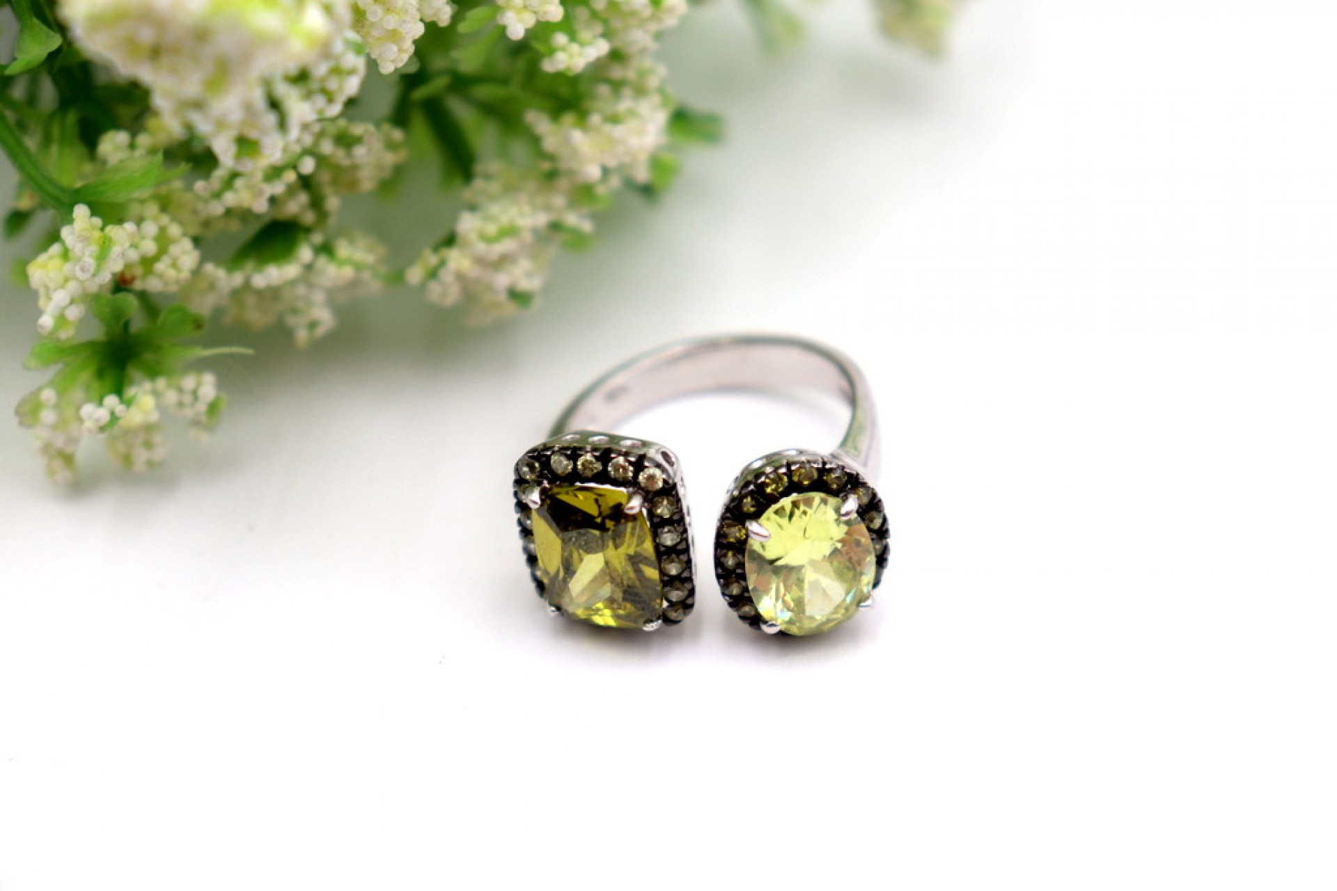 • Descrição: Anel em prata com duas mesas de formato distinto e aplicação de pedras lapidadas.
