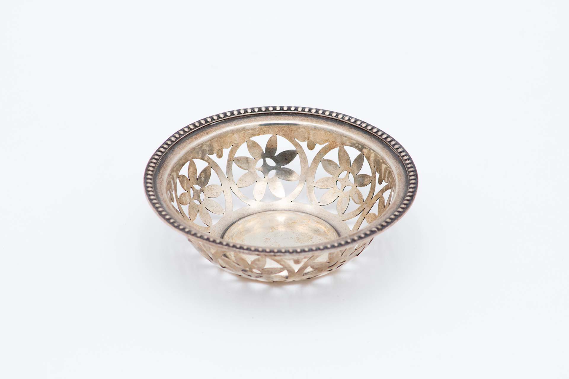 • Descrição: Aneleira de prata recortada e com relevos perlados no bordo.