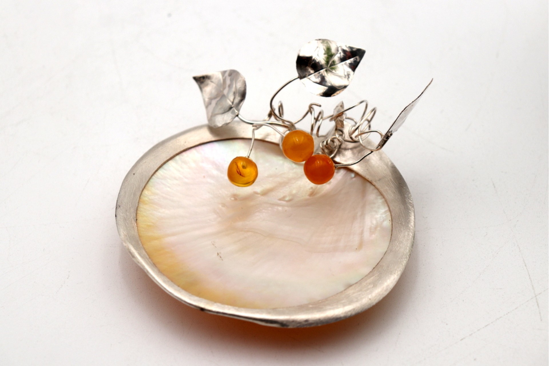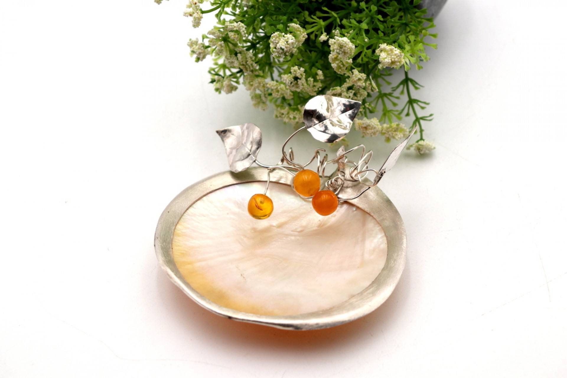• Descrição: Aneleira em madre pérola com estrutura em prata e aplicação de folhas com enrolamentos, três bolas de âmbar amarelas.