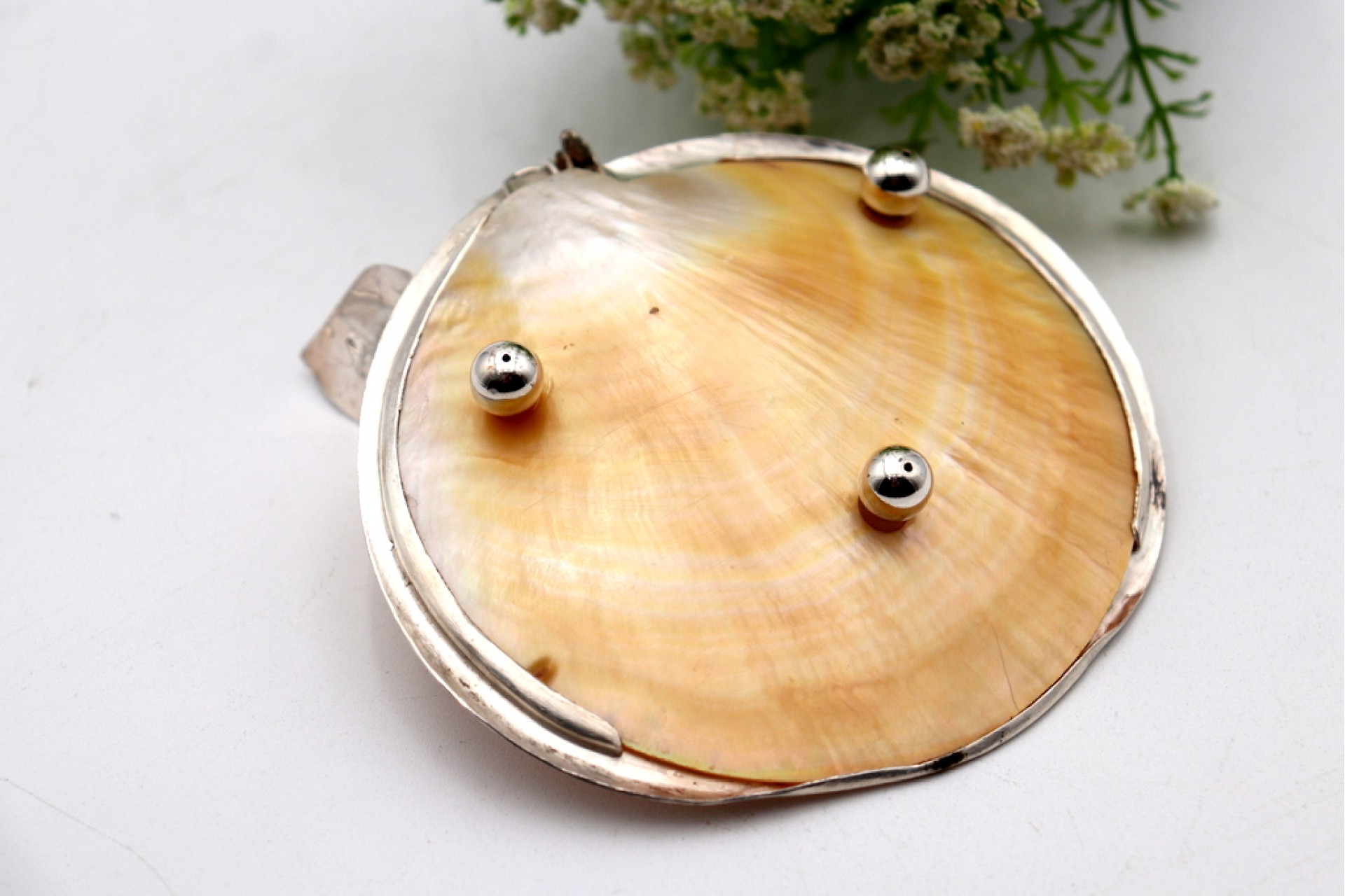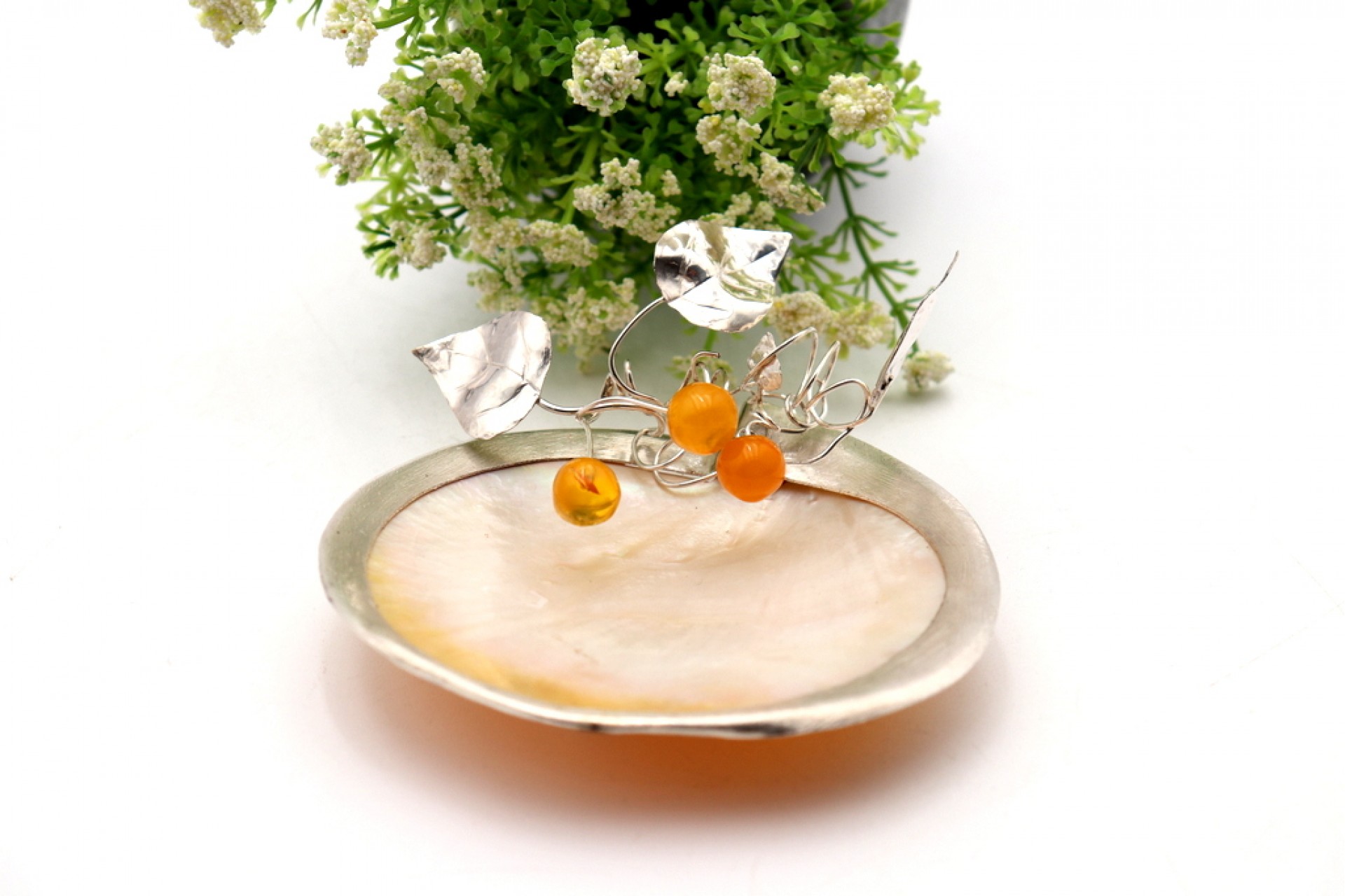 Aneleira em madre pérola com estrutura em prata aplicação de folhas