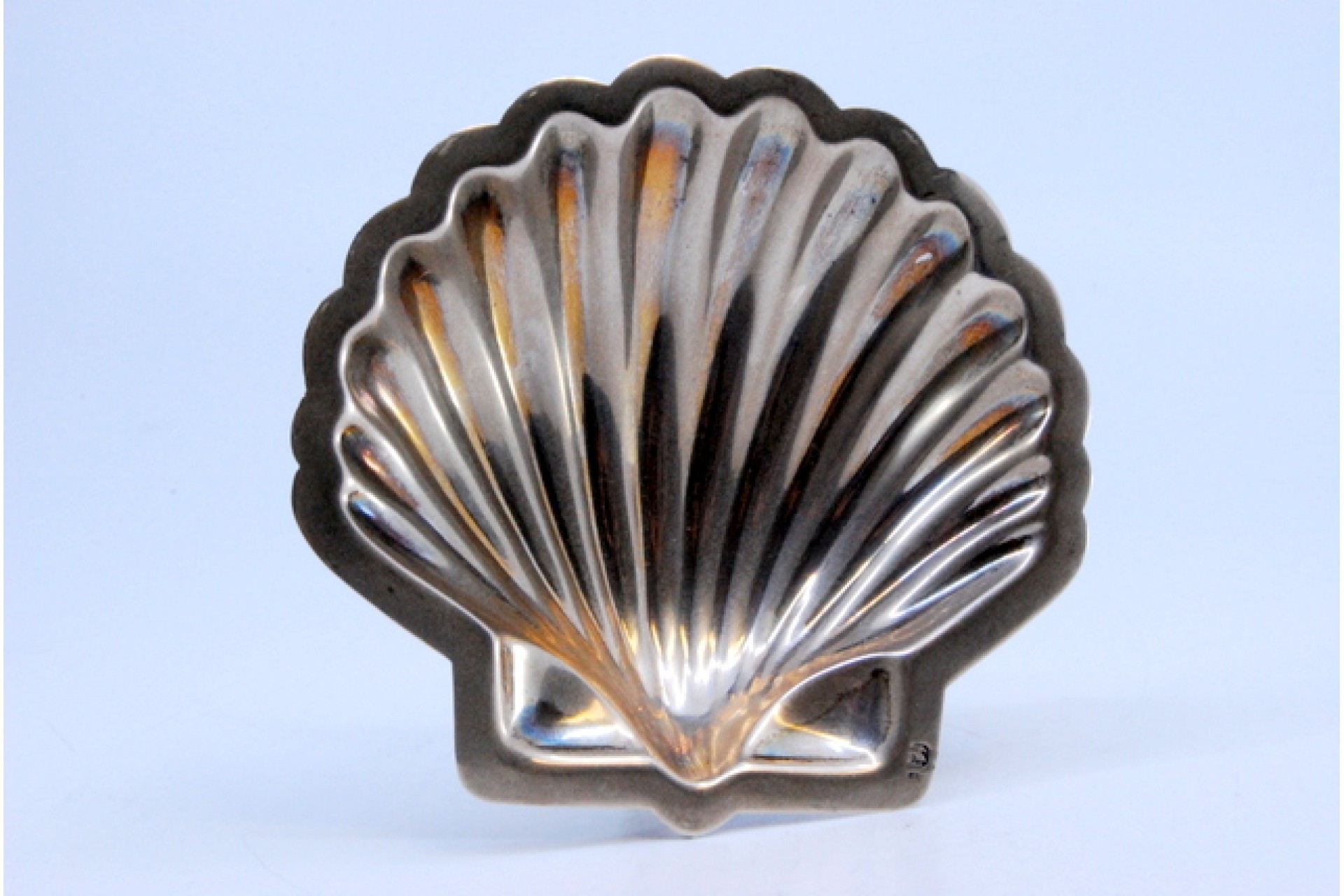 • Descrição: Aneleira em prata dourada em formato de concha com três pés em forma de peixes.