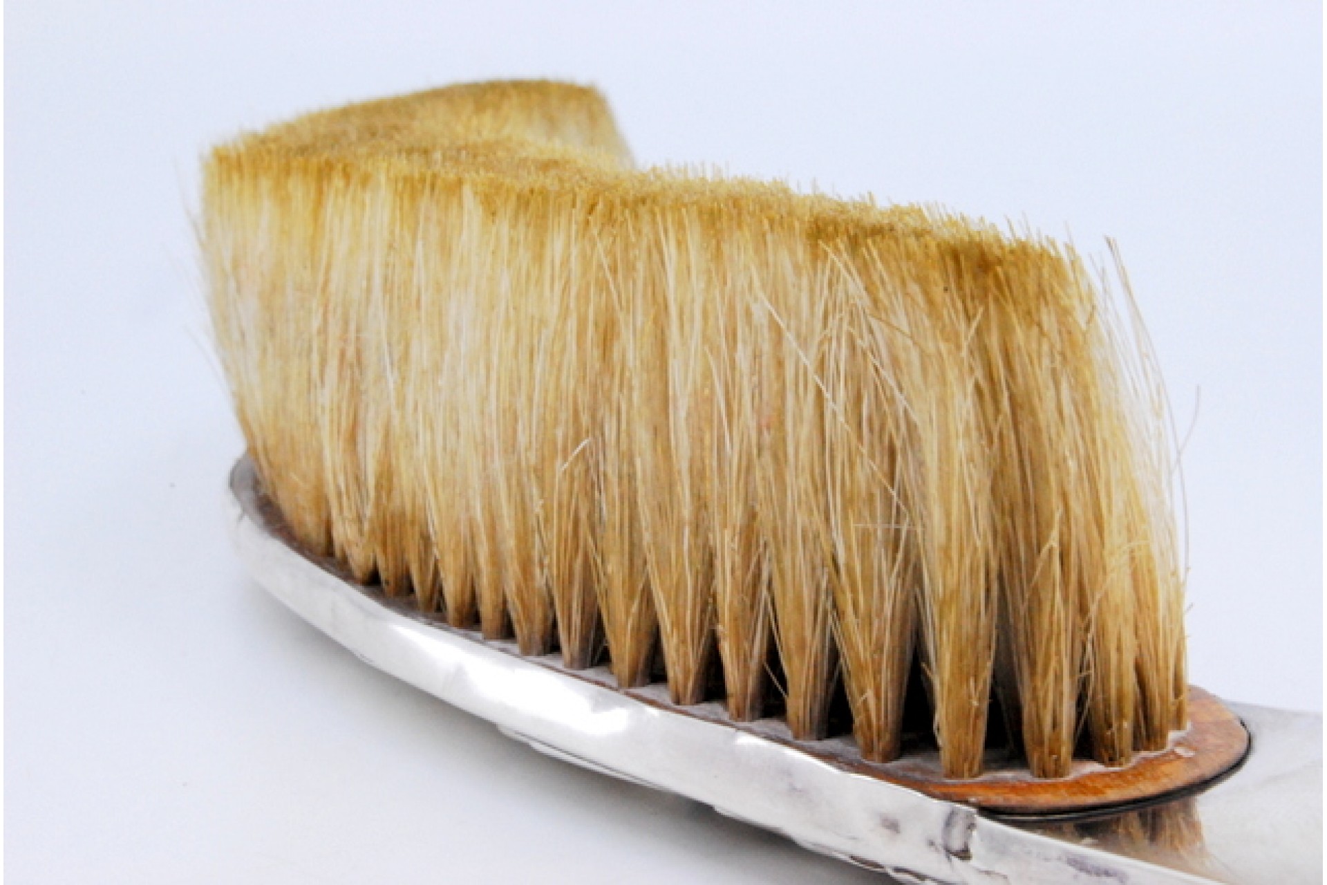 Apanha migalhas e escova em prata com relevos de folhas e flores.