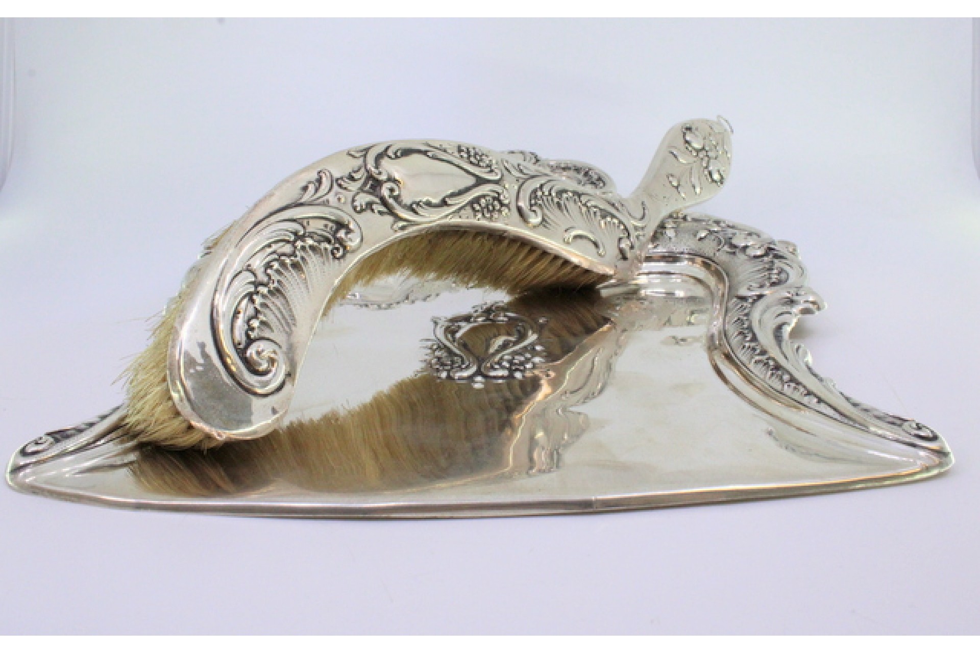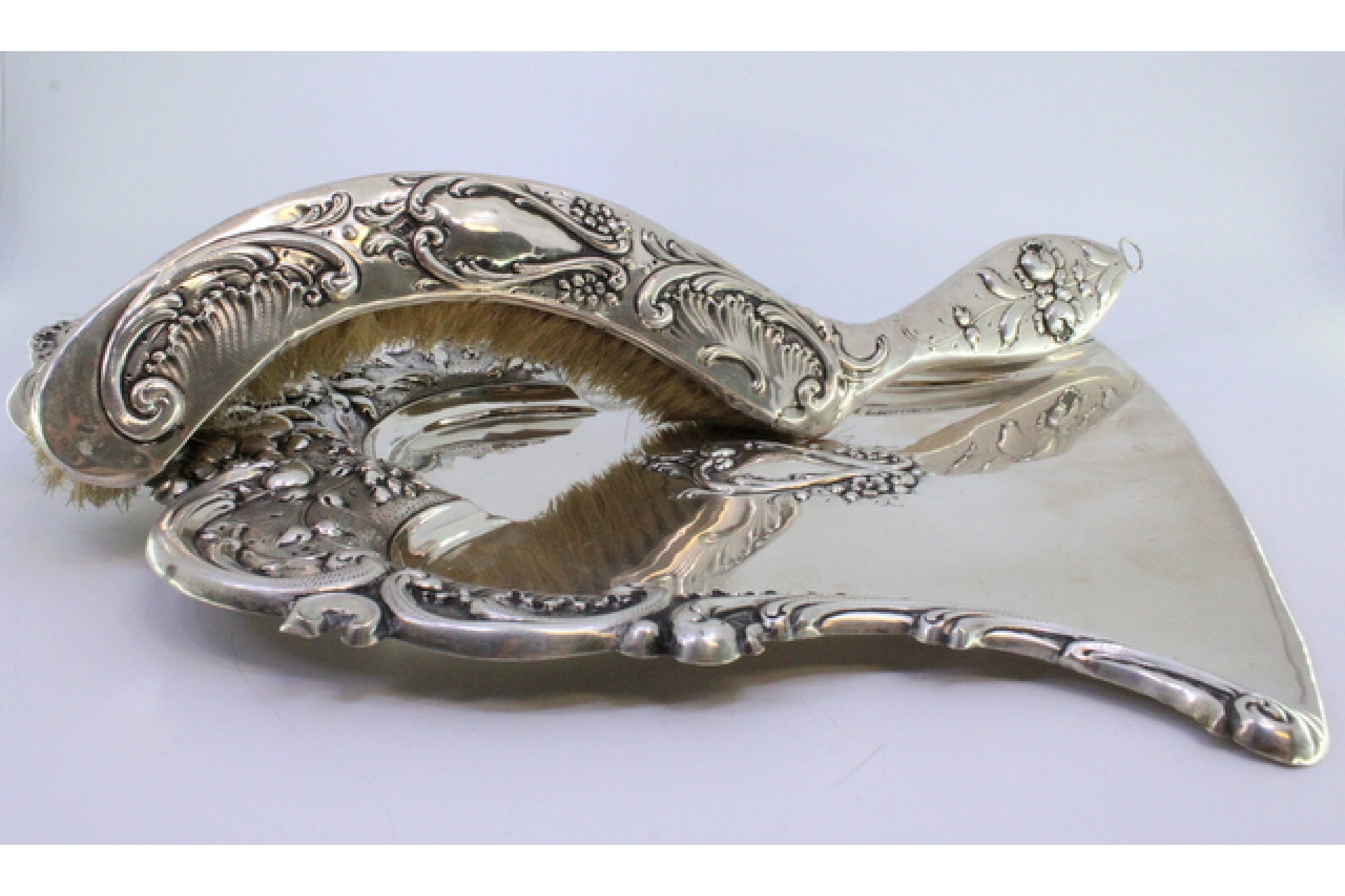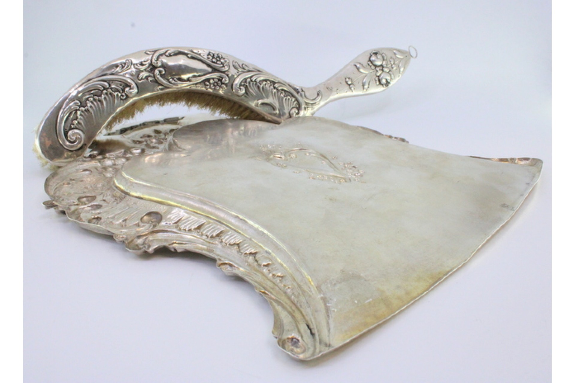 Apanha migalhas e escova em prata com flores e volutas relevadas envolvendo cartela para monograma.