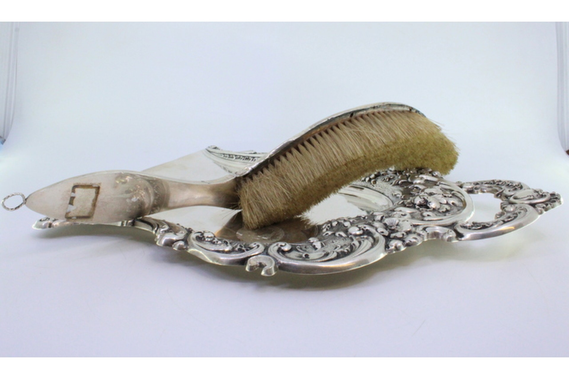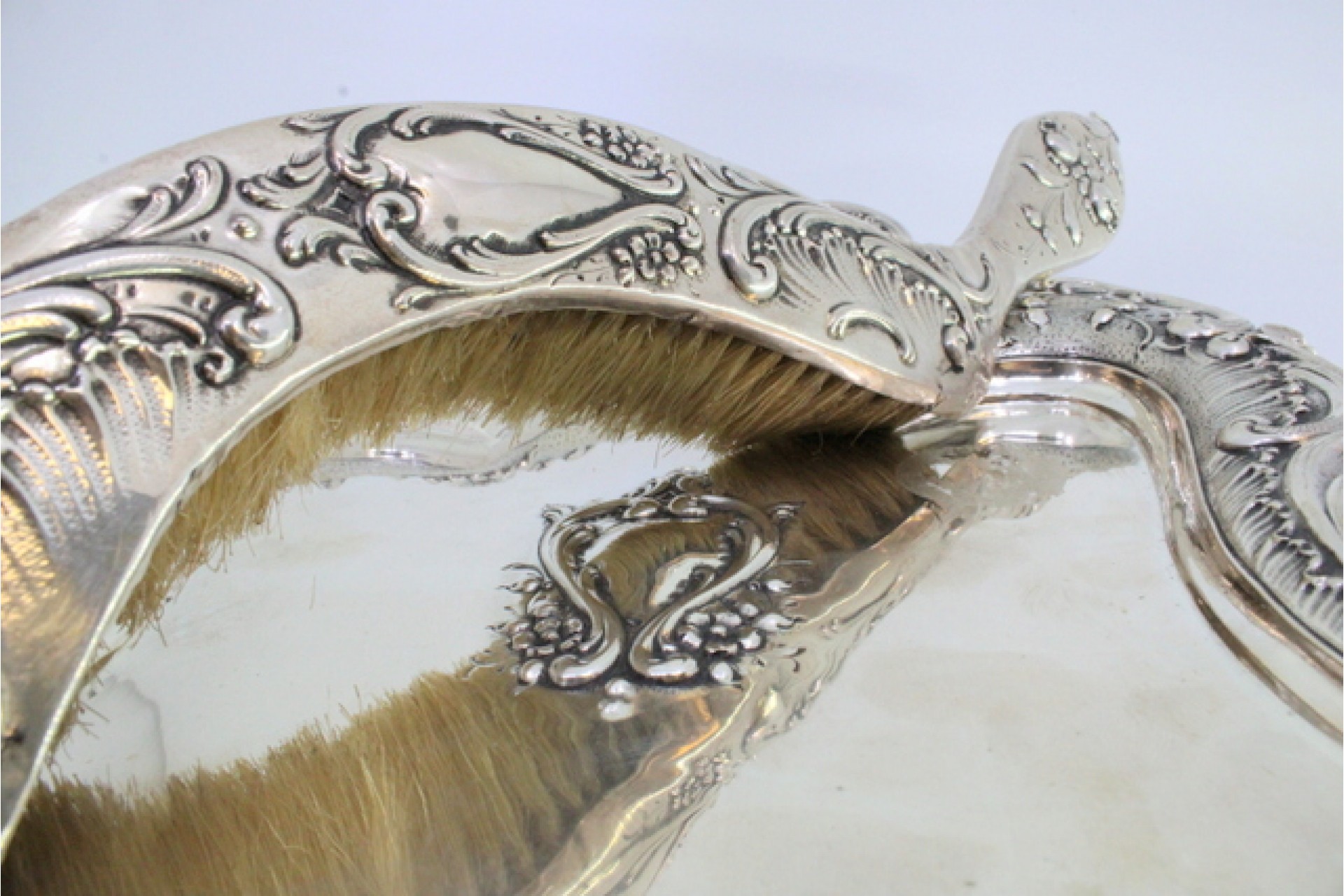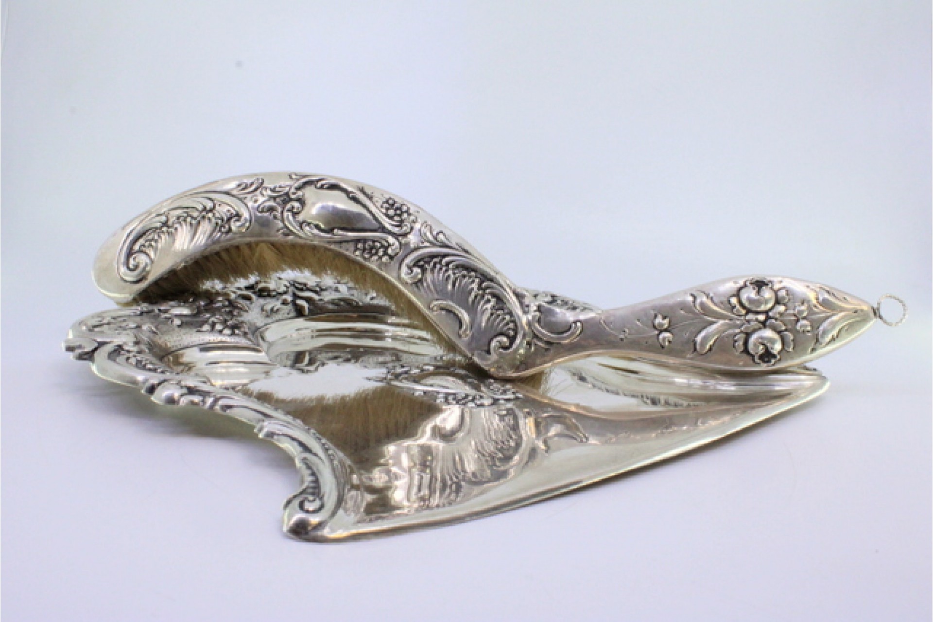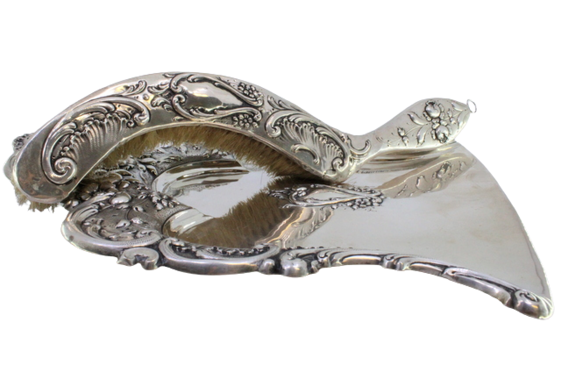 Apanha migalhas e escova em prata com flores e volutas relevadas envolvendo cartela para monograma.