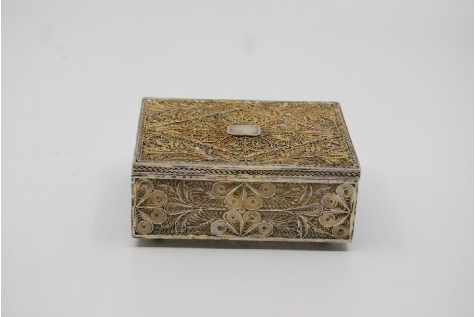 • Descrição: Guarda joias em prata de filigrana dourada com tampa basculante.