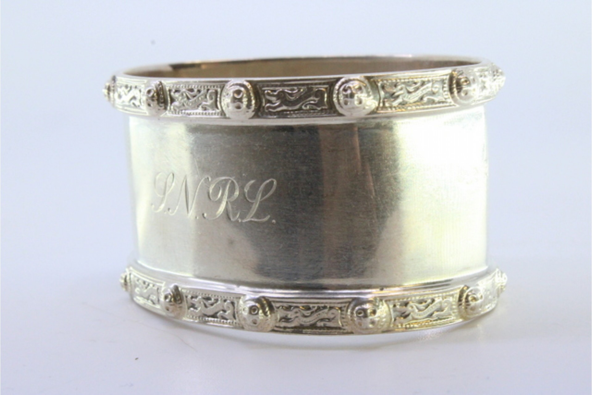 Etiquetas: Argola de guardanapo, Prata, Relevos, Monograma, Letras