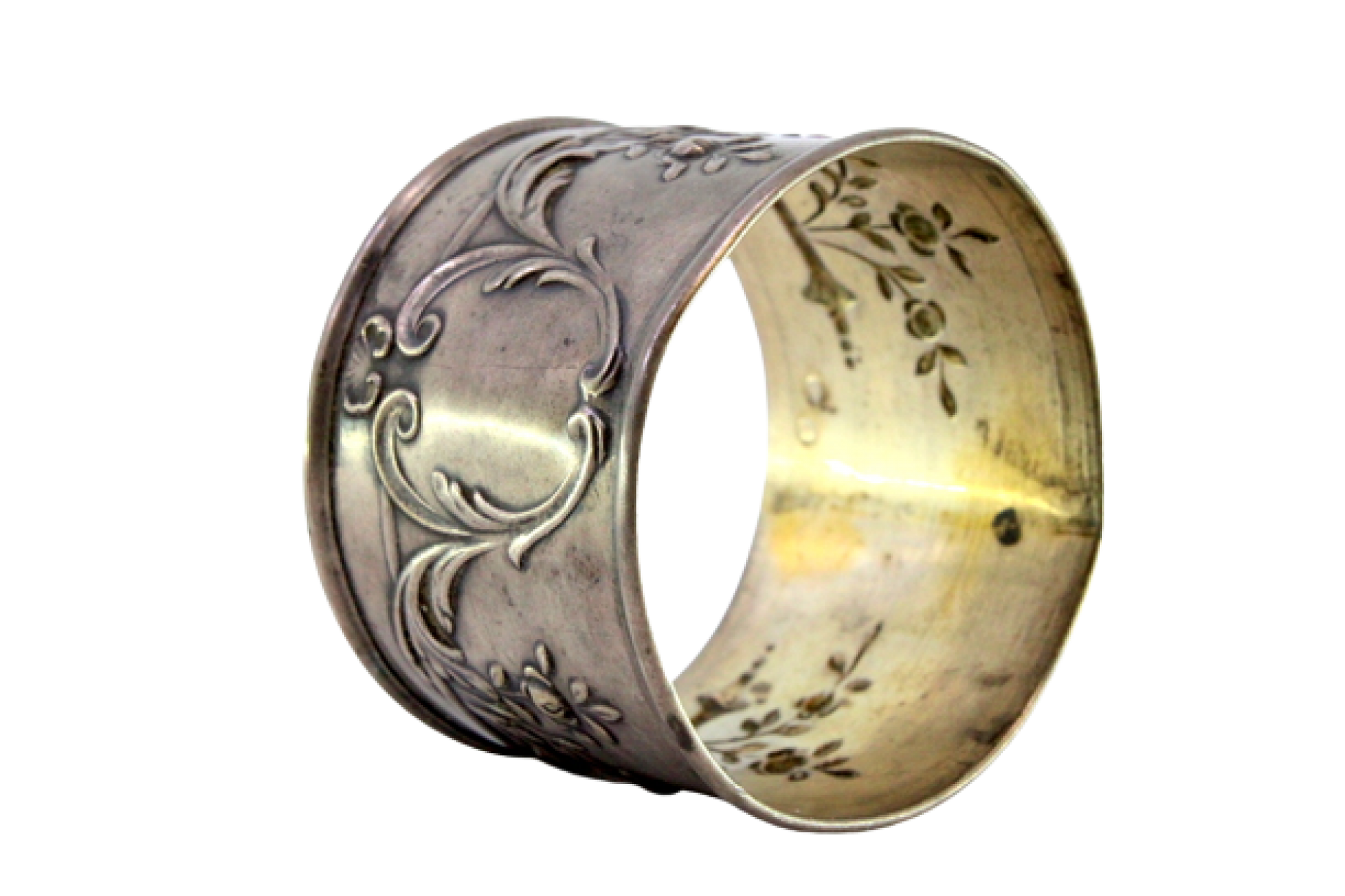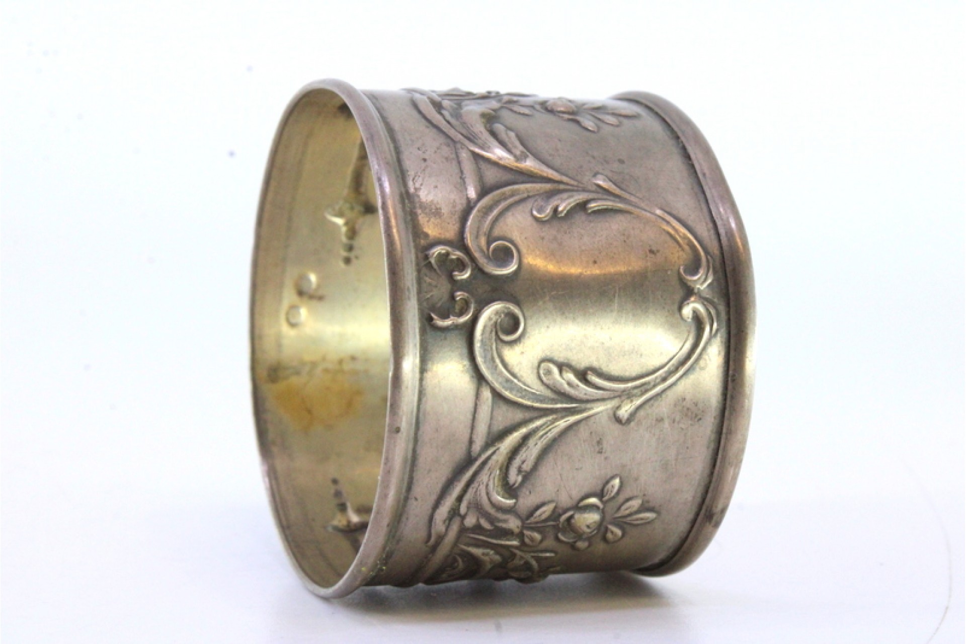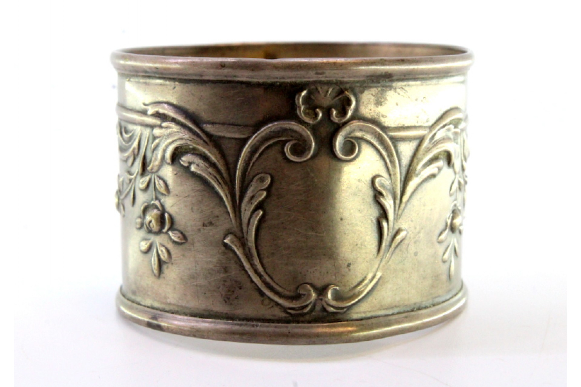 • Descrição: Argola de guardanapo em prata ao estilo Arte Nova com motivos florais relevados e frisos envolventes.