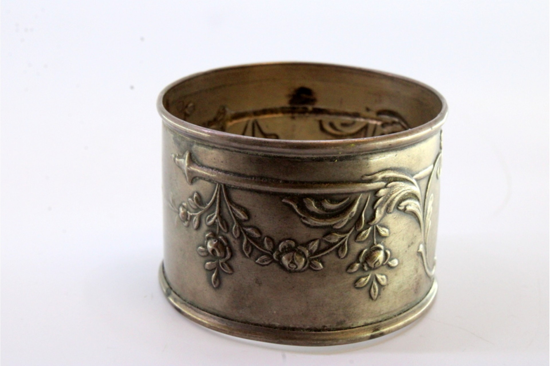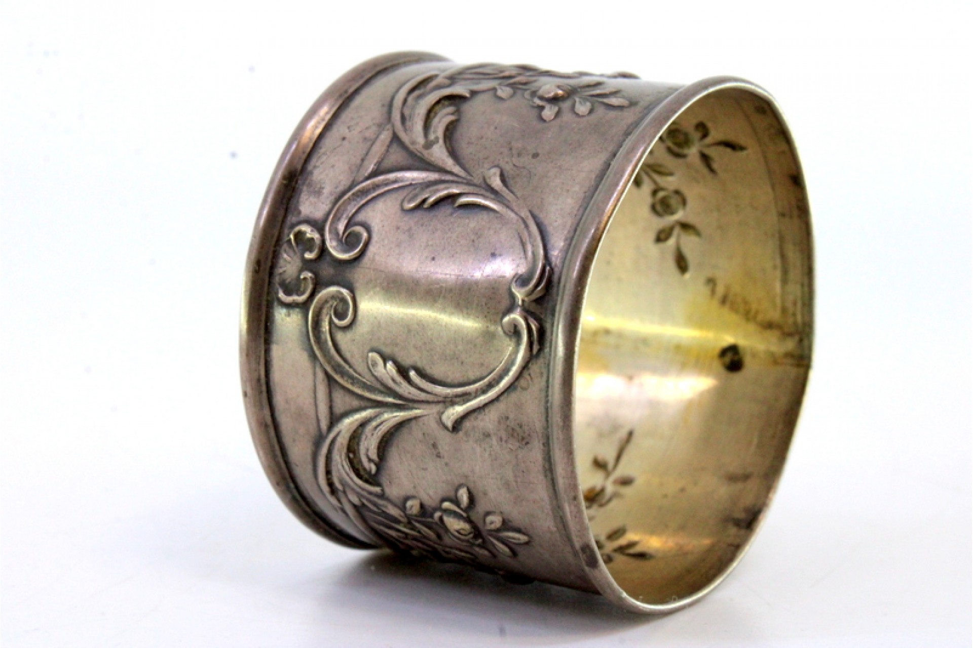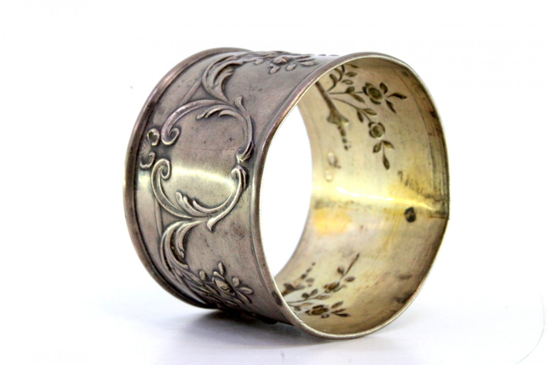 • Descrição: Argola de guardanapo em prata ao estilo Arte Nova com motivos florais relevados e frisos envolventes.