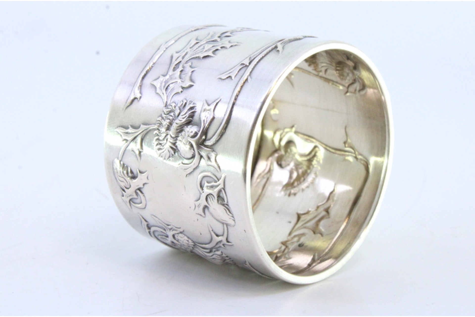 • Descrição: Argola de guardanapo em prata ao estilo Arte Nova com motivos florais relevados.