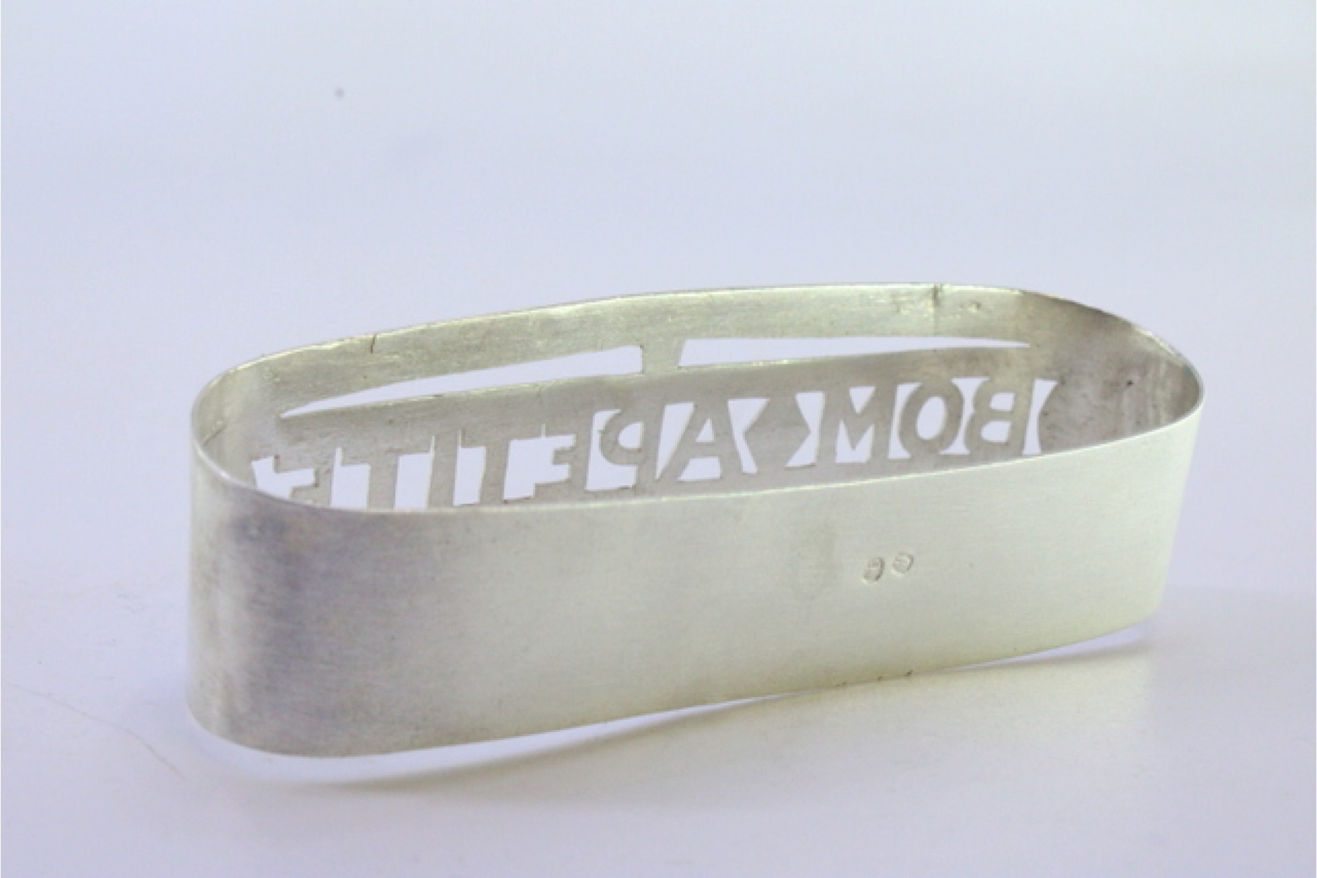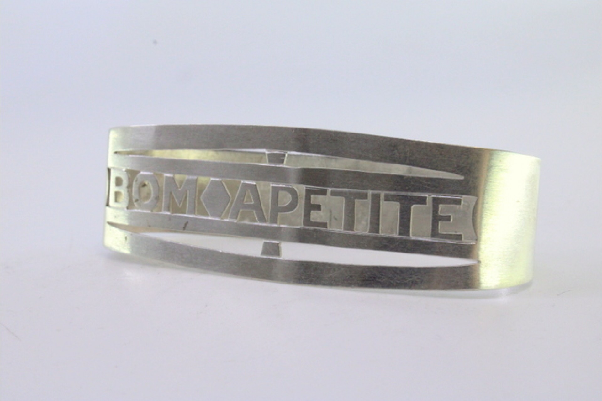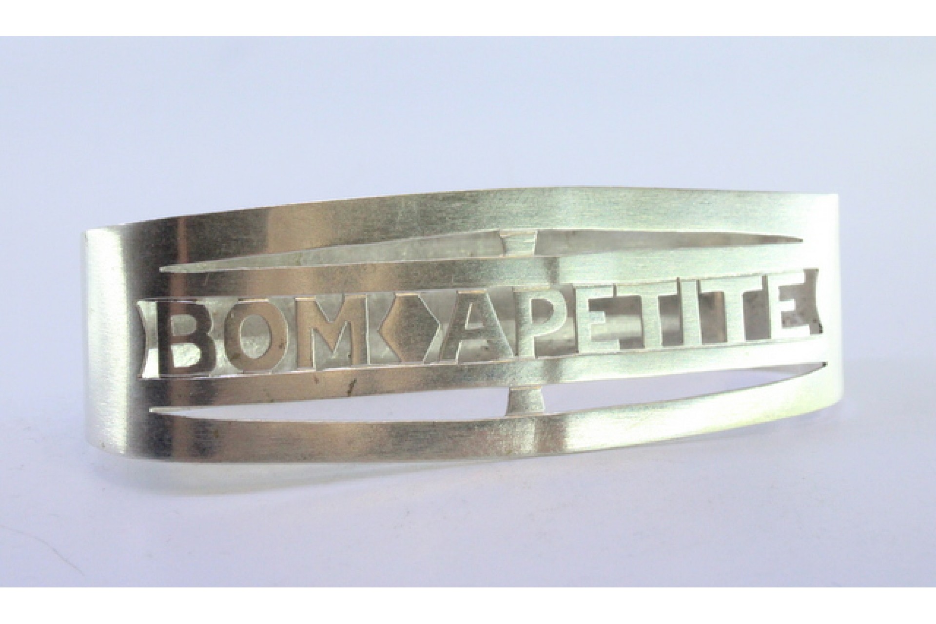 Argola de guardanapo em prata arredondada com letras recortadas "BOM APETITE".