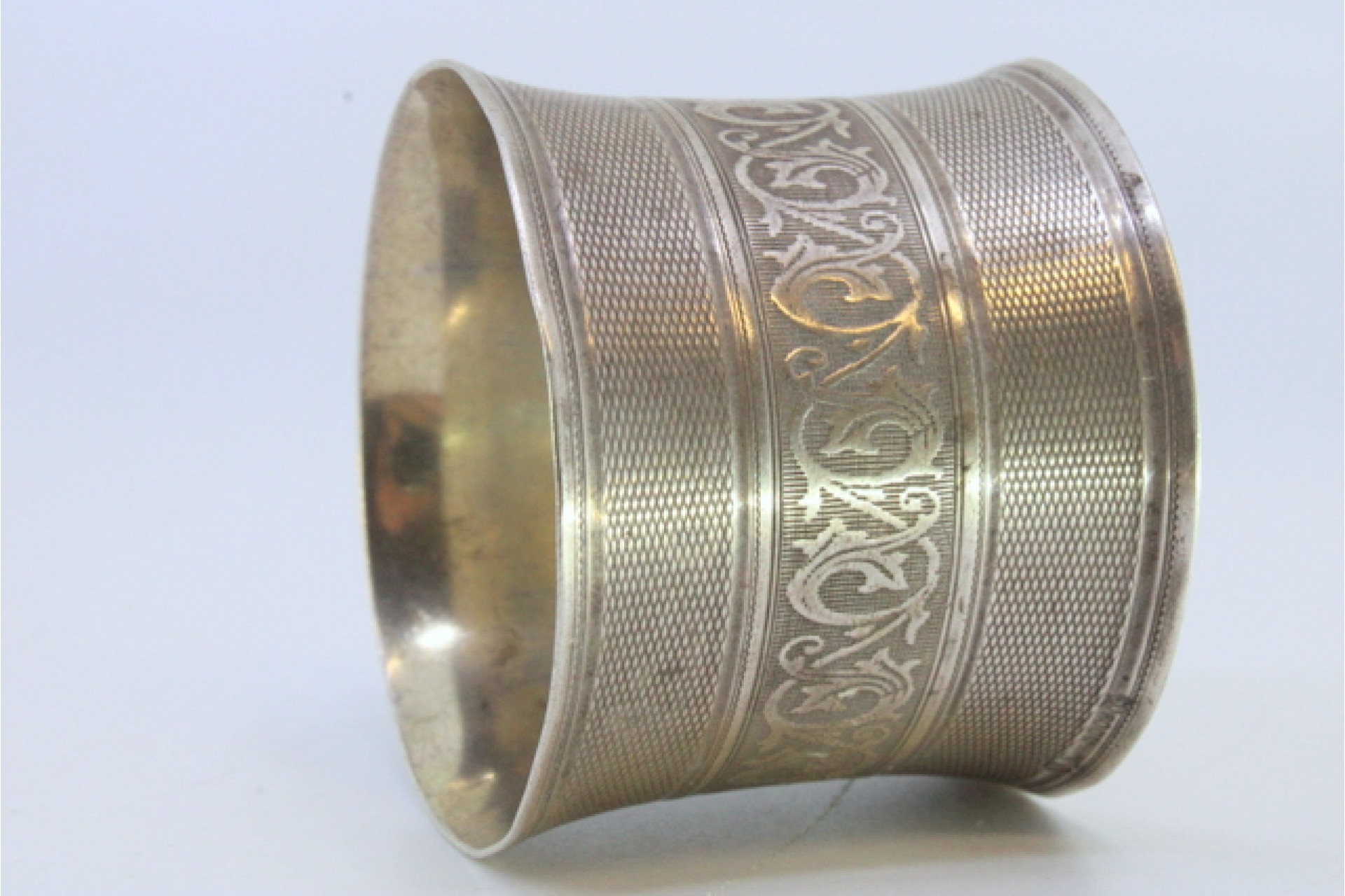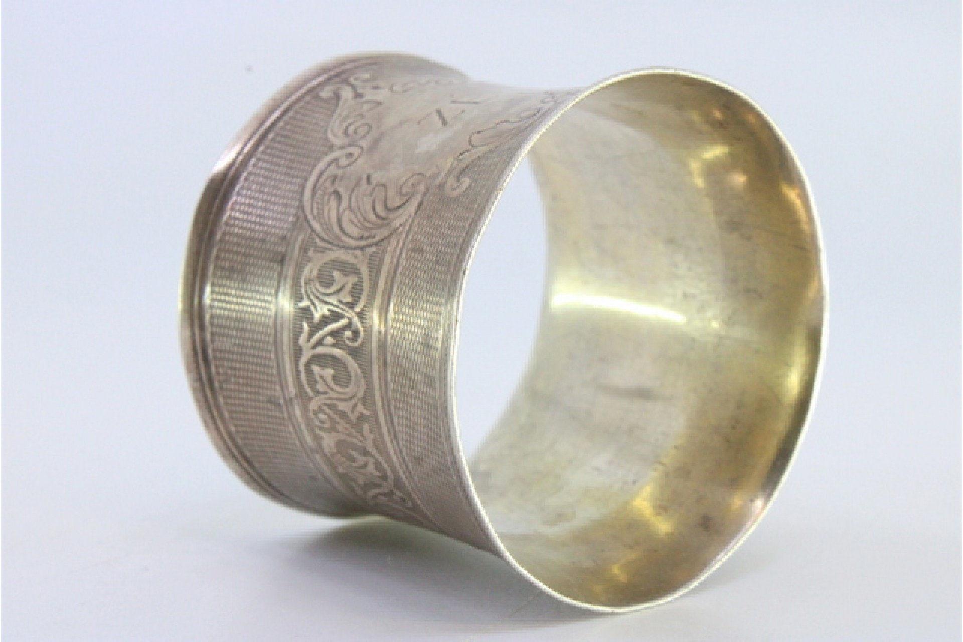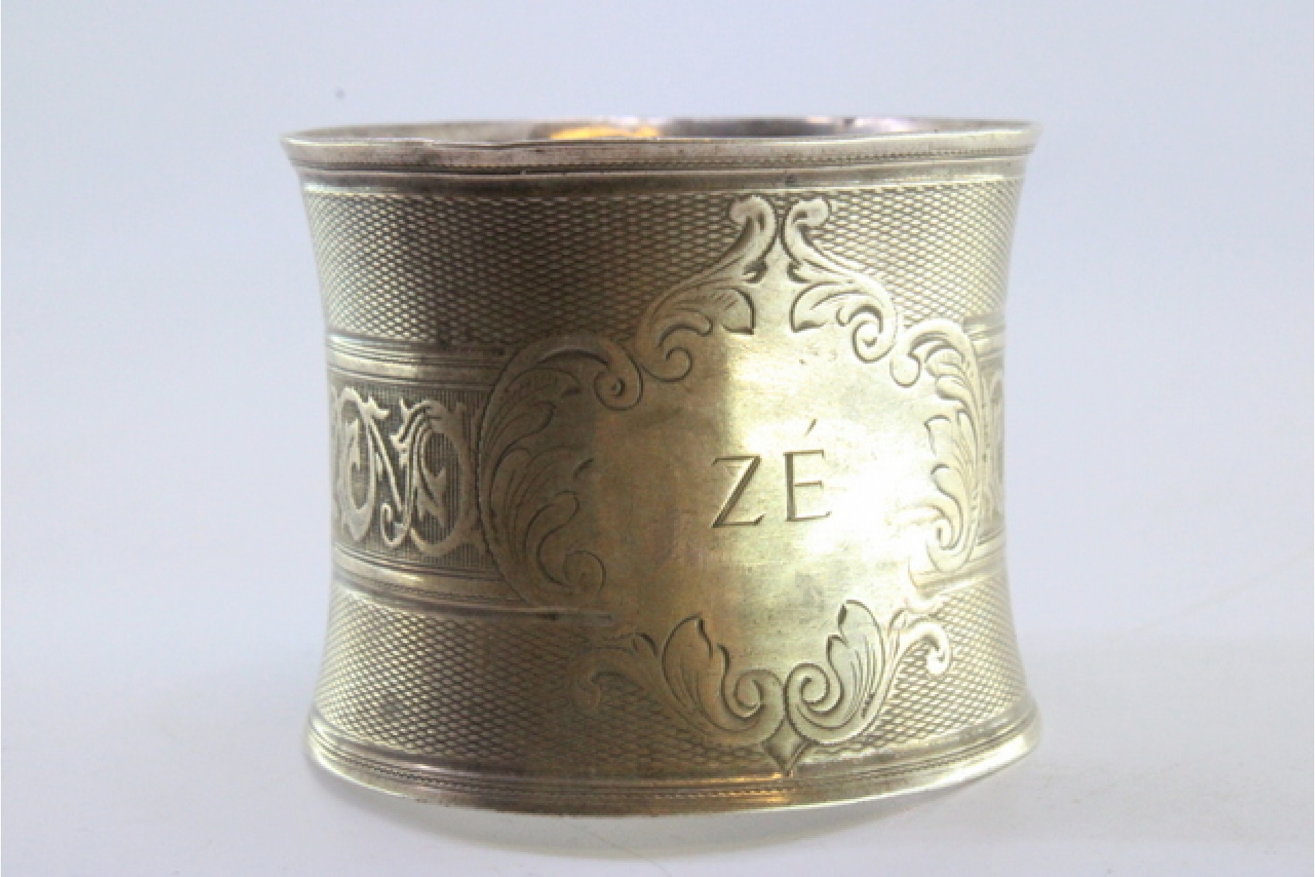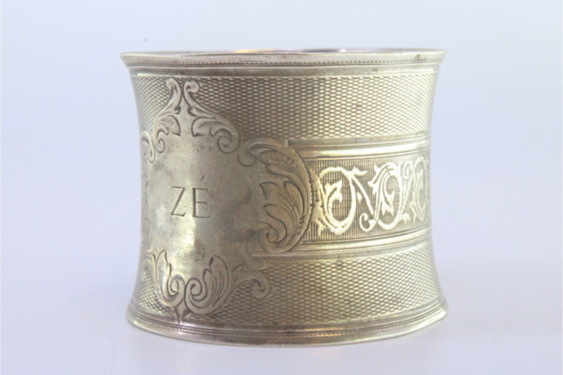 • Descrição: Argola de guardanapo em prata guilhochada com frisos gravados envolvendo cartela para monograma.