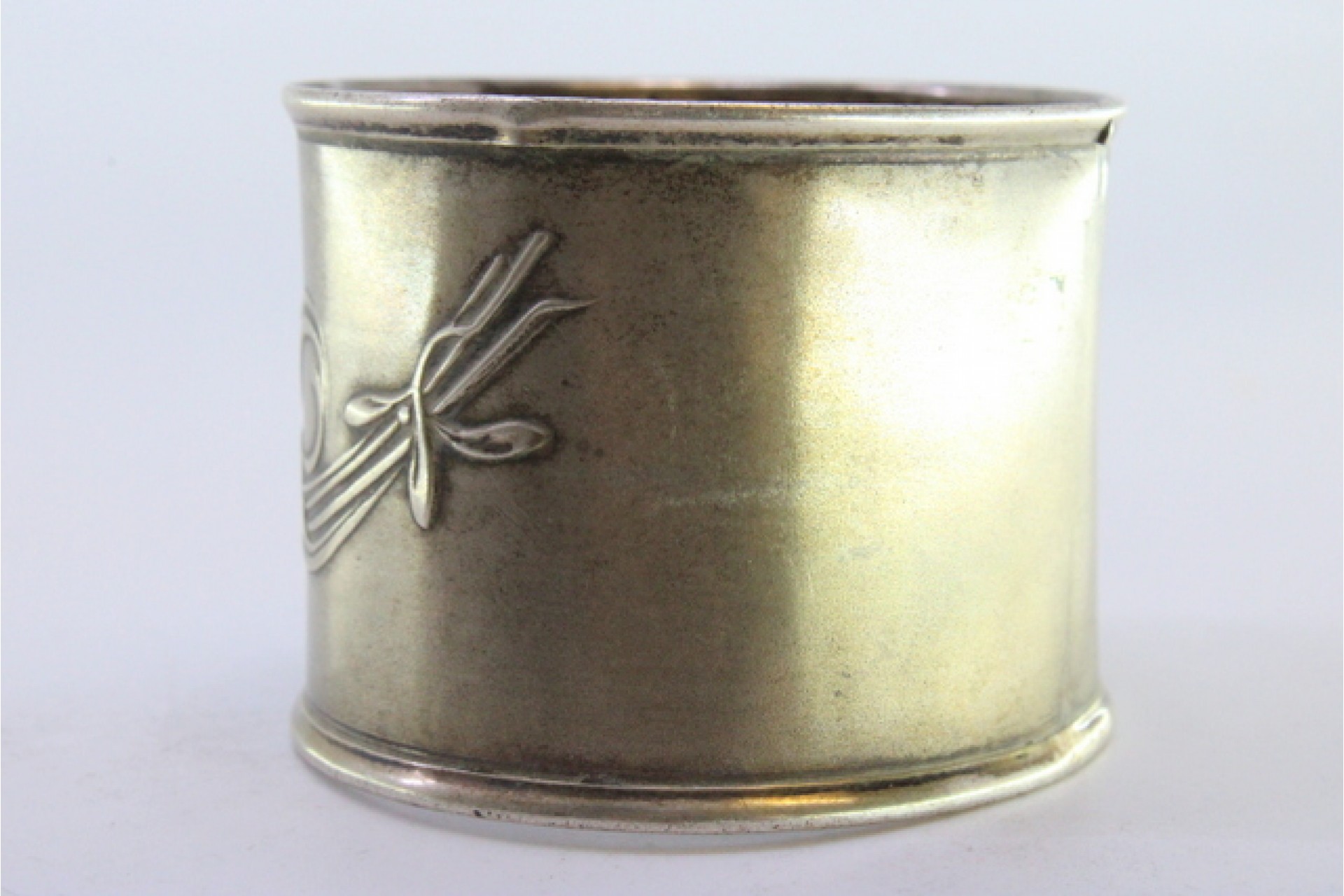 Argola de guardanapo em prata com motivos florais relevados  e friso na envolvência.