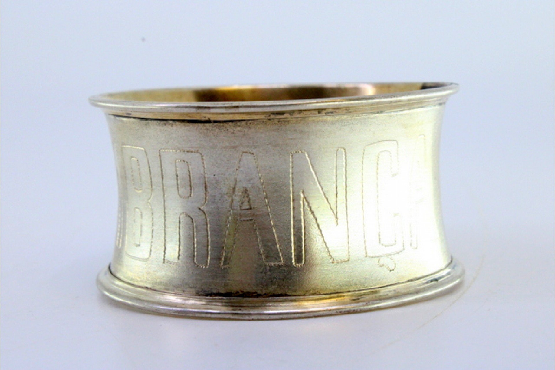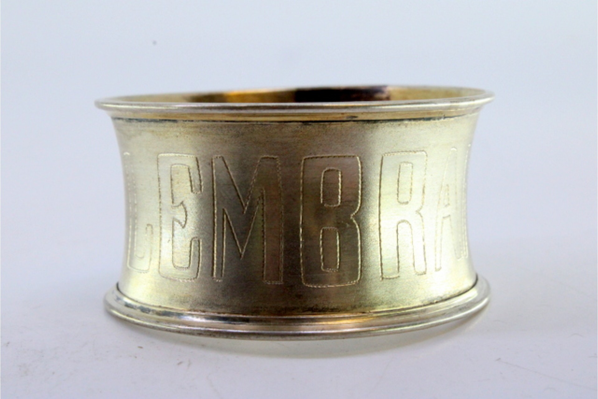 • Descrição: Argola de guardanapo em prata com gravados "LEMBRANÇA" e cartela para monograma.