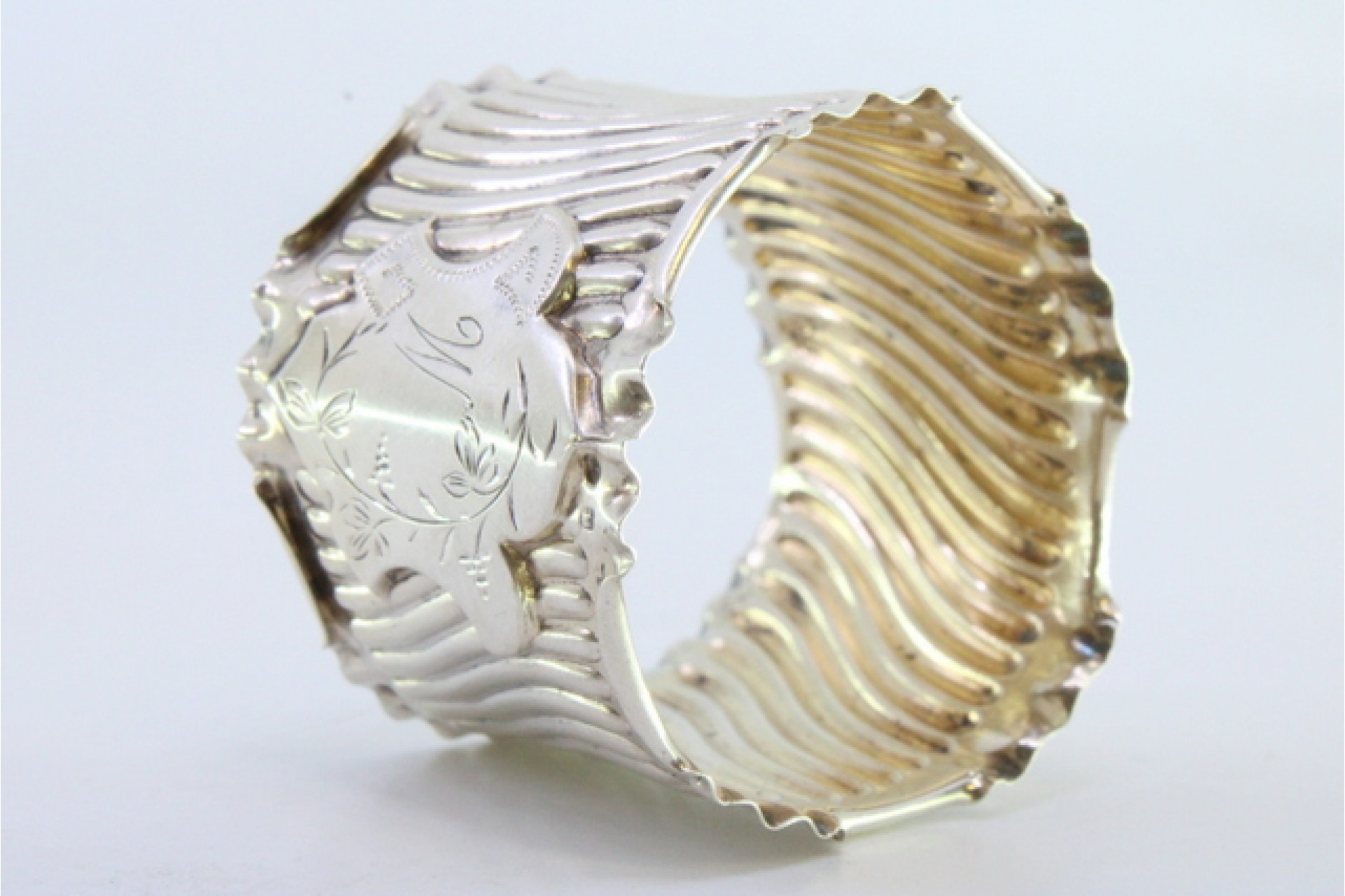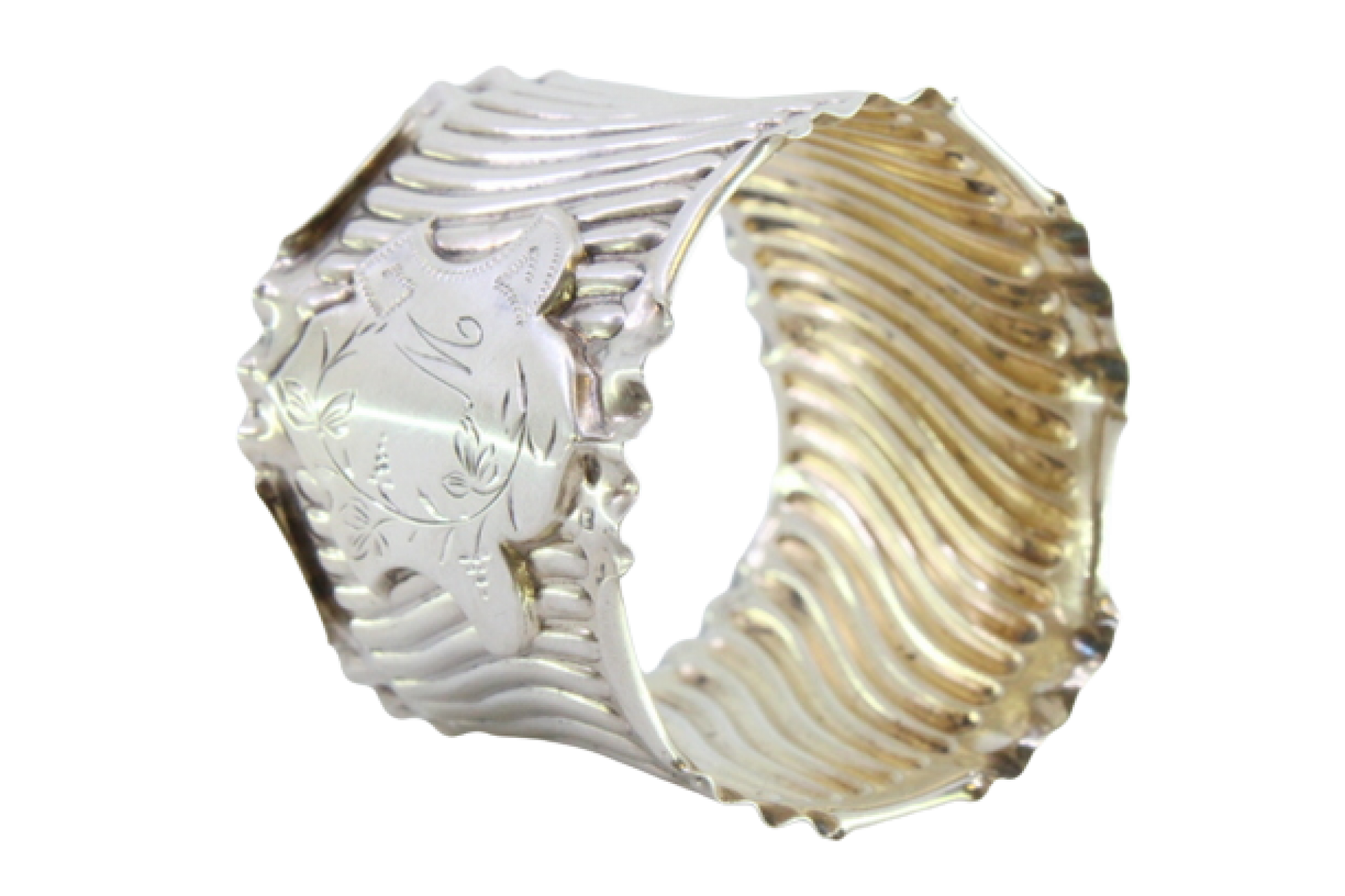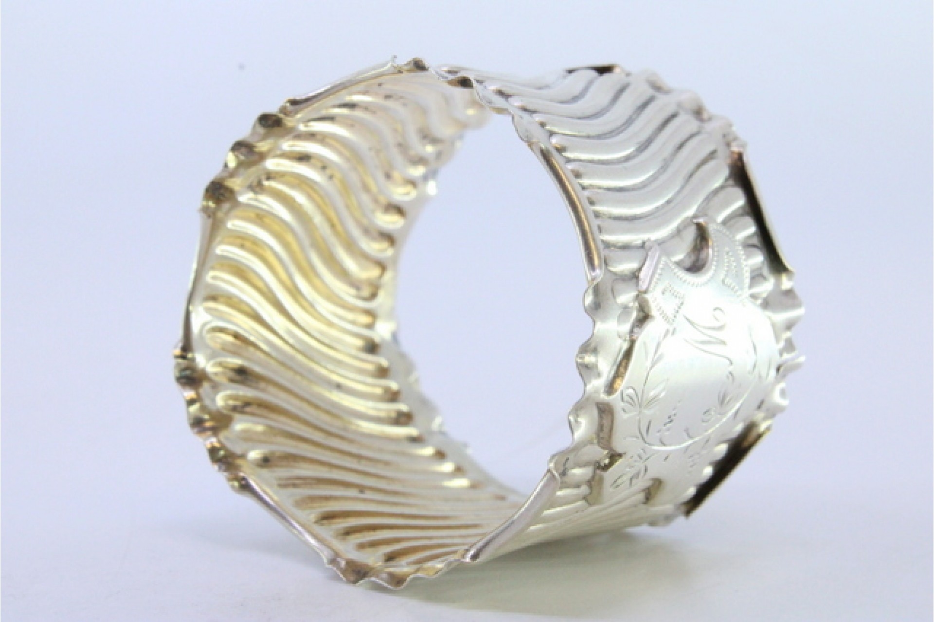 Argola de guardanapo em prata com relevos canelados e recortados com cartela para monograma.