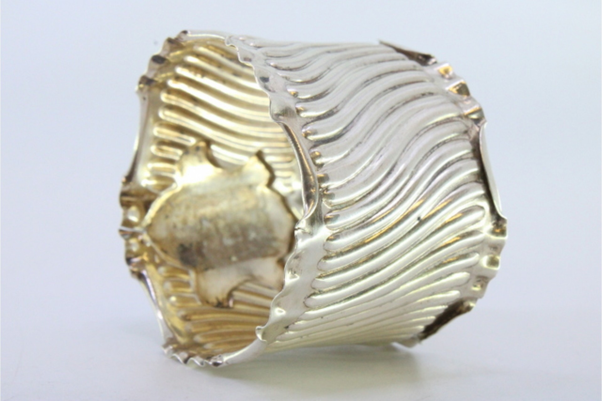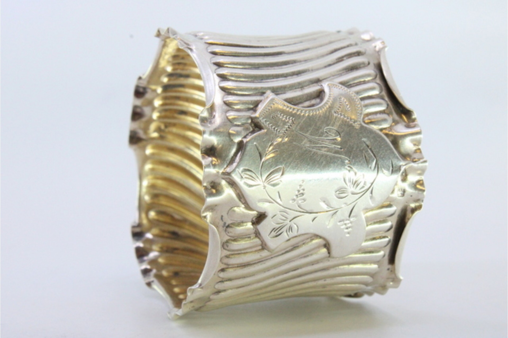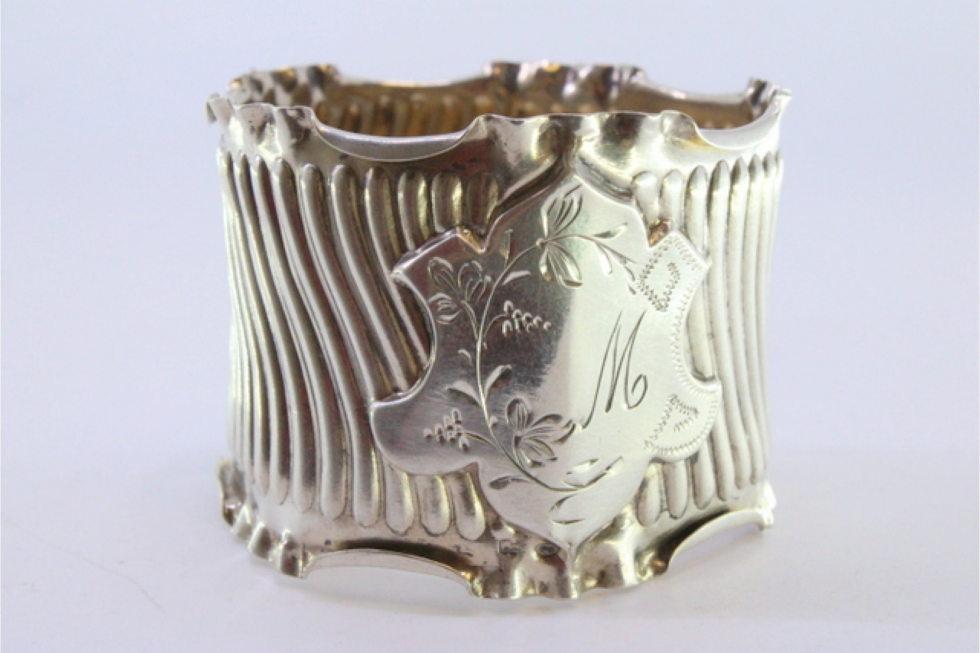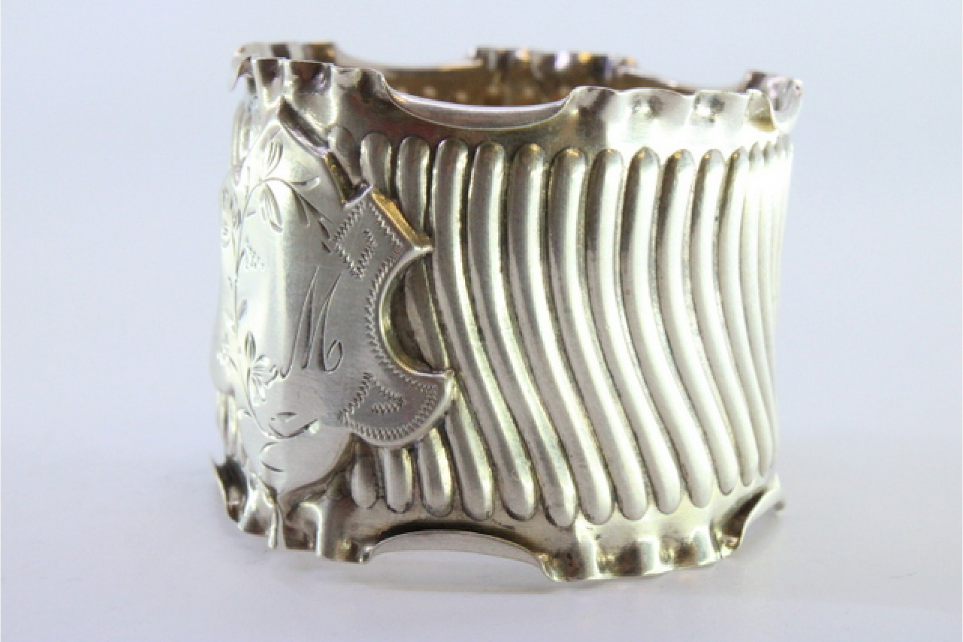 Argola de guardanapo em prata com relevos canelados e recortados com cartela para monograma.
