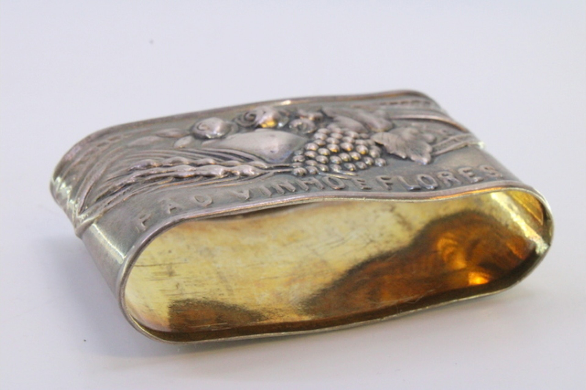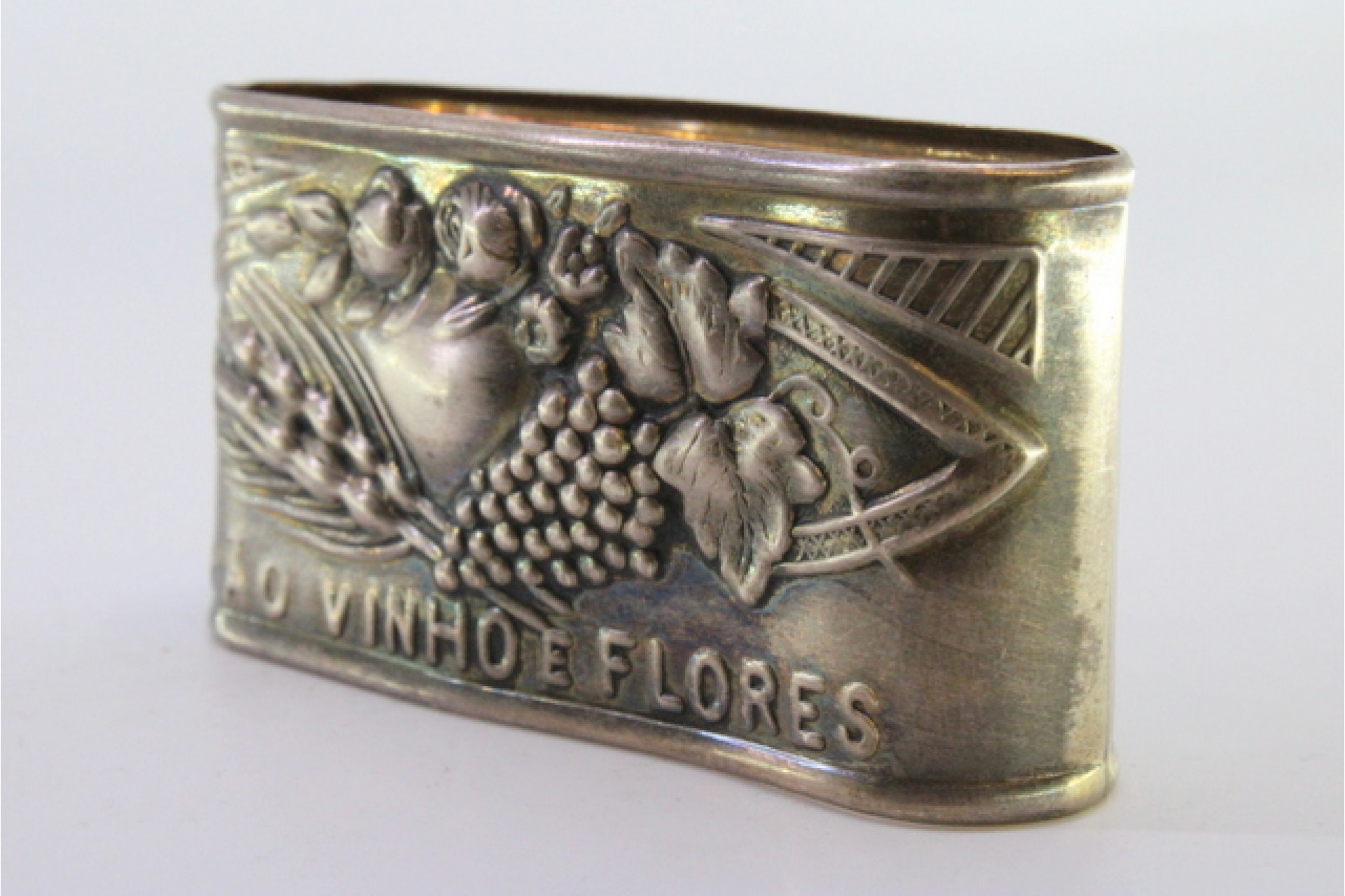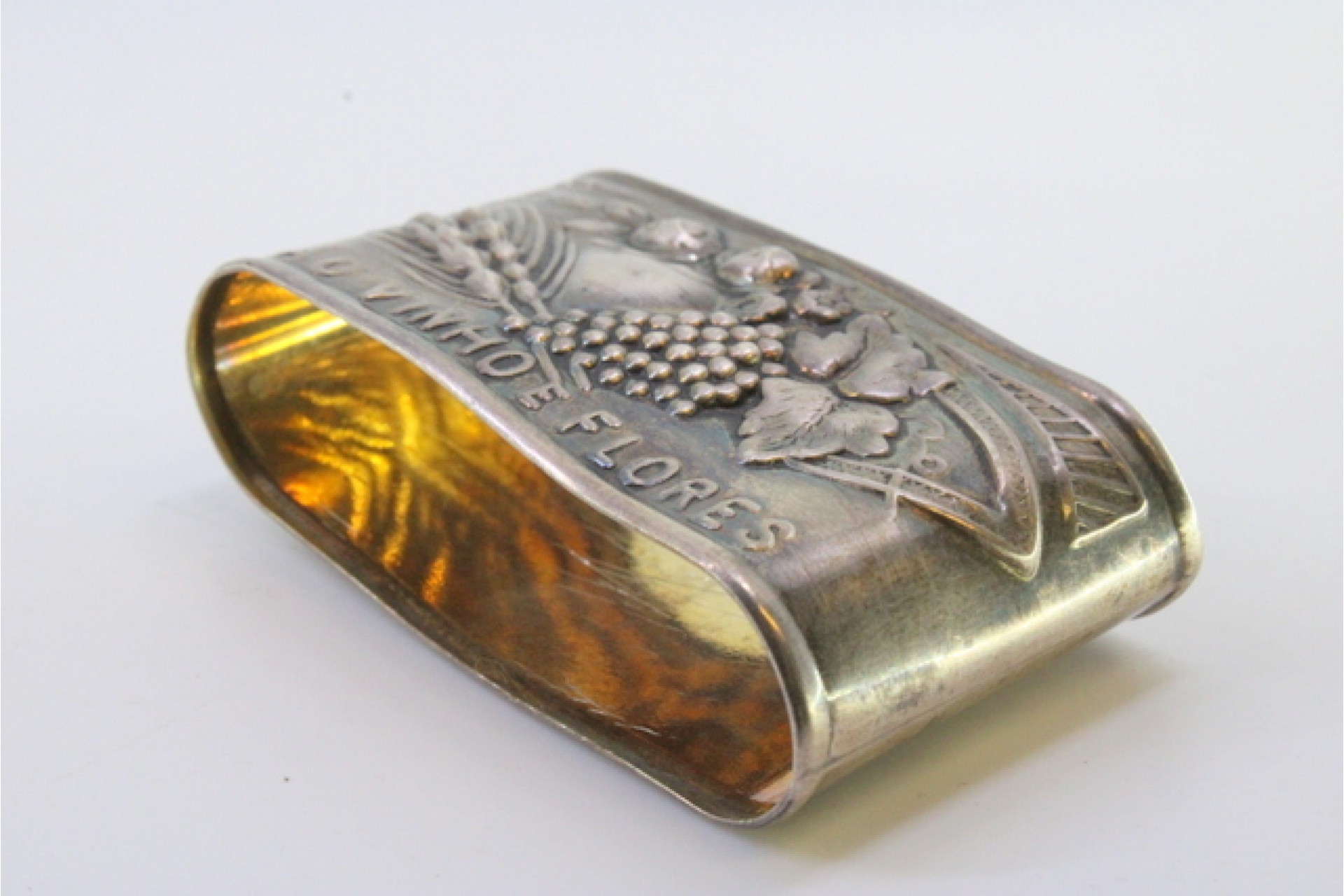 • Descrição: Argola de guardanapo em prata com relevos de fruta e gravados "PÃO - VINHO - FLORES".