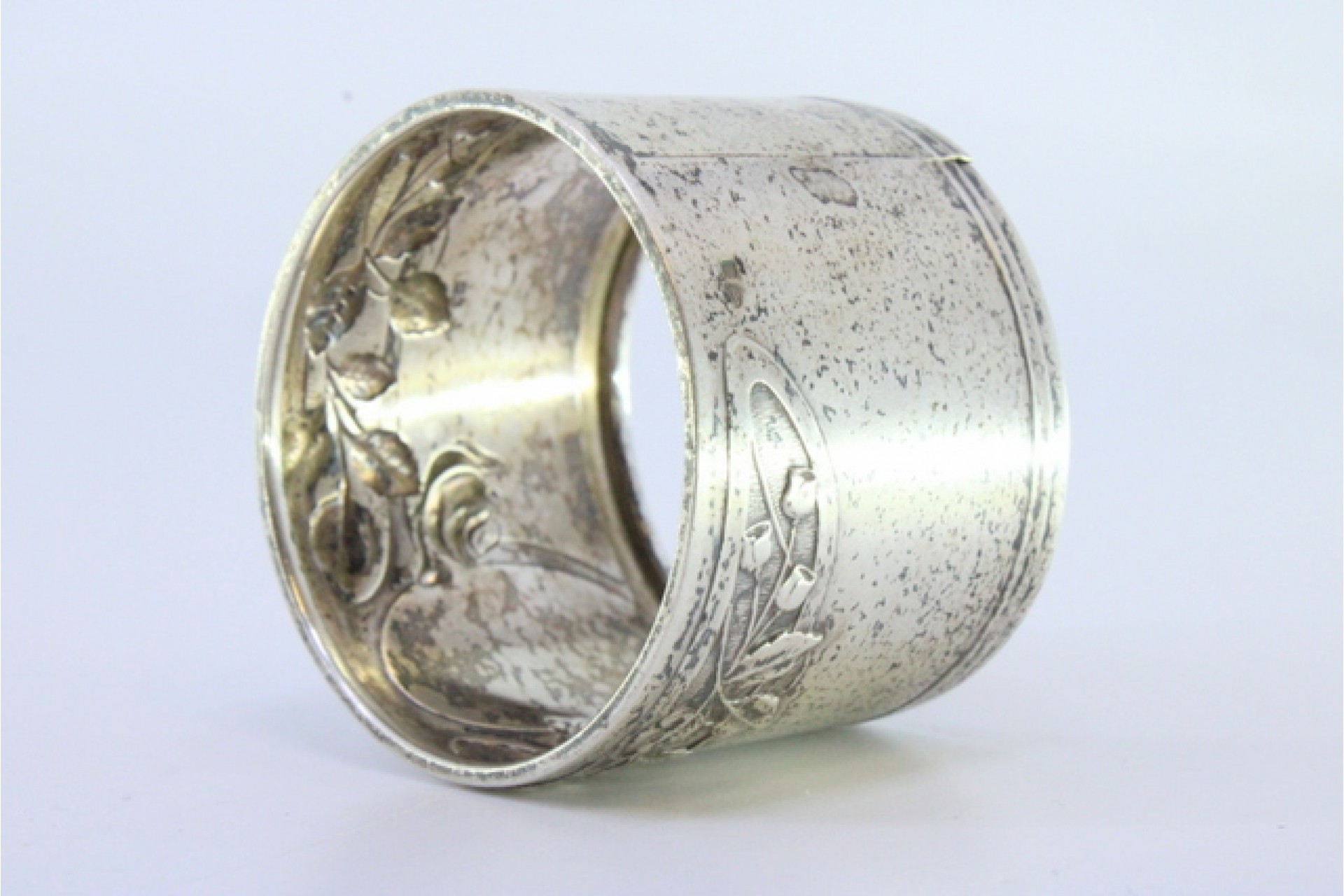 • Descrição: Argola de guardanapo em prata com relevos florais envolvendo cartela para monograma.