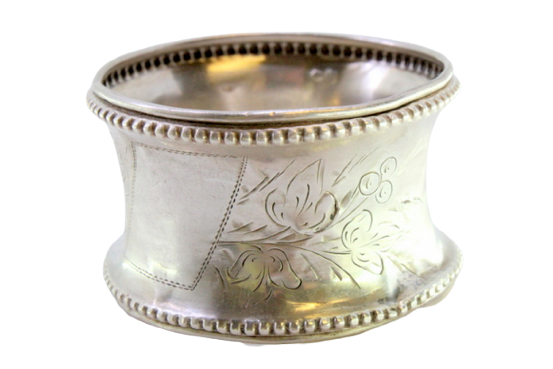 • Descrição: Argola de guardanapo em prata com gravados envolvendo brasão para monograma e frisos perlados na envolvência.