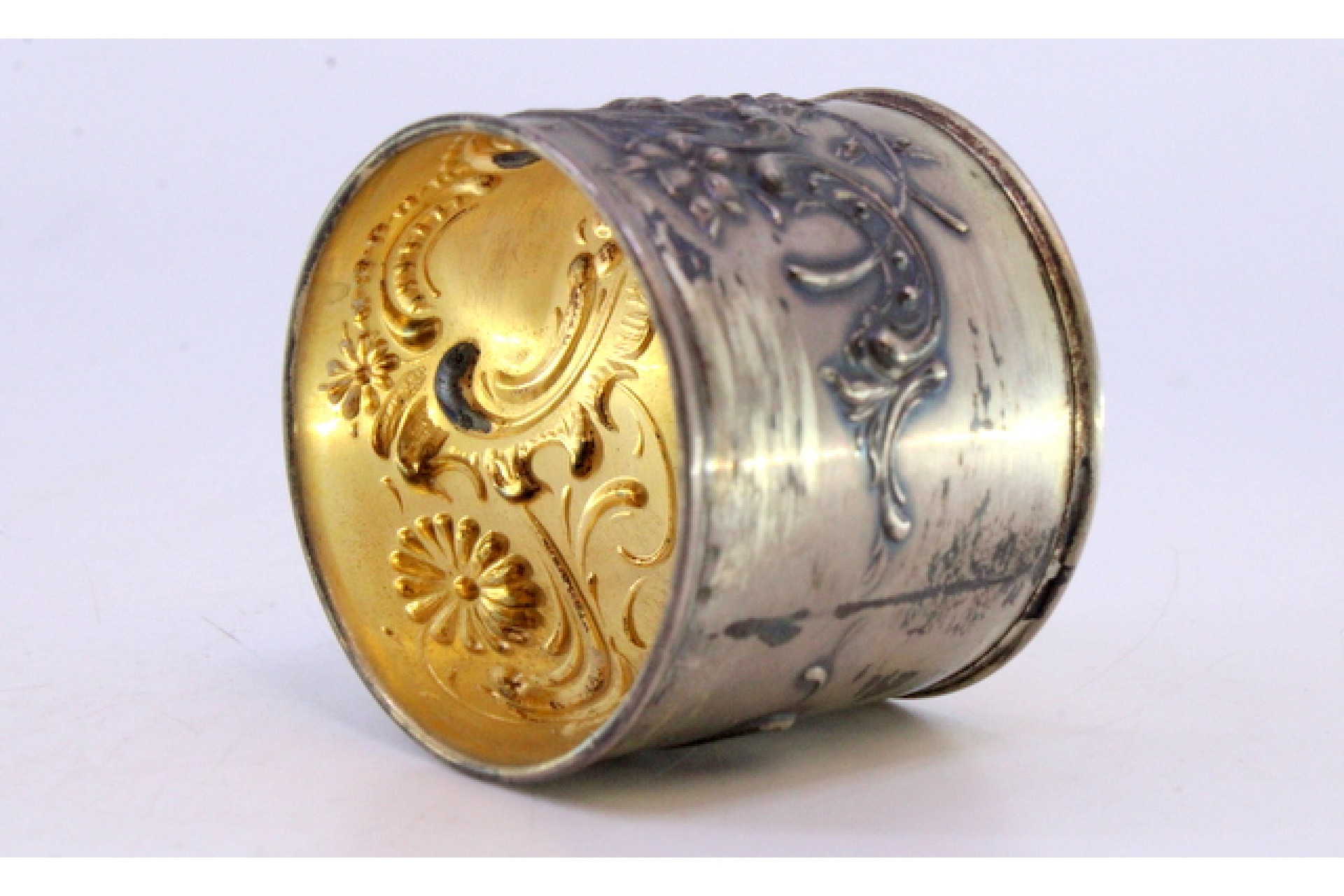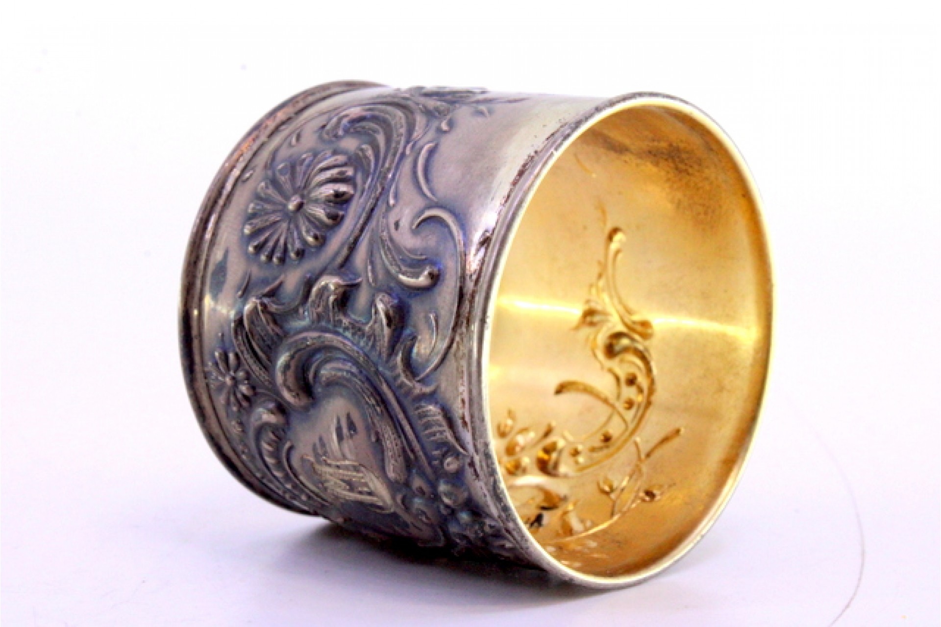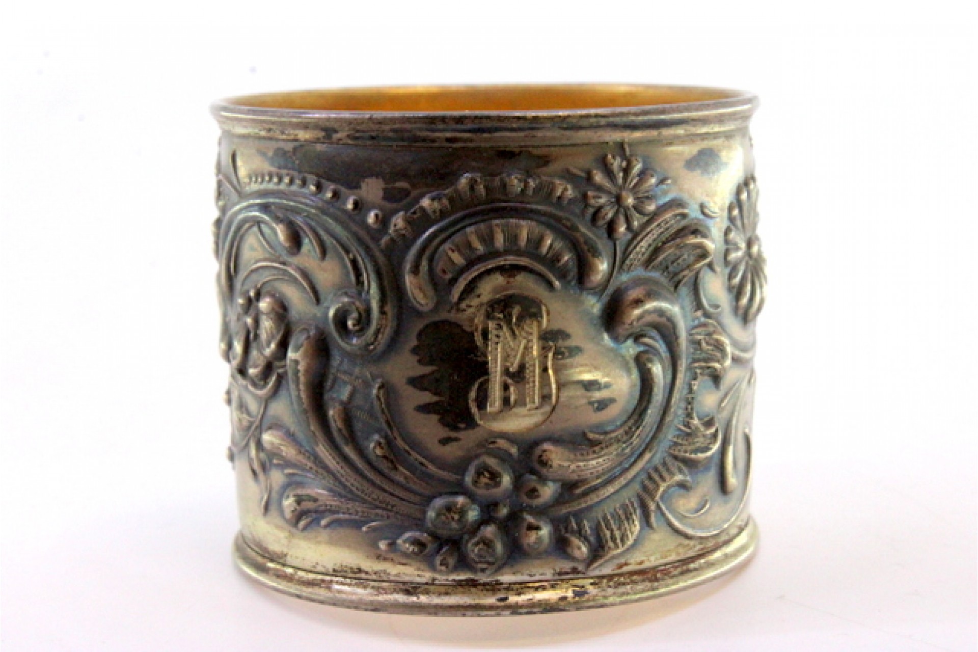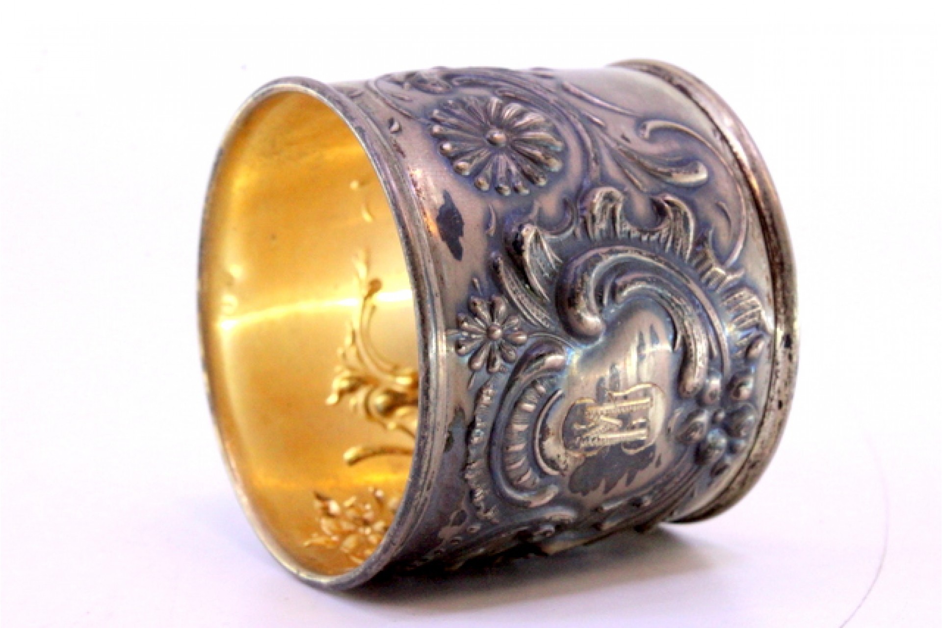 • Descrição: Argola de guardanapo em prata relevada com motivos florais e volutas envolvendo cartela para monograma.