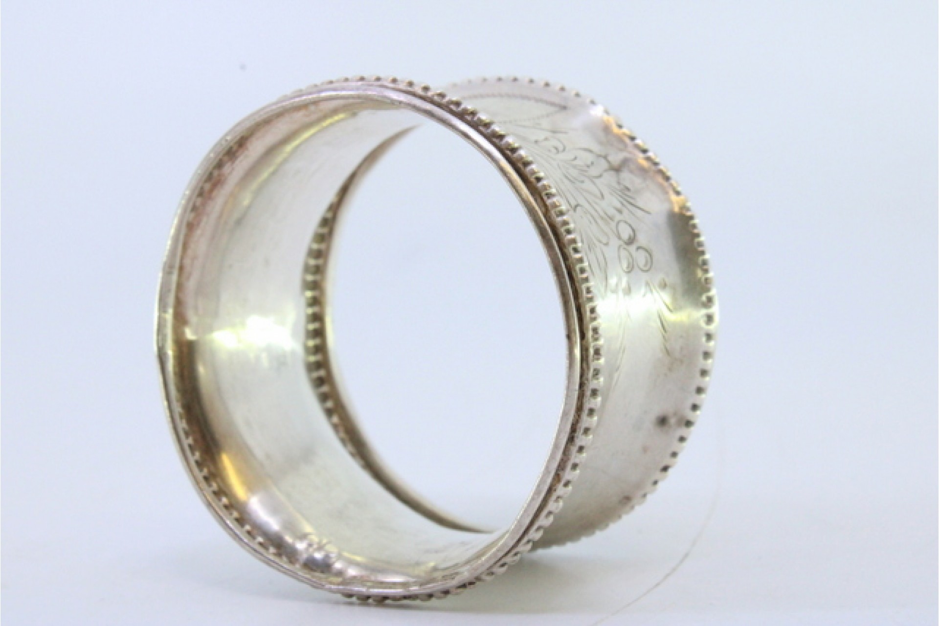 • Descrição: Argola de guardanapo em prata lisa com frisos perlados e gravados envolvendo cartela para monograma.