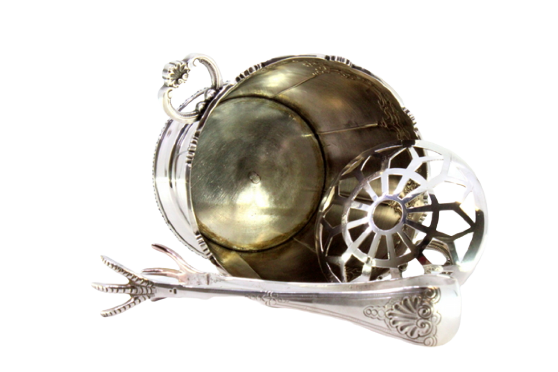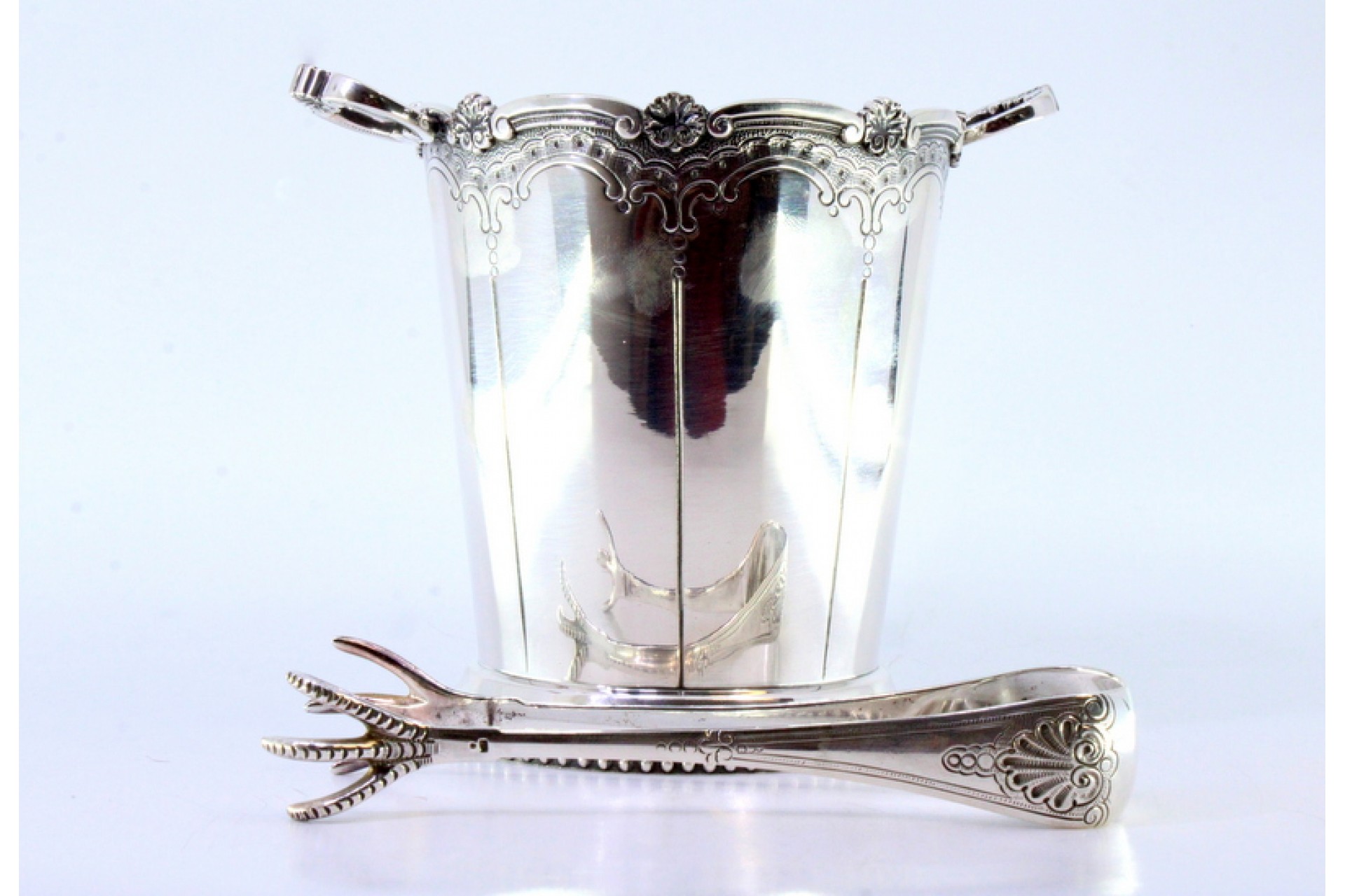 Balde de gelo com pinça em prata com duas pegas concheadas, base perlada e frisos ao alto.